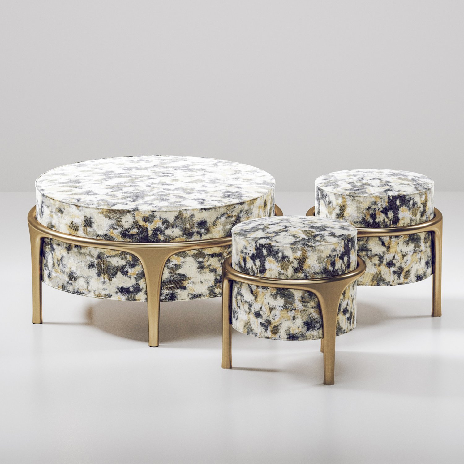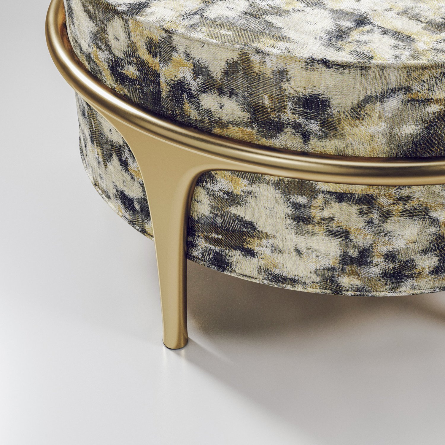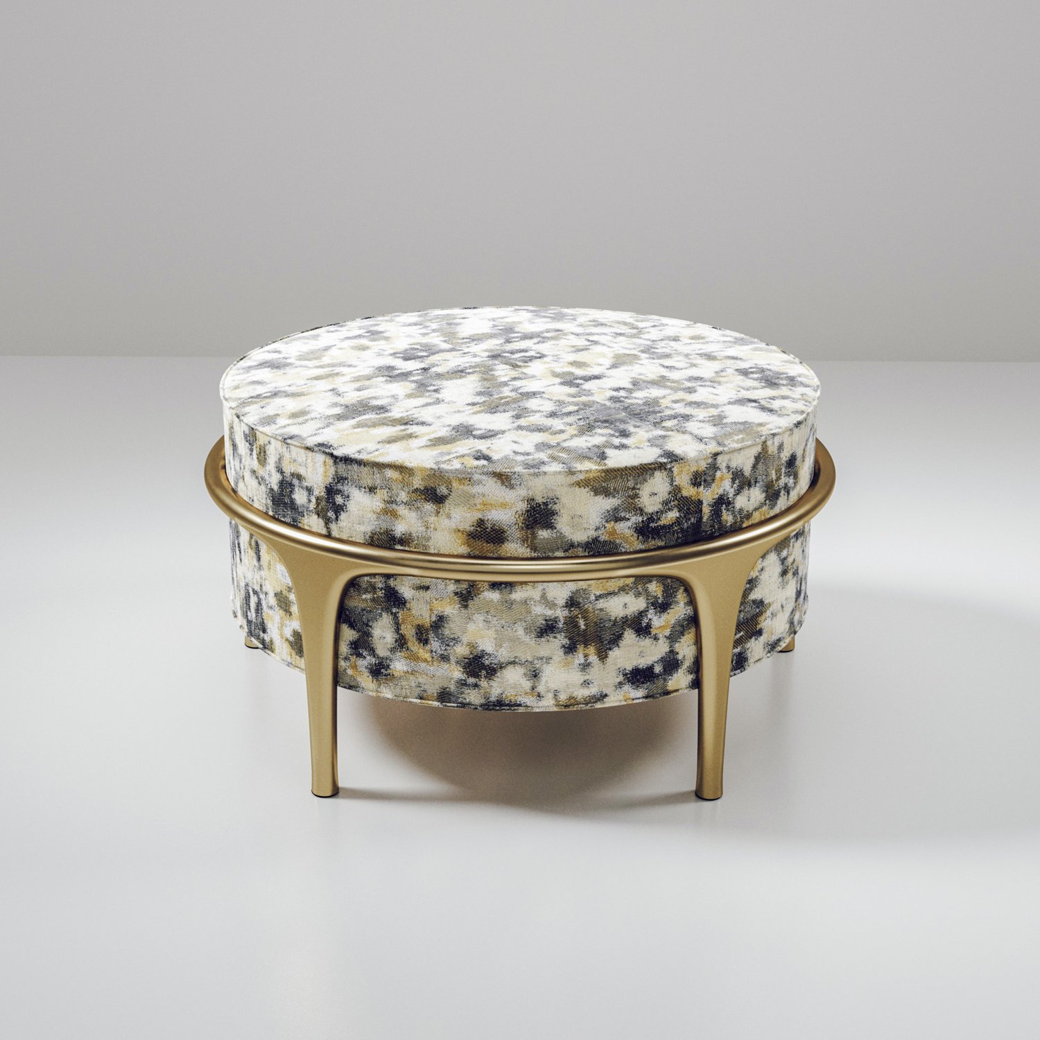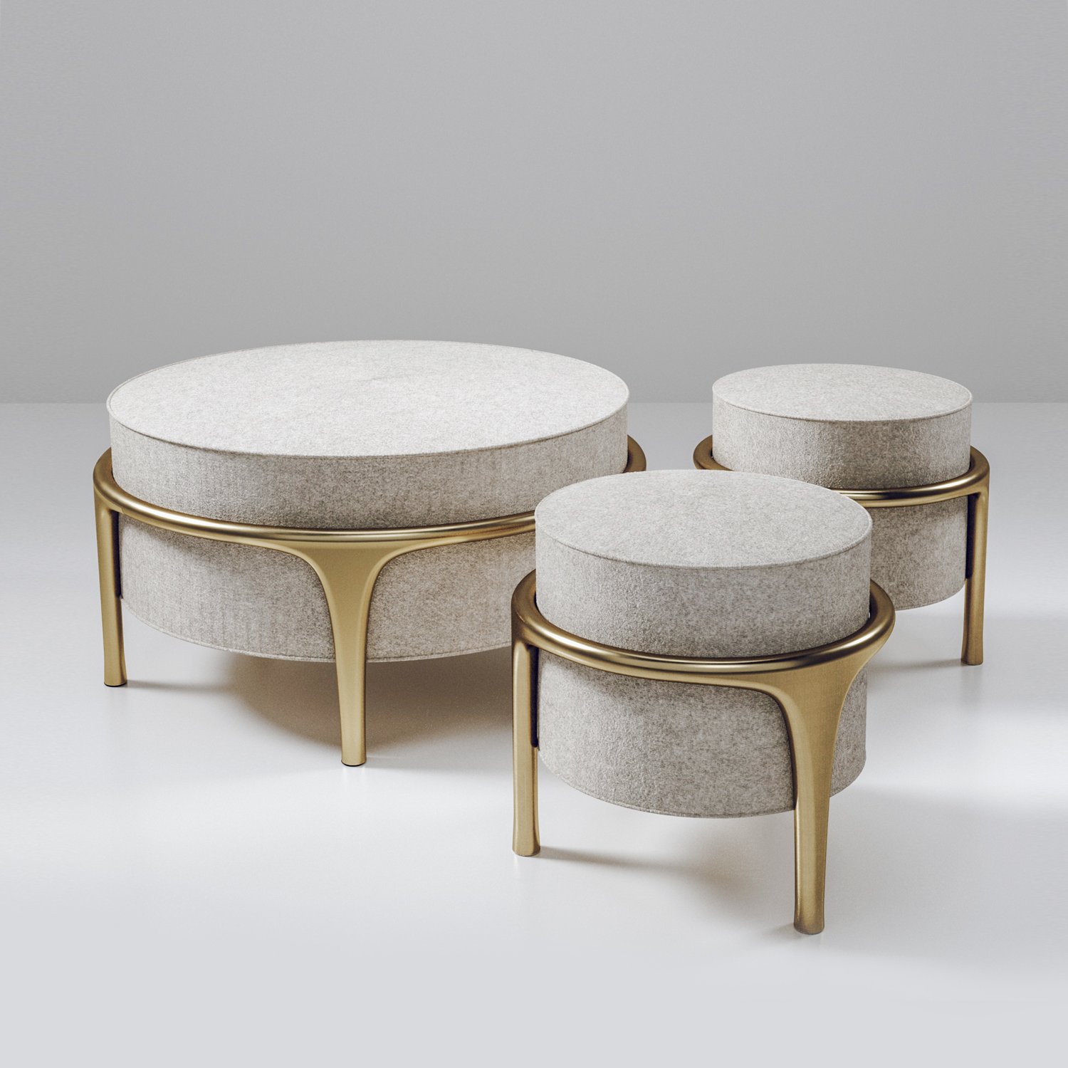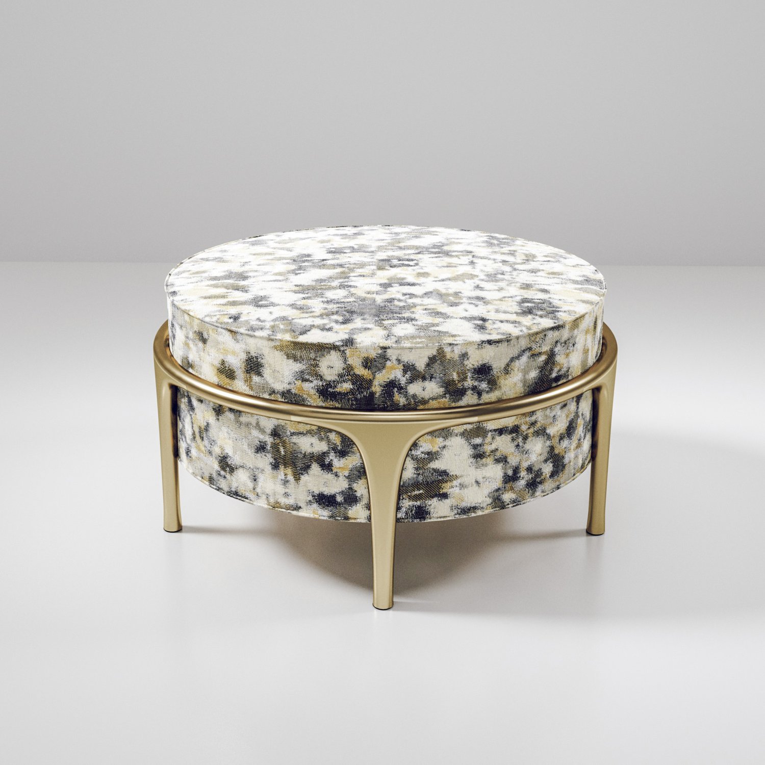 The Ramo ottoman by R & Y Augousti is an elegant and versatile piece. The upholstered piece in cream Pierre Frey fabric provides comfort while retaining a unique aesthetic with the bronze-patina brass frame and details. Part of the Ramo Seating Series.