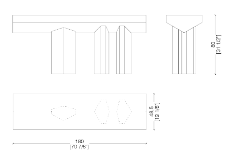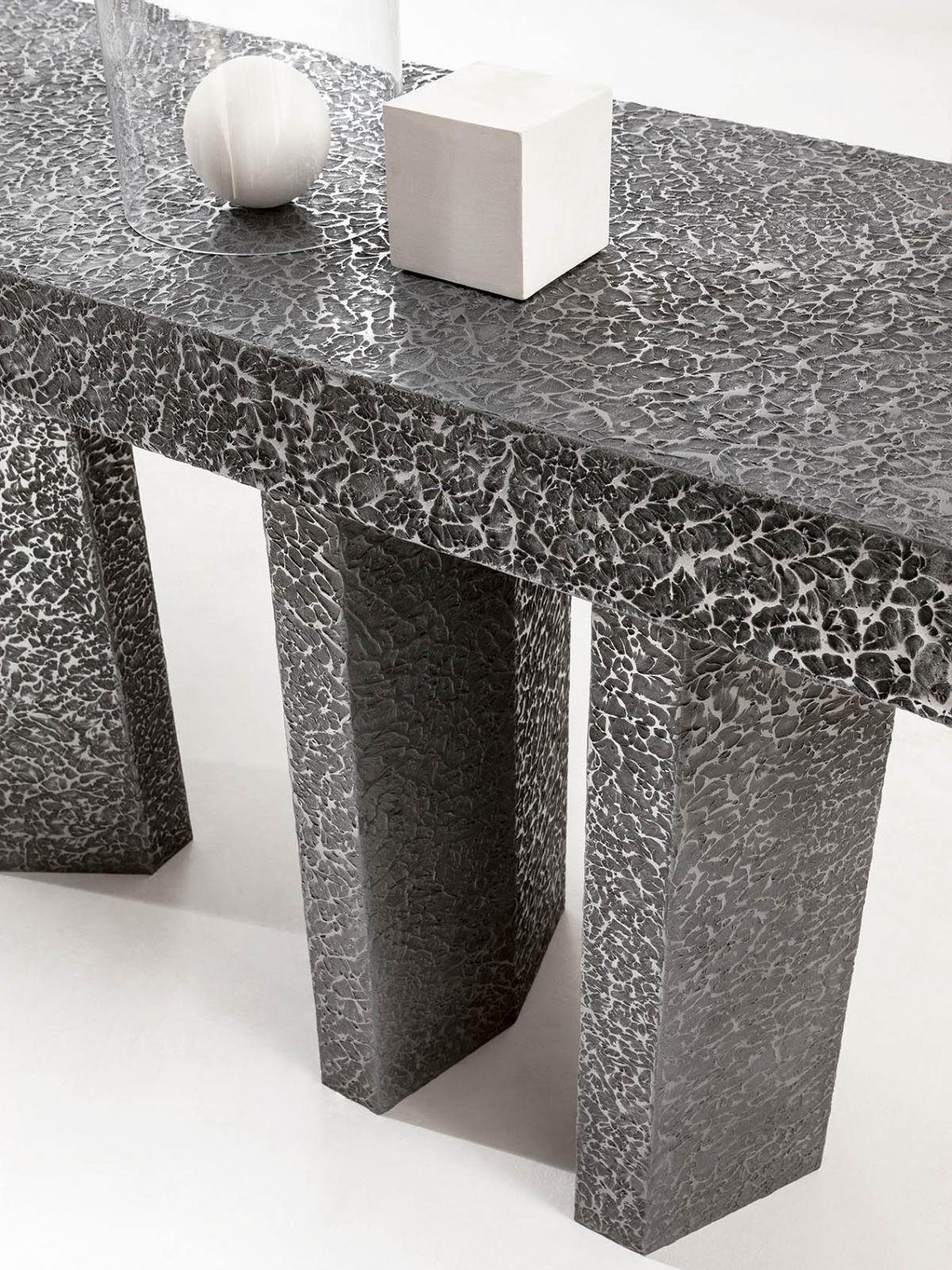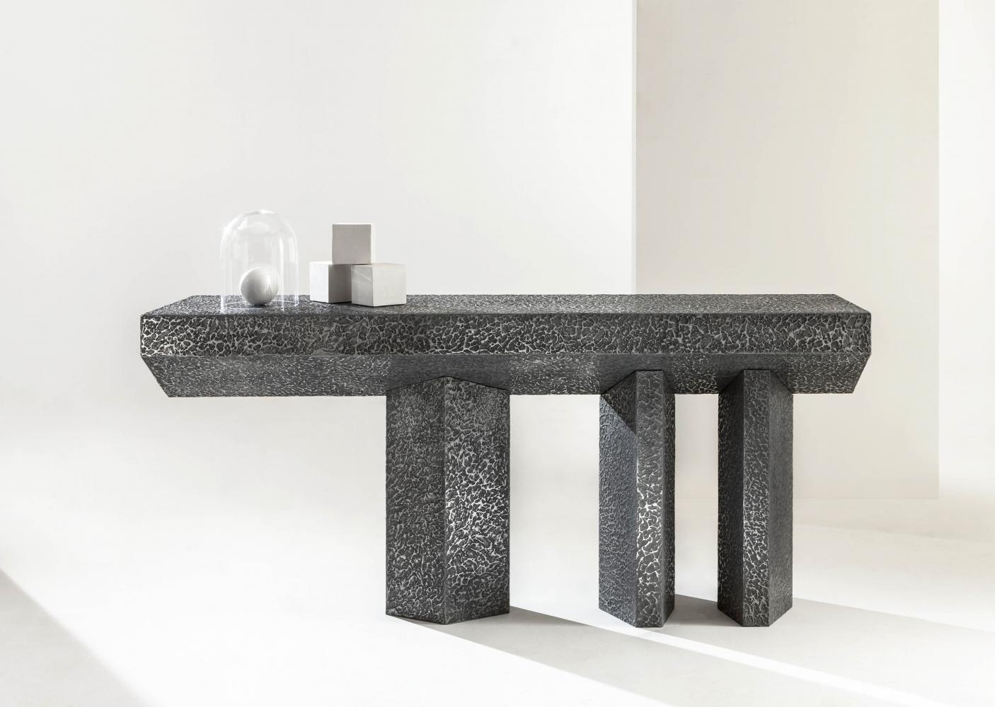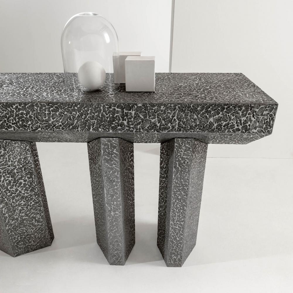 Part of the Imperfetto collection, this console re-proposes the imposing prismatic base of tables and coffee tables, referring, in its simplicity, to nature, minerals and rock formations.