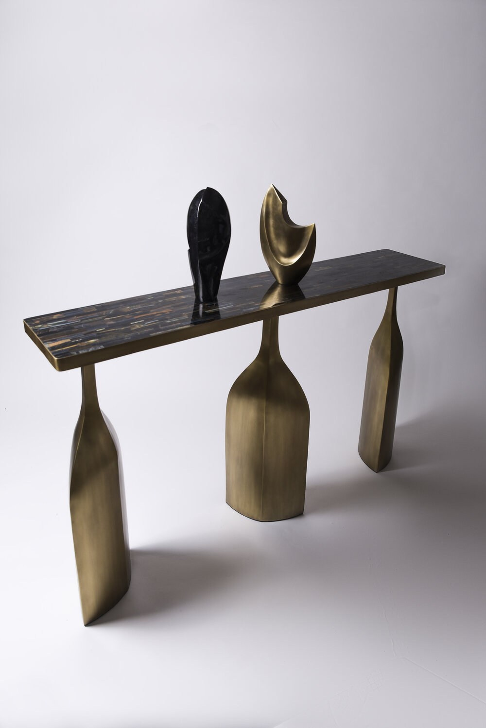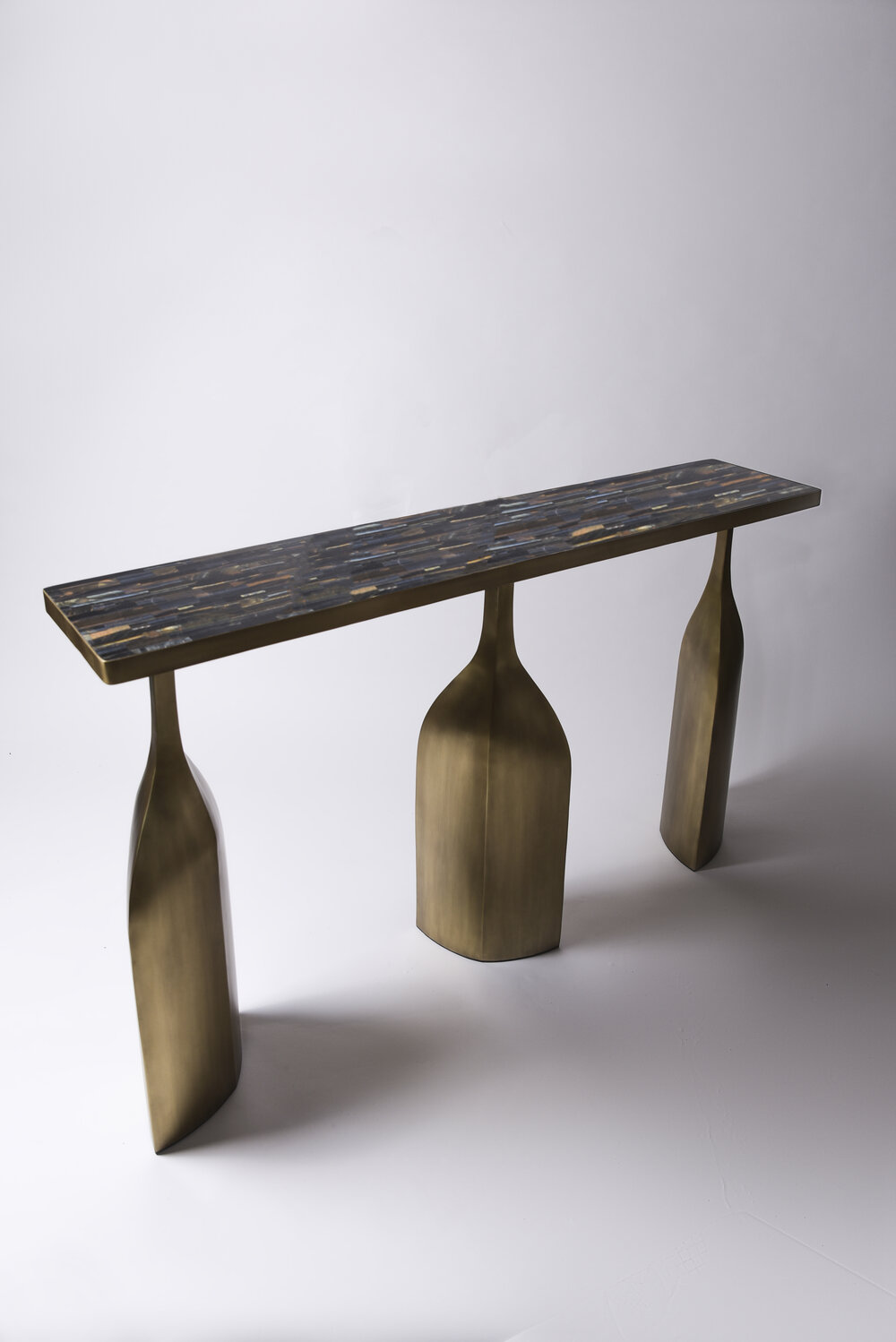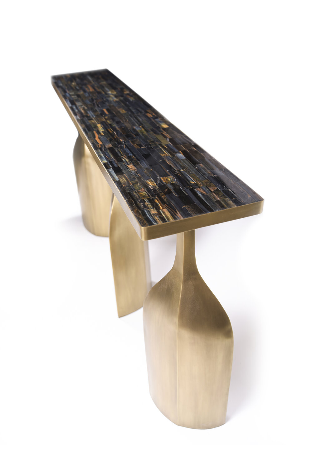 The Trinity Console is bold and exquisite in design. The top is inlaid either with the dreamy semi-precious stone: tiger eye blue or with our signature Antique Natural Shagreen. The Tiger Eye Semi-Precious Stone features incredible natural details with its mixture of blue, black and gold hues. The top sits on three stunning bronze-patina sculptural legs.