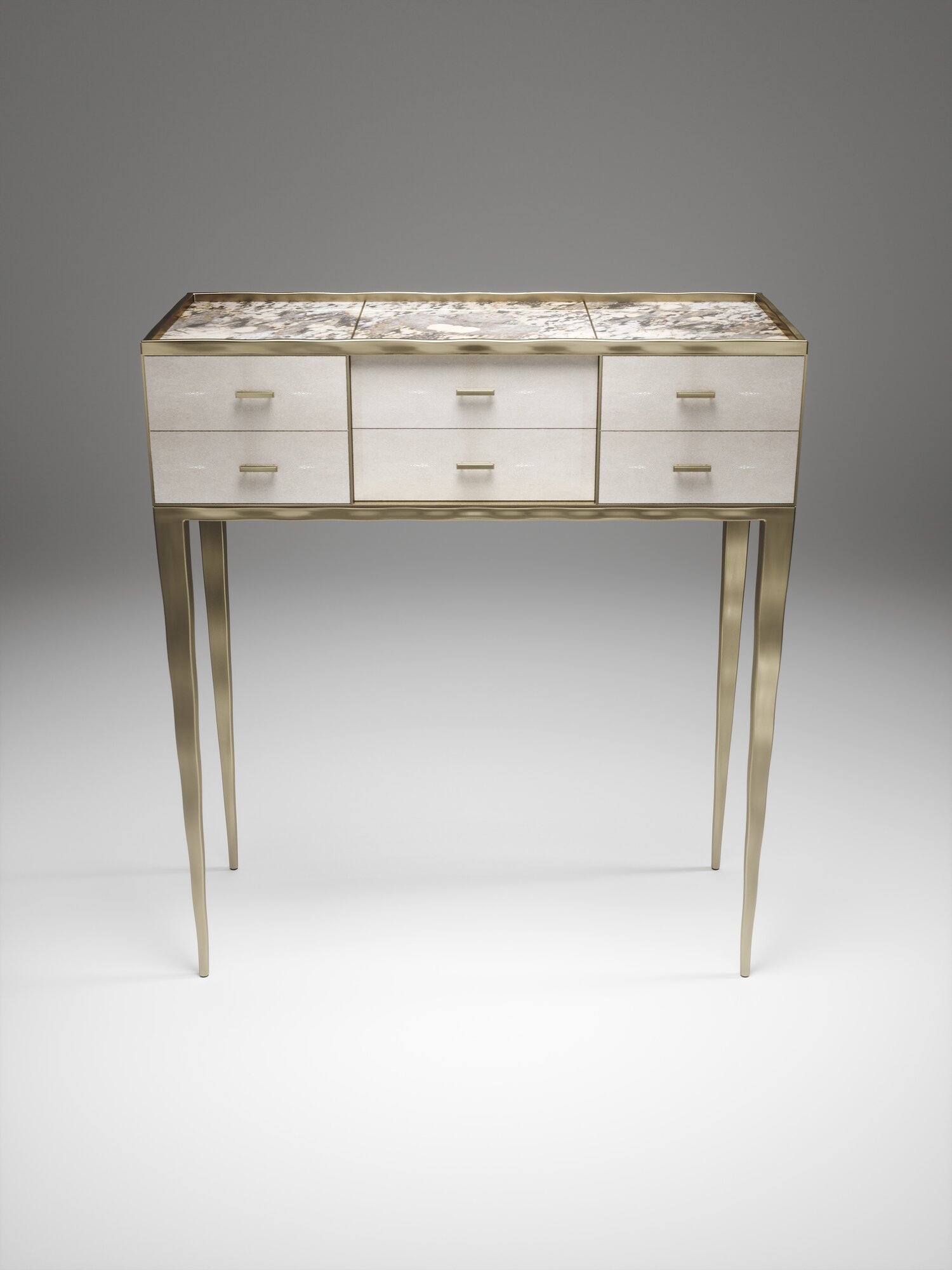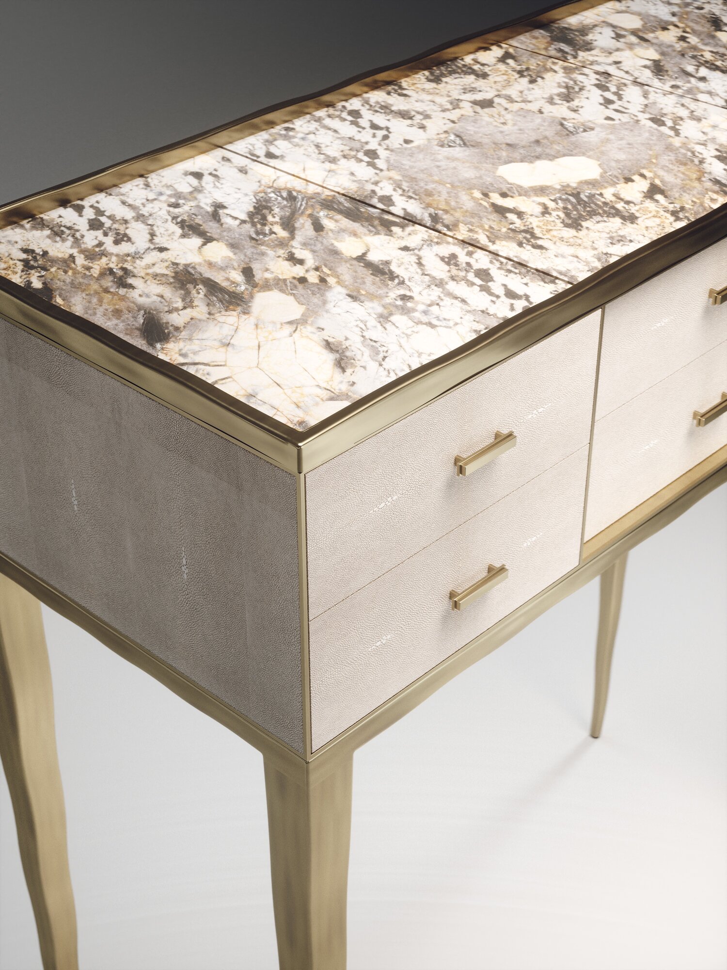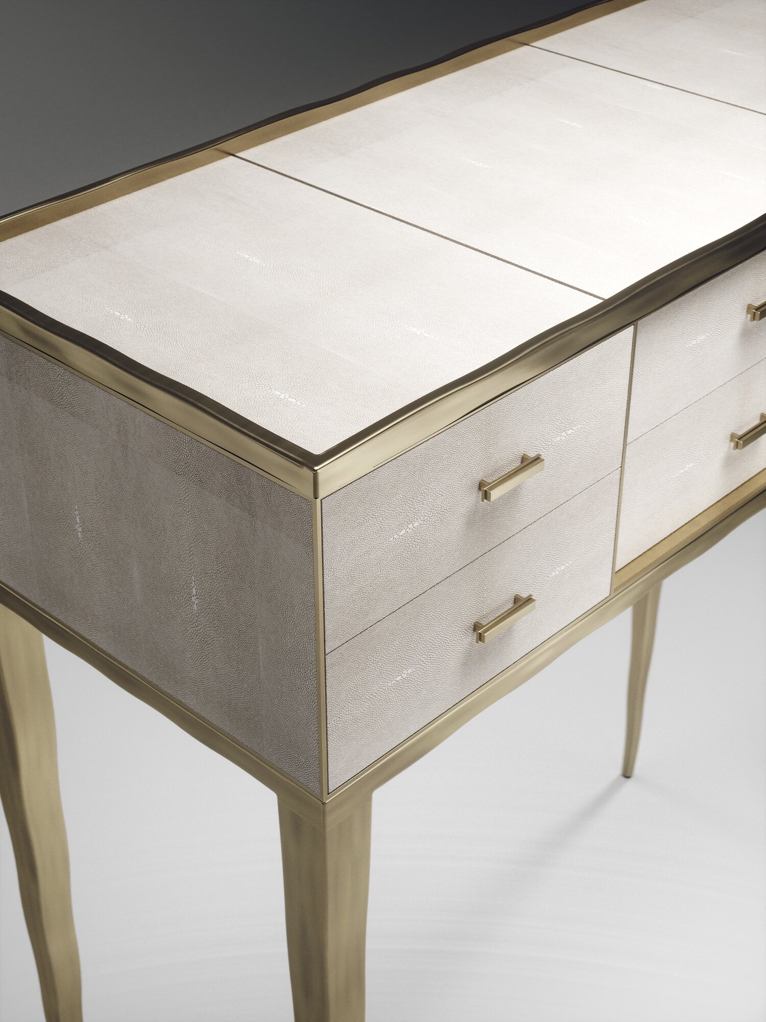 The Melting Cosima console table by R&Y Augousti is a stunning multi-faceted piece. The beautiful signature "melting" inlay work in bronze-patina brass demonstrates the incredible artisan work of Augousti. This piece includes 6 drawers total, and the tabletop is slightly dipped making this a great console for your entrance or vanity. This piece is inlaid in a mixture of patagonia and cream shagreen, available in other finishes. Custom sizing/finishing available on request.