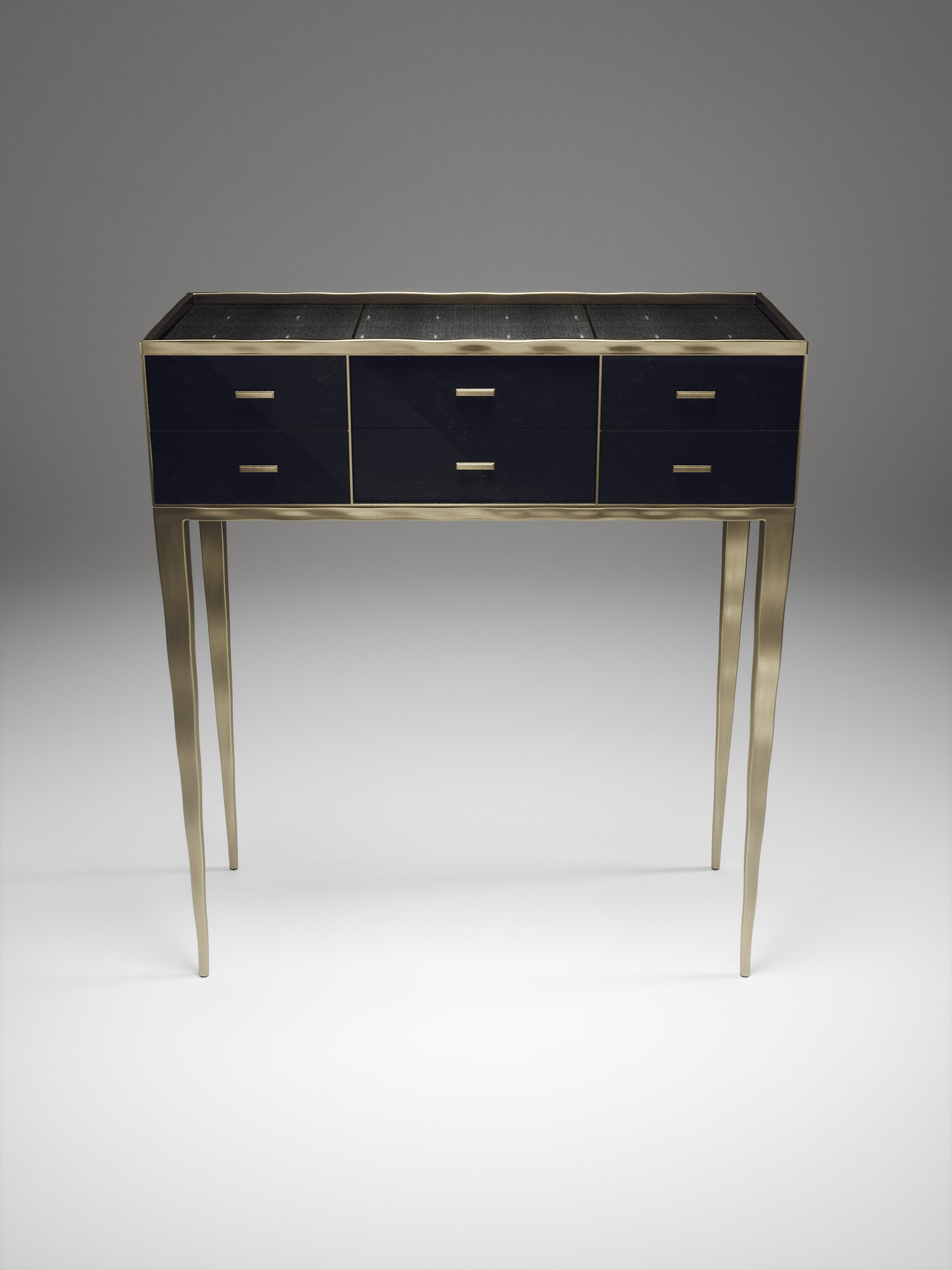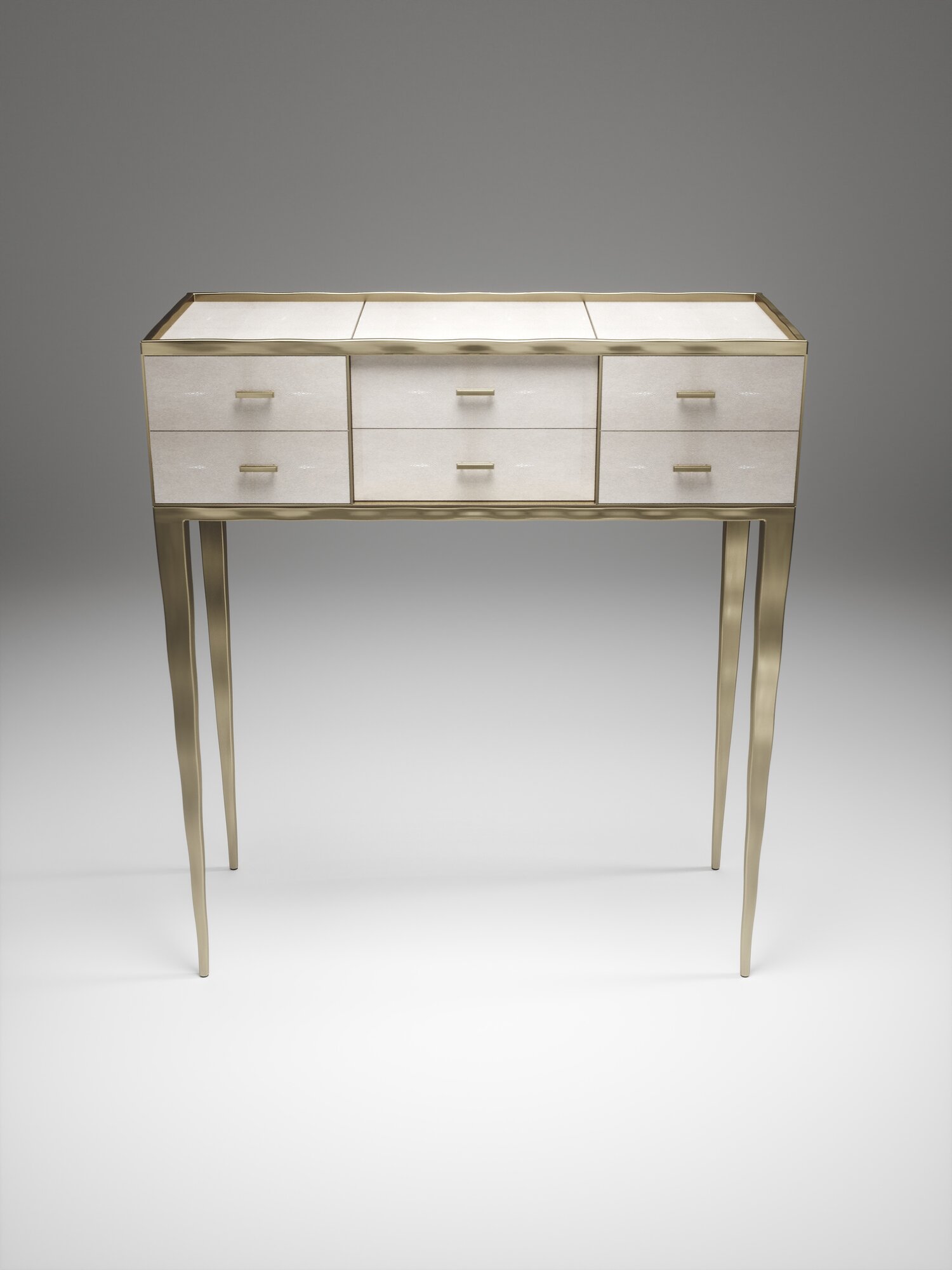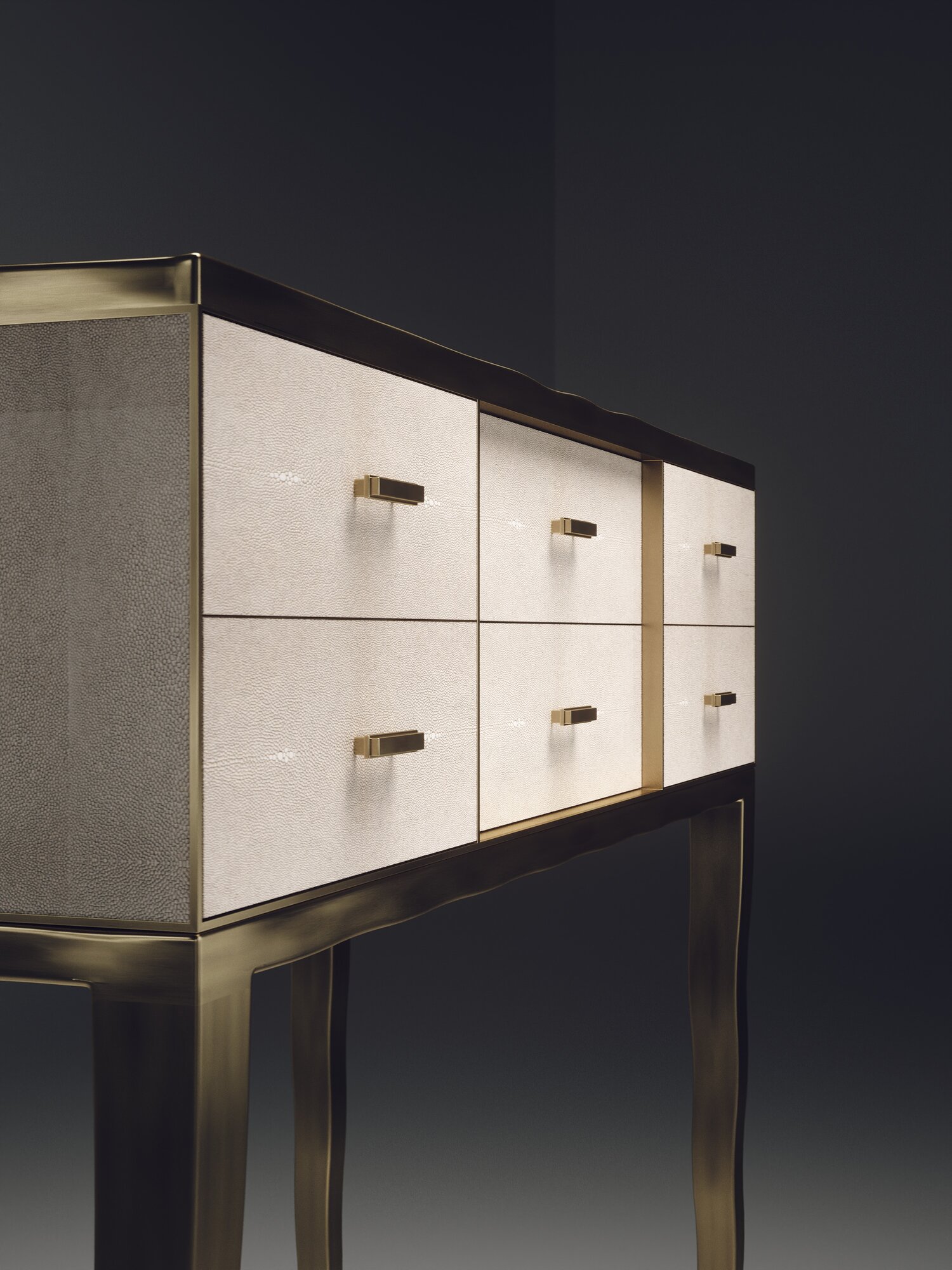 The Melting Cosima console table by R&Y Augousti is a stunning multi-faceted piece. The beautiful signature "melting" inlay work in bronze-patina brass demonstrates the incredible artisan work of Augousti. This piece includes 6 drawers total, and the tabletop is slightly dipped making this a great console for your entrance or vanity. This piece is inlaid in a mixture of patagonia and cream shagreen, available in other finishes. Custom sizing/finishing available on request.