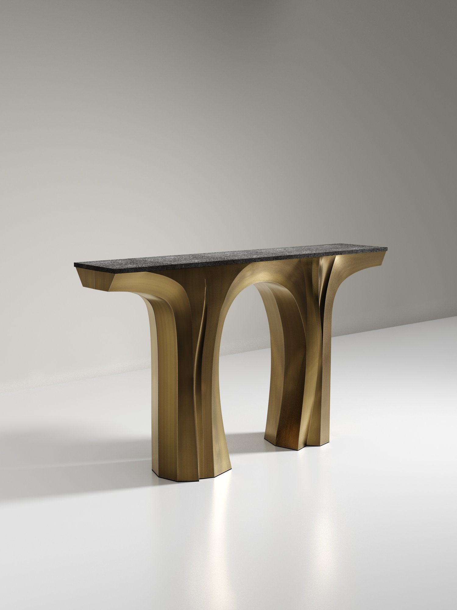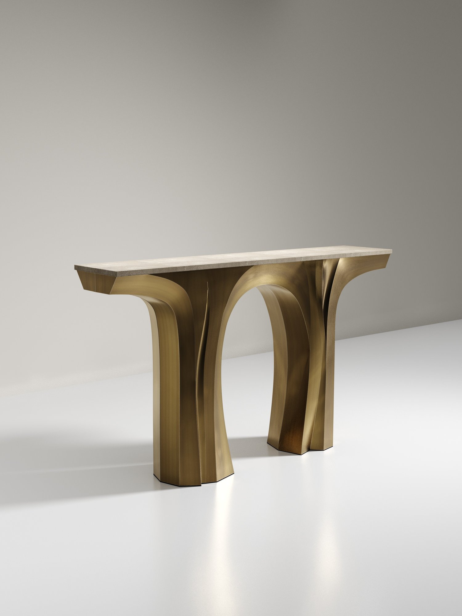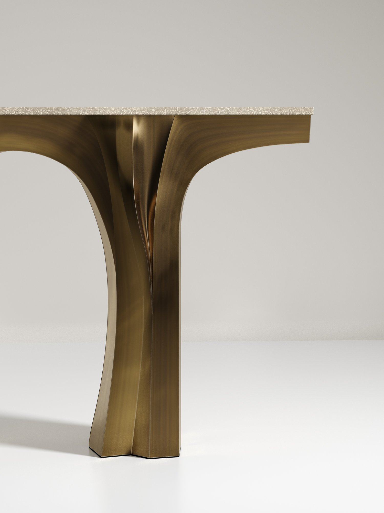 The Alma console by R&Y Augousti is a sculptural and versatile piece. The cream shagreen inlaid top morphs into dramatic hand-carved bronze-patina brass legs. The grooves and details on the base allow the console to have different expressions from all angles.