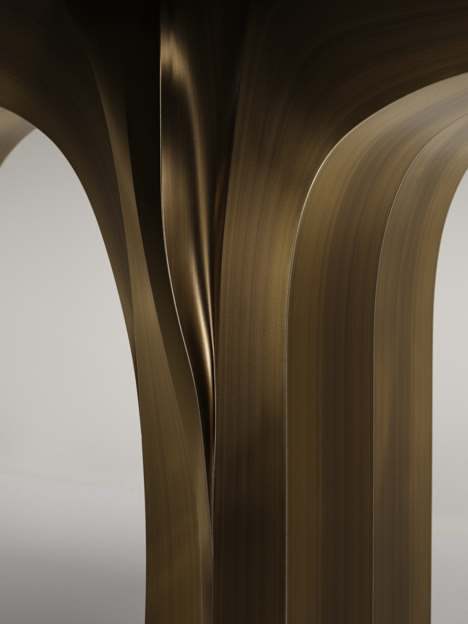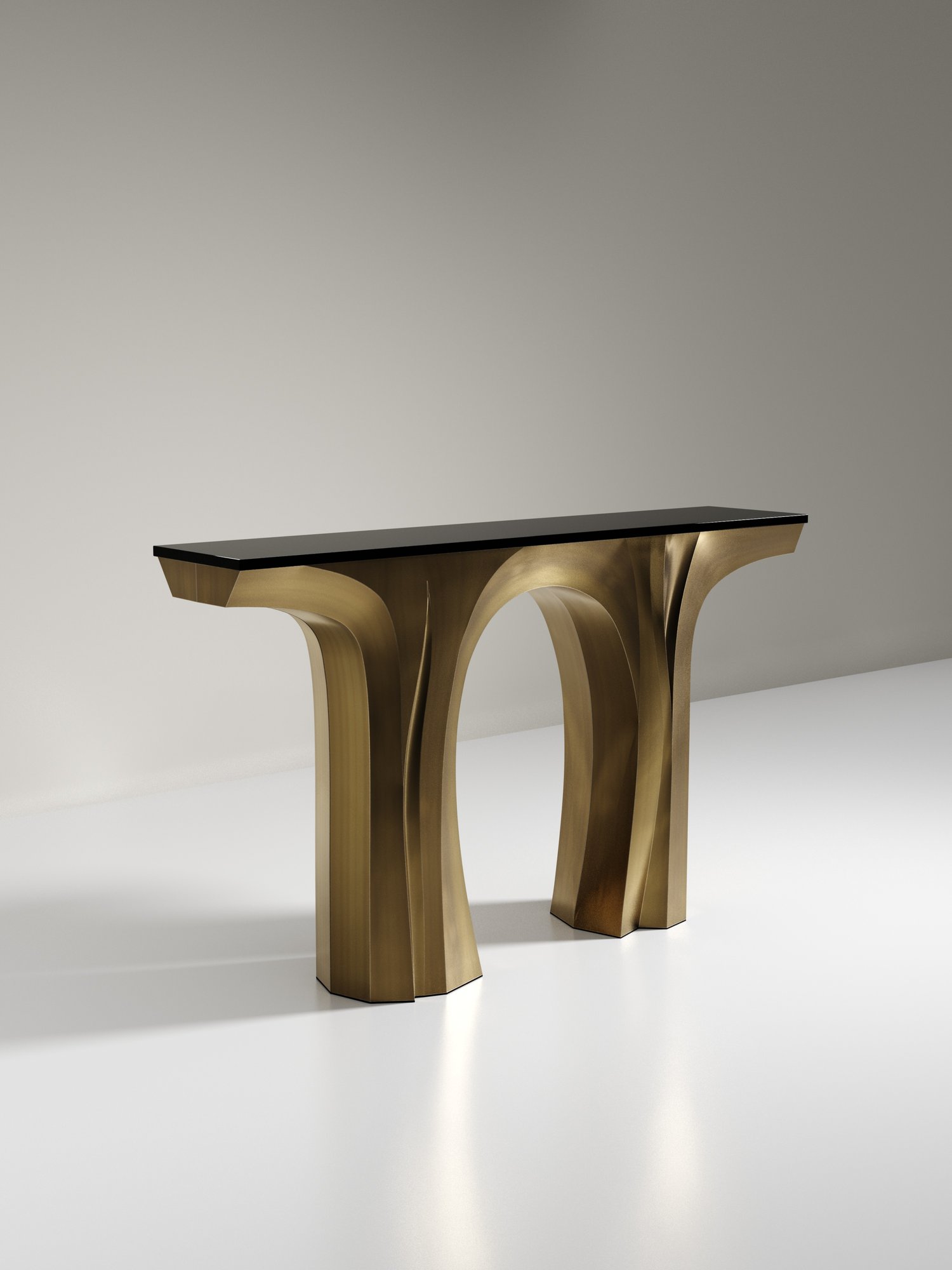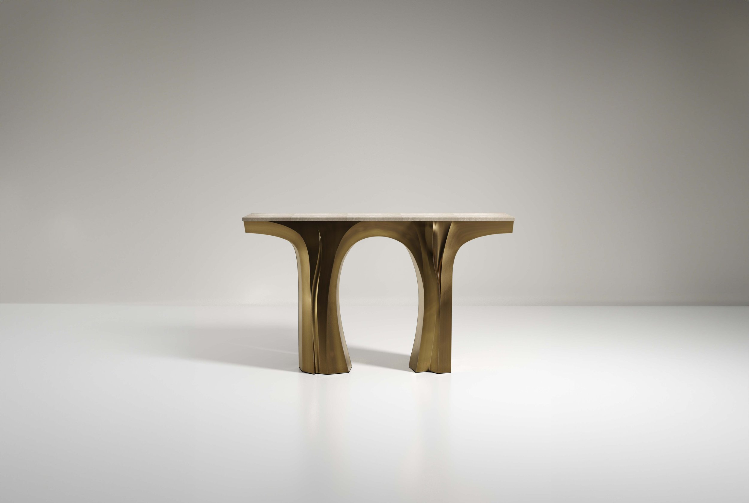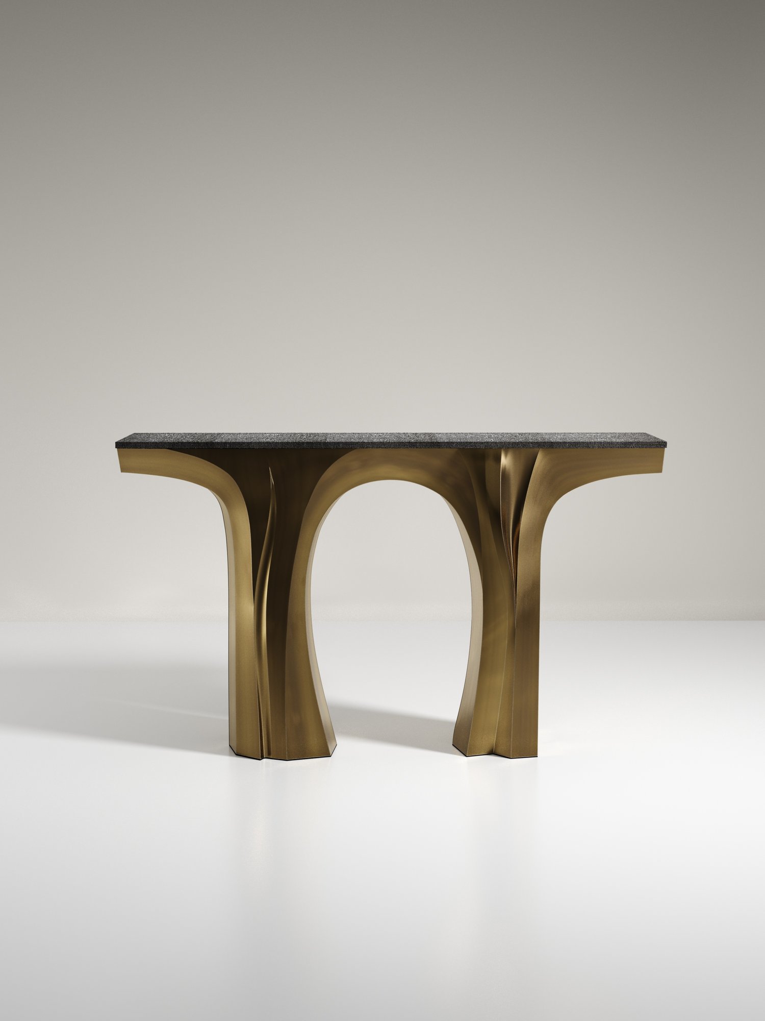 The Alma console by R&Y Augousti is a sculptural and versatile piece. The cream shagreen inlaid top morphs into dramatic hand-carved bronze-patina brass legs. The grooves and details on the base allow the console to have different expressions from all angles.