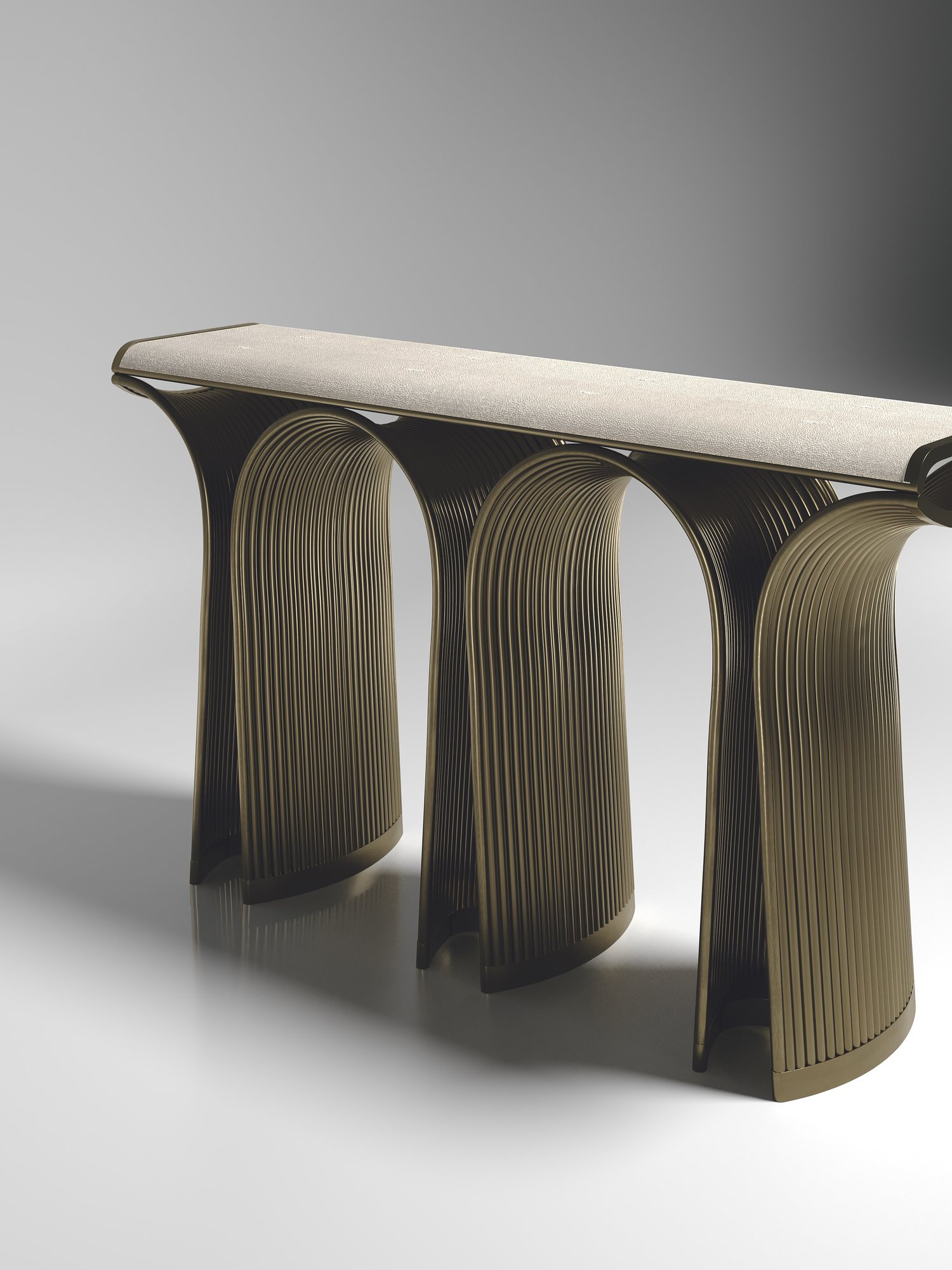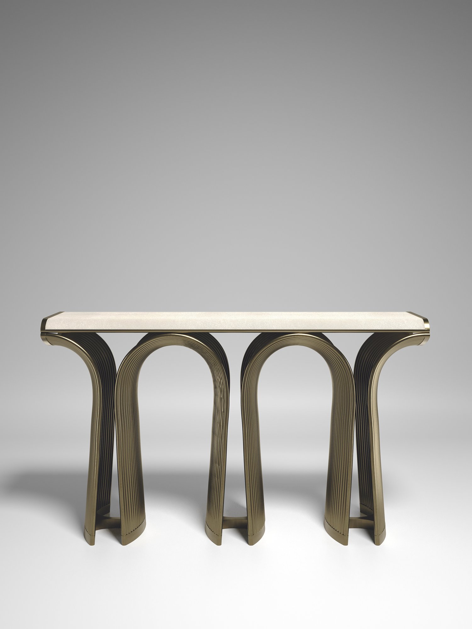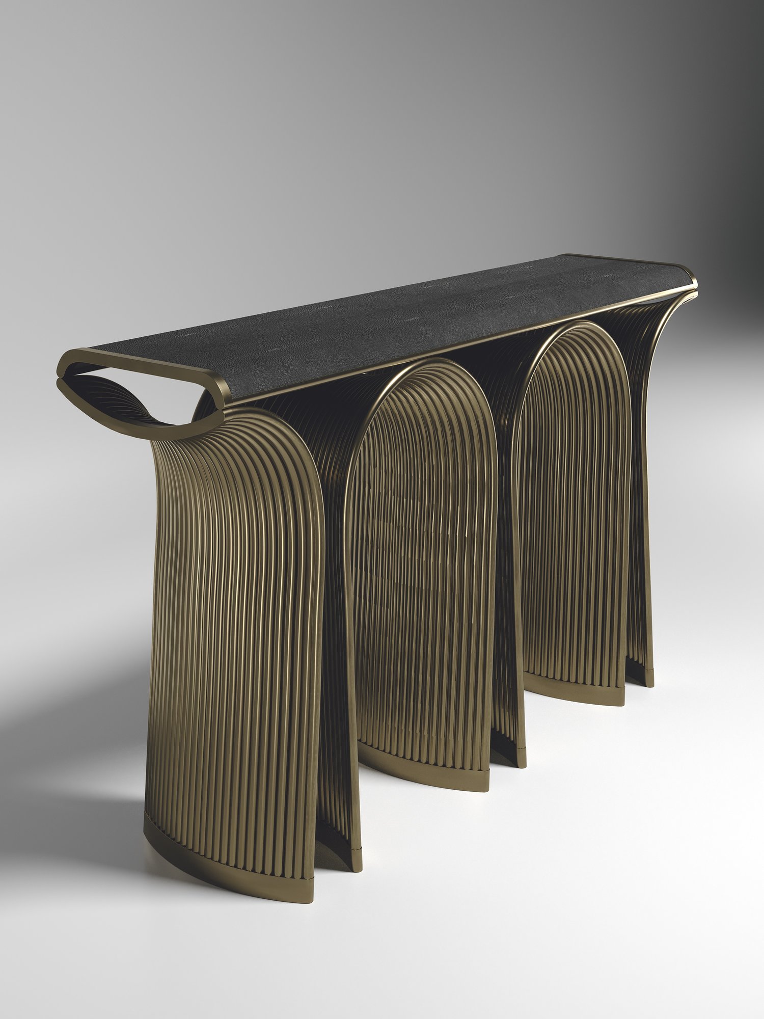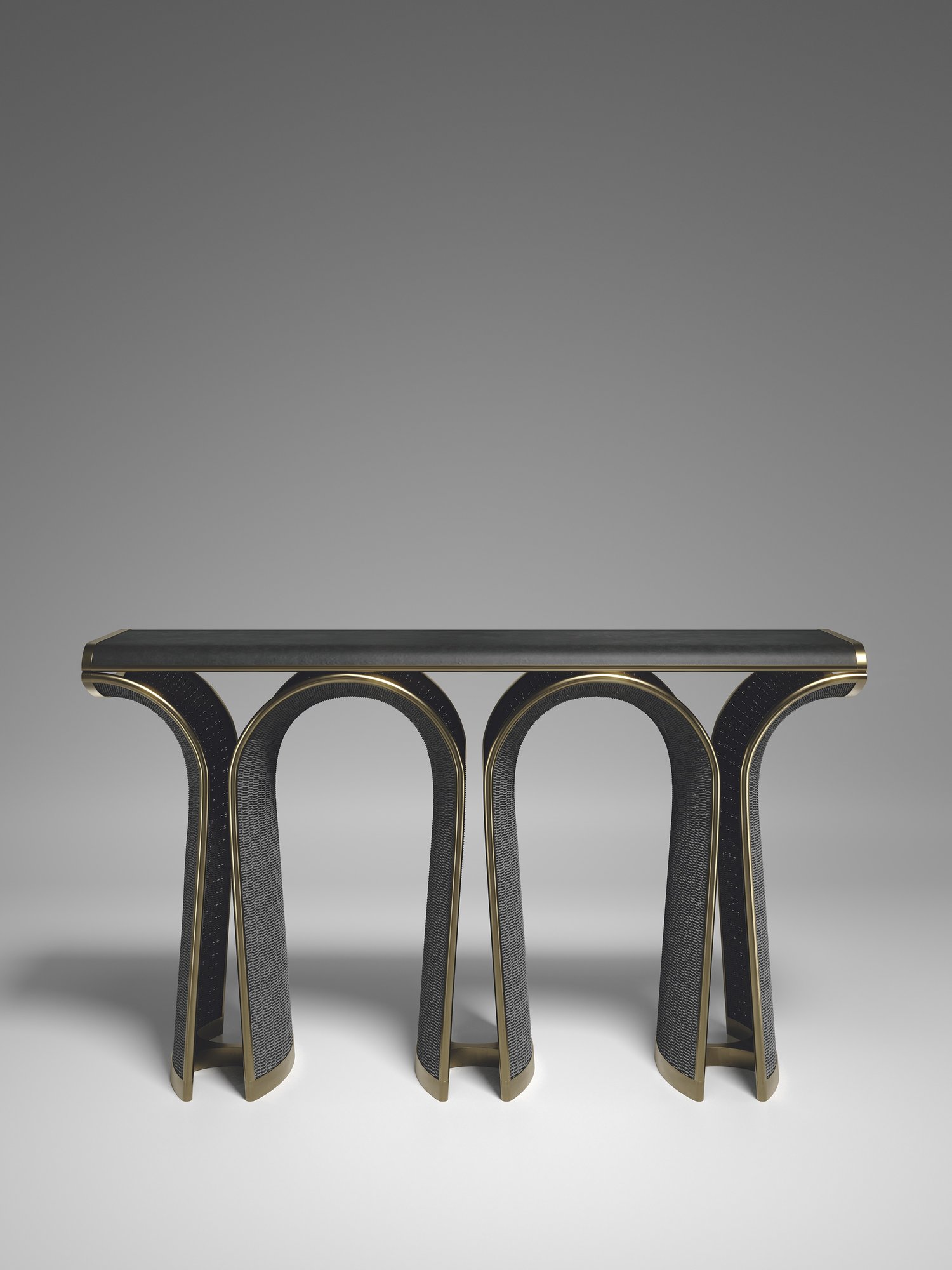 The Nymphea Console by R & Y Augousti explores the brand's iconic DNA of bringing old world artisanal craft into a contemporary and utterly luxury feel. This table is done in 3 variations: a rattan base with an inlaid top, a bronze-patina brass rod base with an inlaid top and all shagreen or shell. Custom sizing/finishing on request