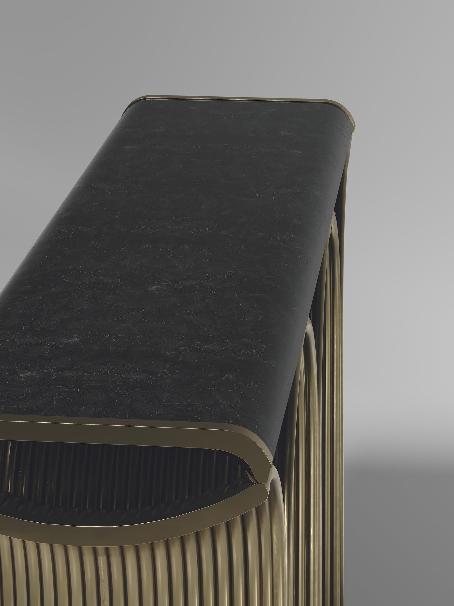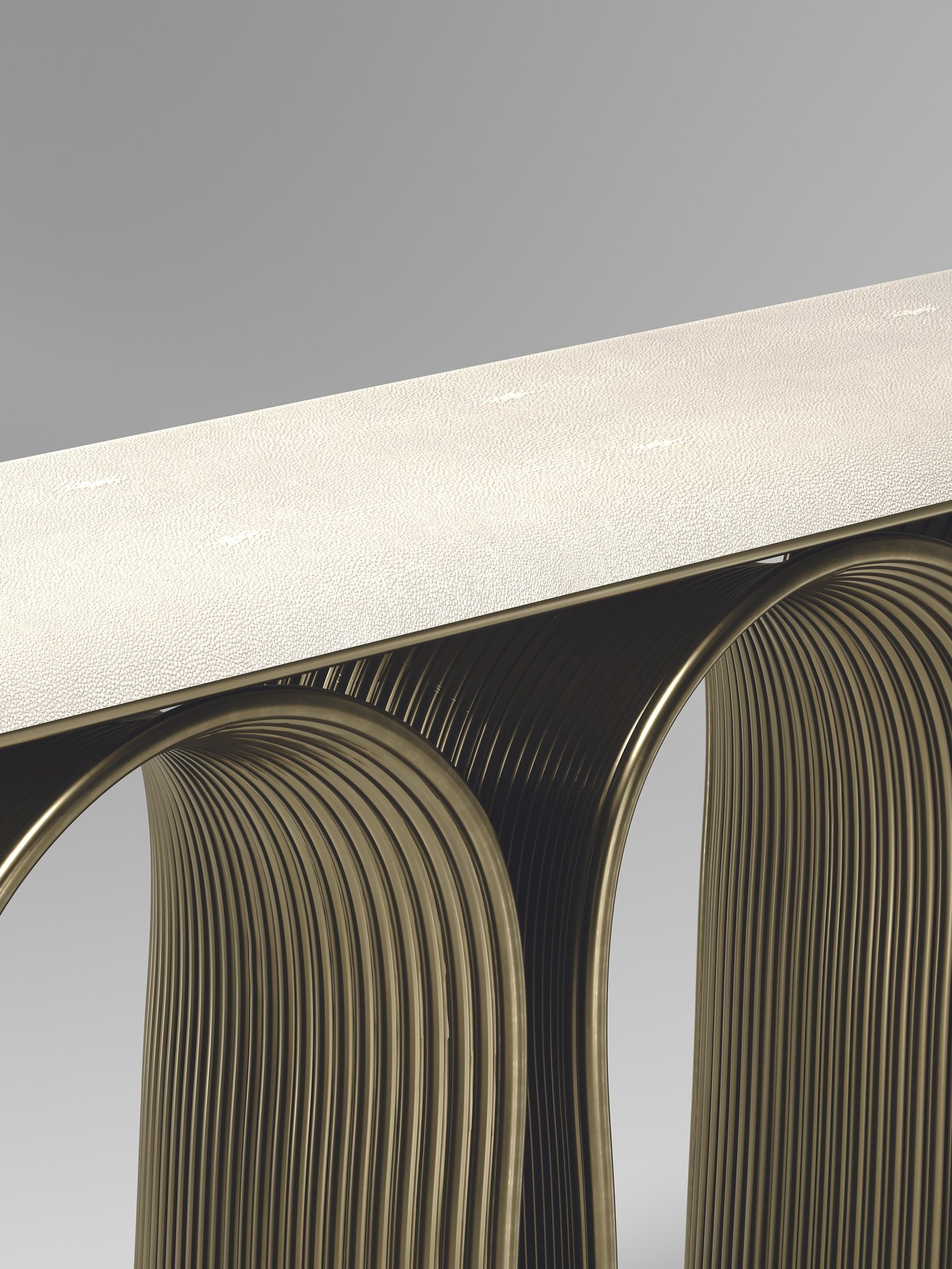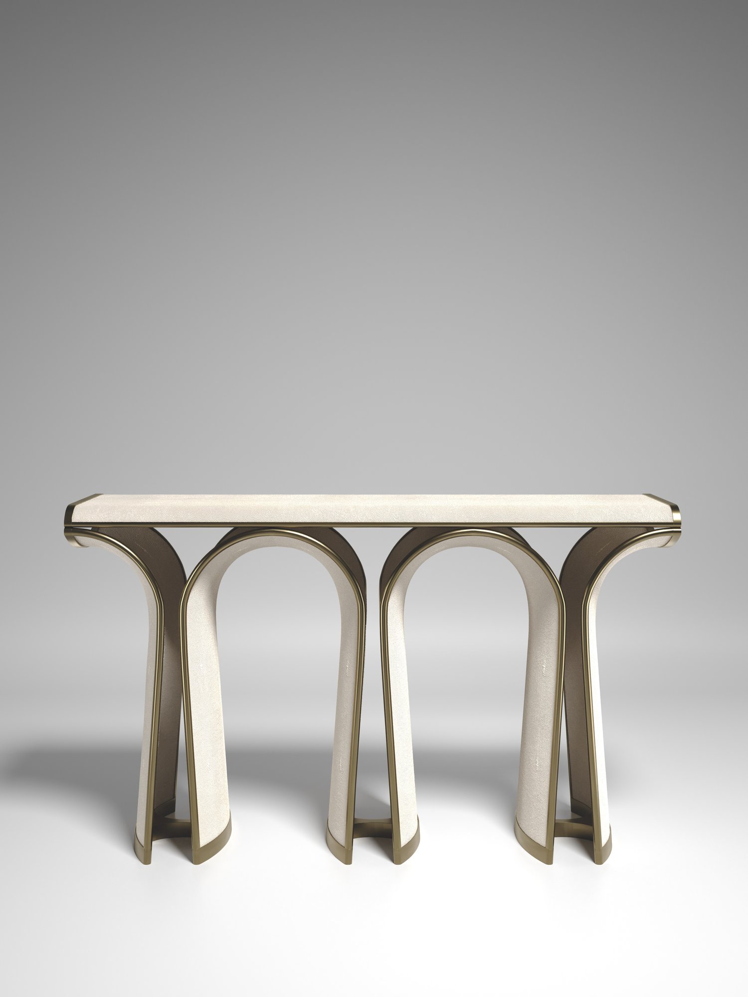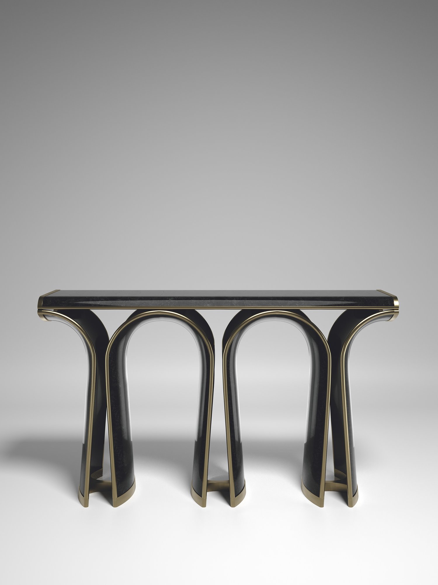 The Nymphea Console by R & Y Augousti explores the brand's iconic DNA of bringing old world artisanal craft into a contemporary and utterly luxury feel. This table is done in 3 variations: a rattan base with an inlaid top, a bronze-patina brass rod base with an inlaid top and all shagreen or shell. Custom sizing/finishing on request