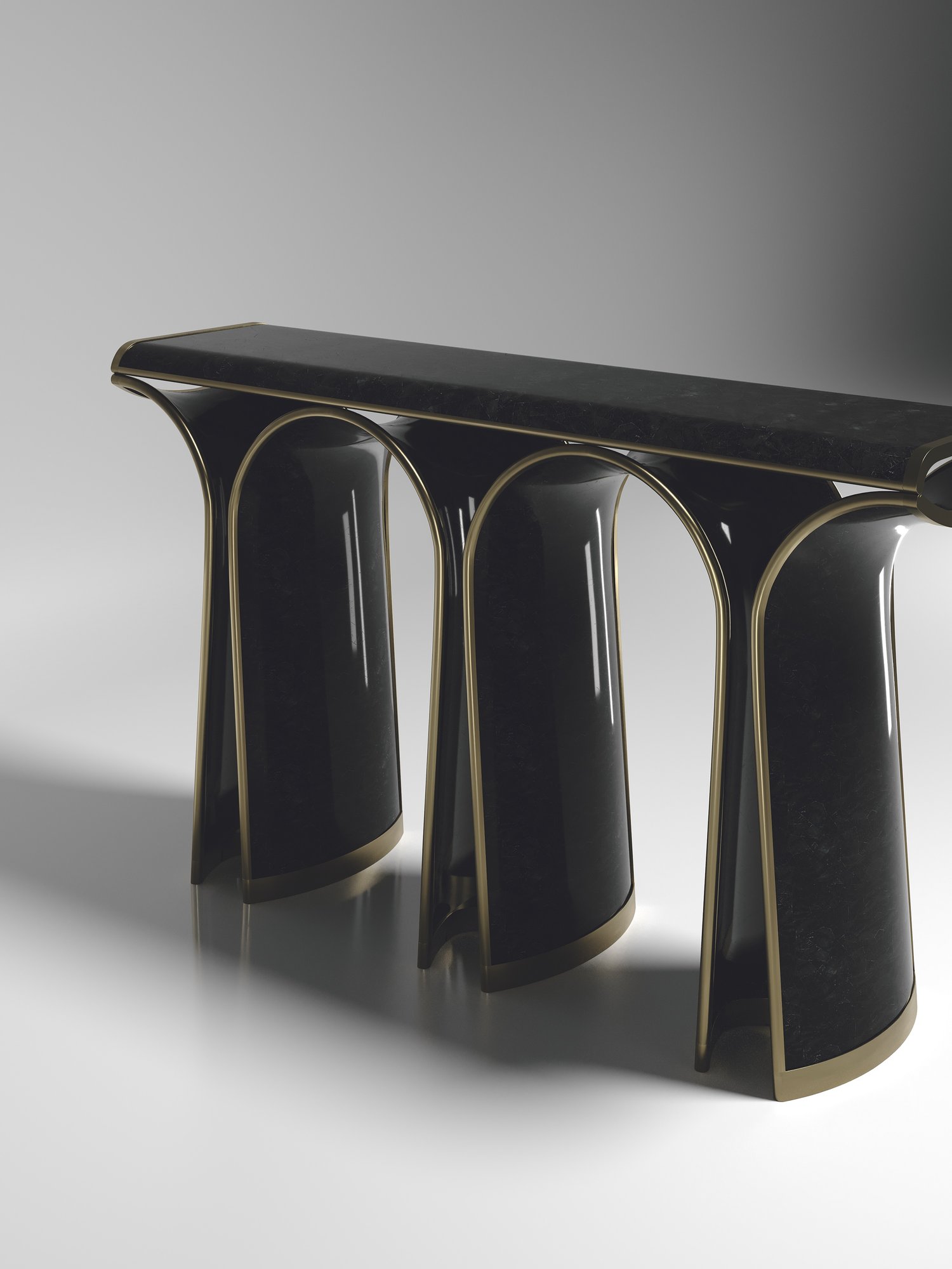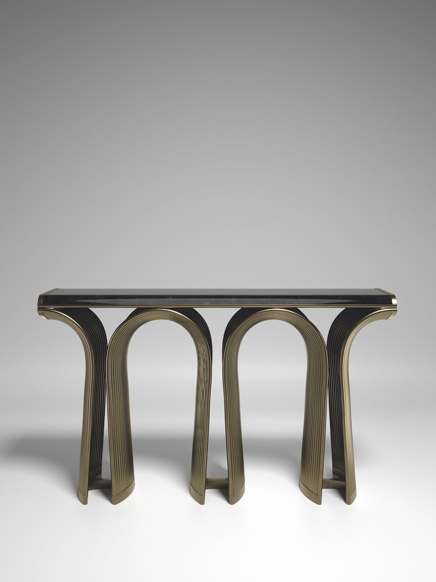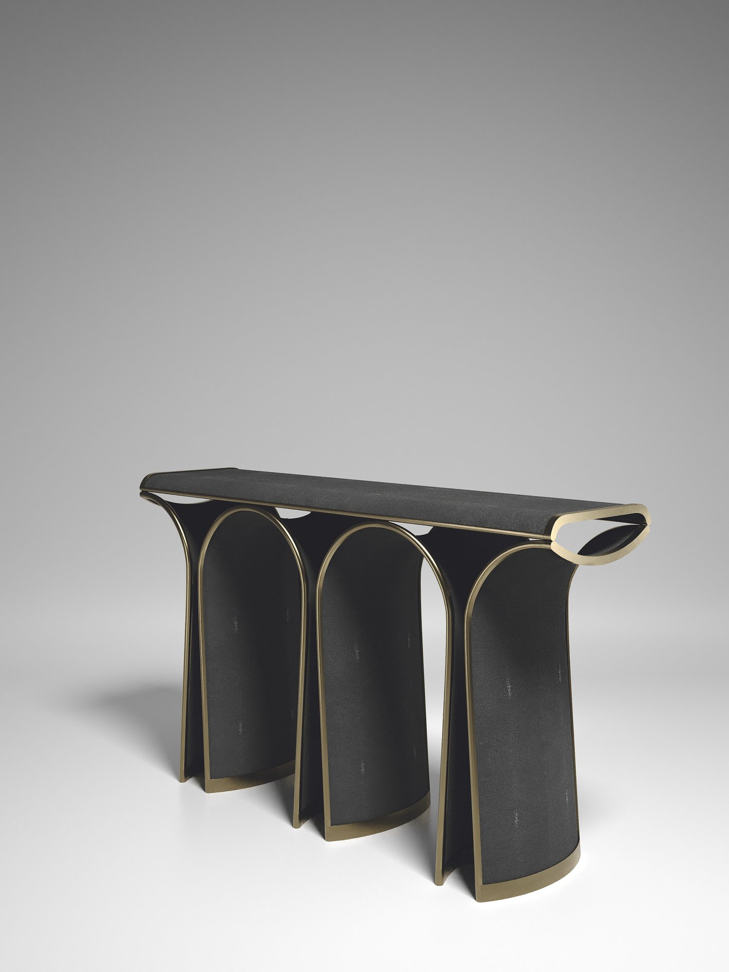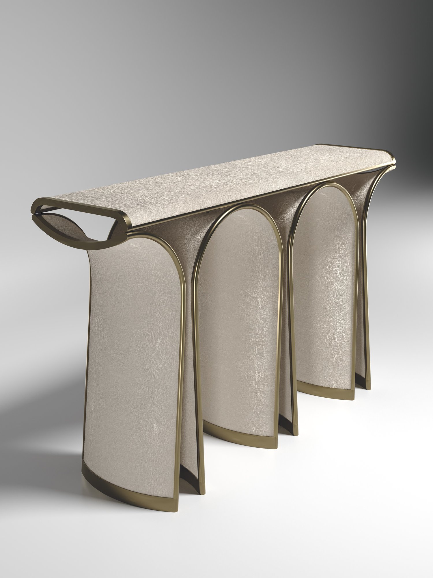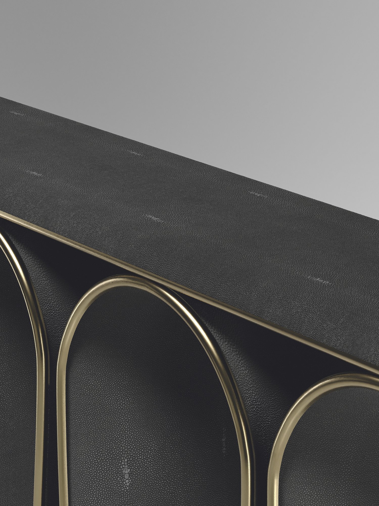 The Nymphea Console by R & Y Augousti explores the brand's iconic DNA of bringing old world artisanal craft into a contemporary and utterly luxury feel. This table is done in 3 variations: a rattan base with an inlaid top, a bronze-patina brass rod base with an inlaid top and all shagreen or shell. Custom sizing/finishing on request