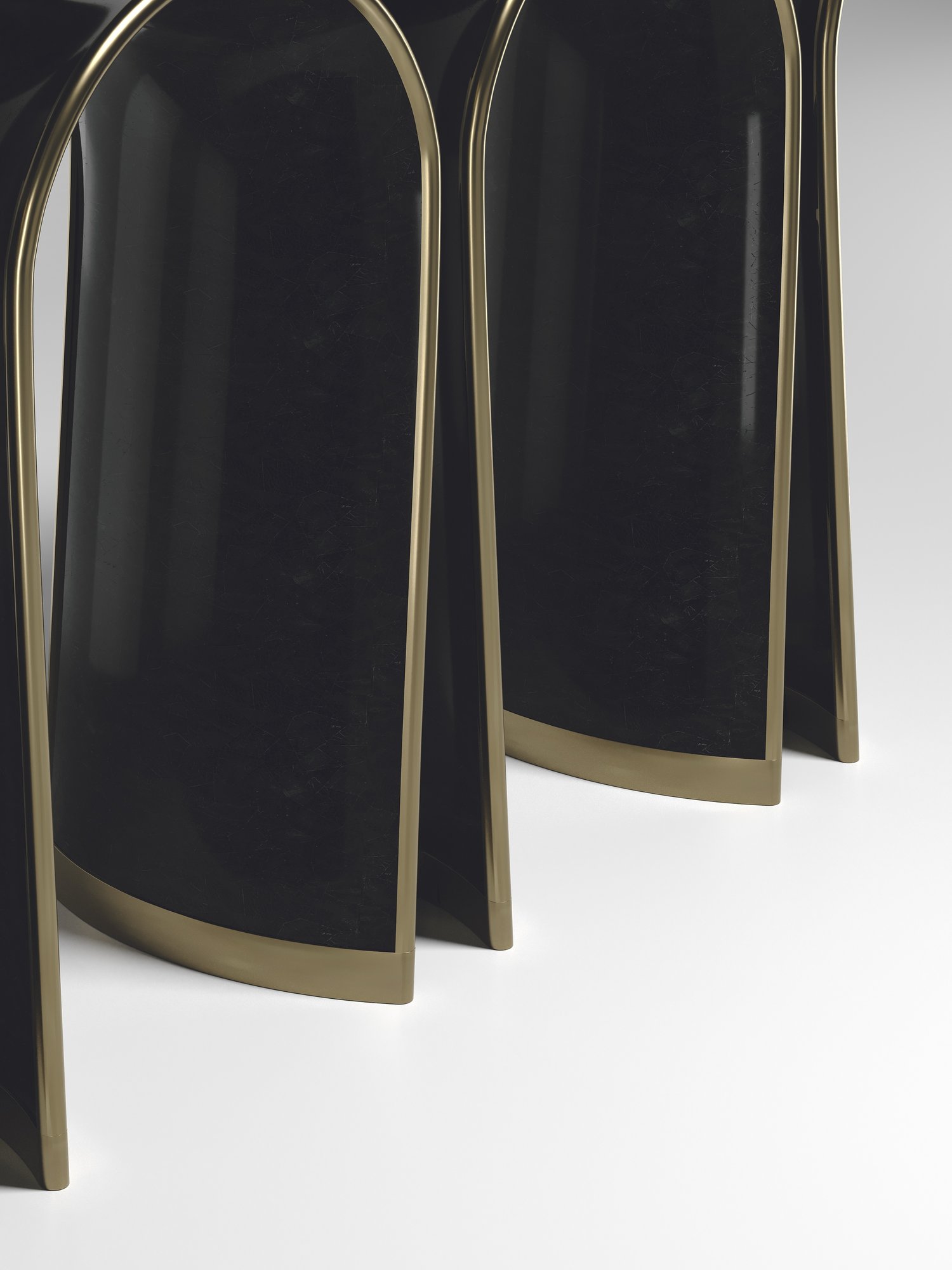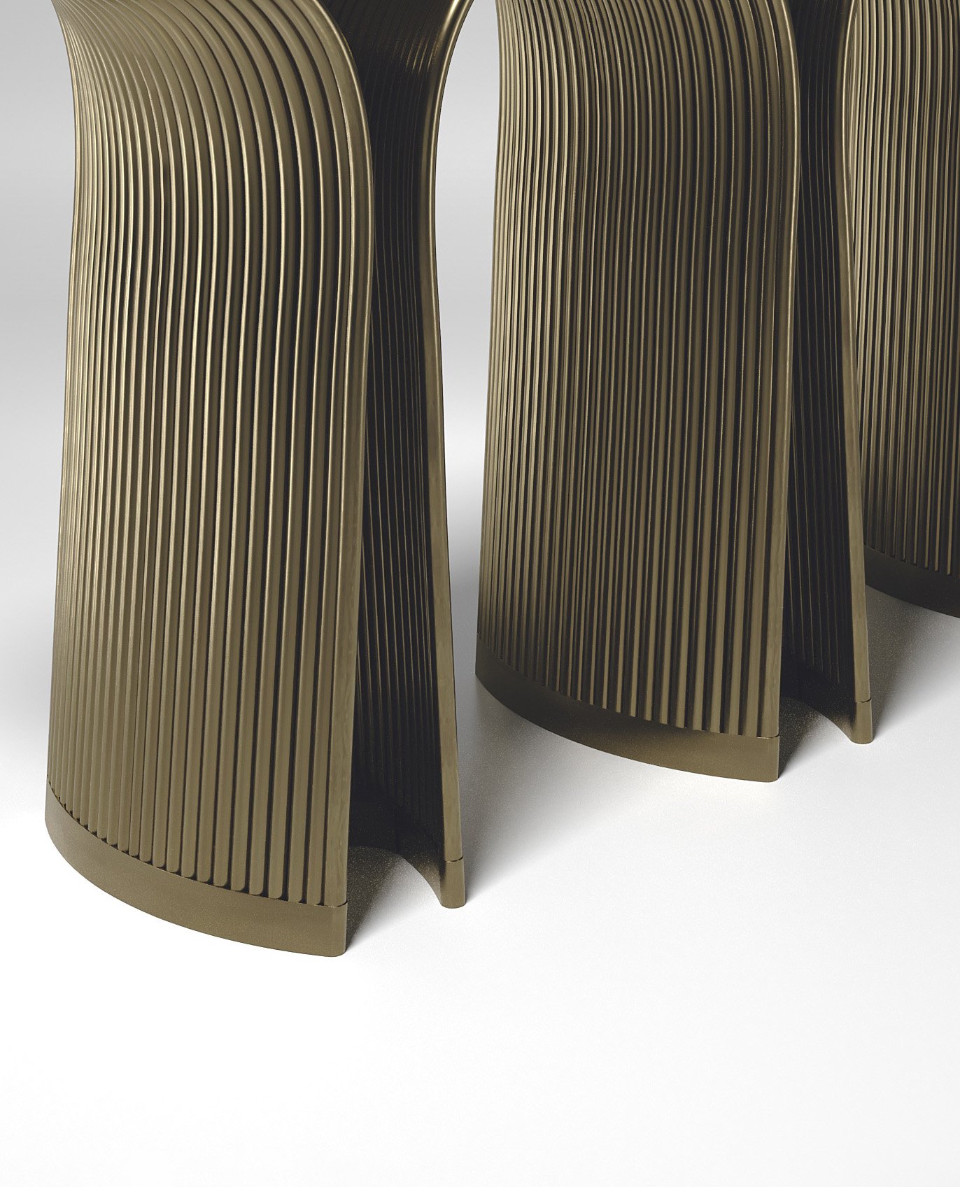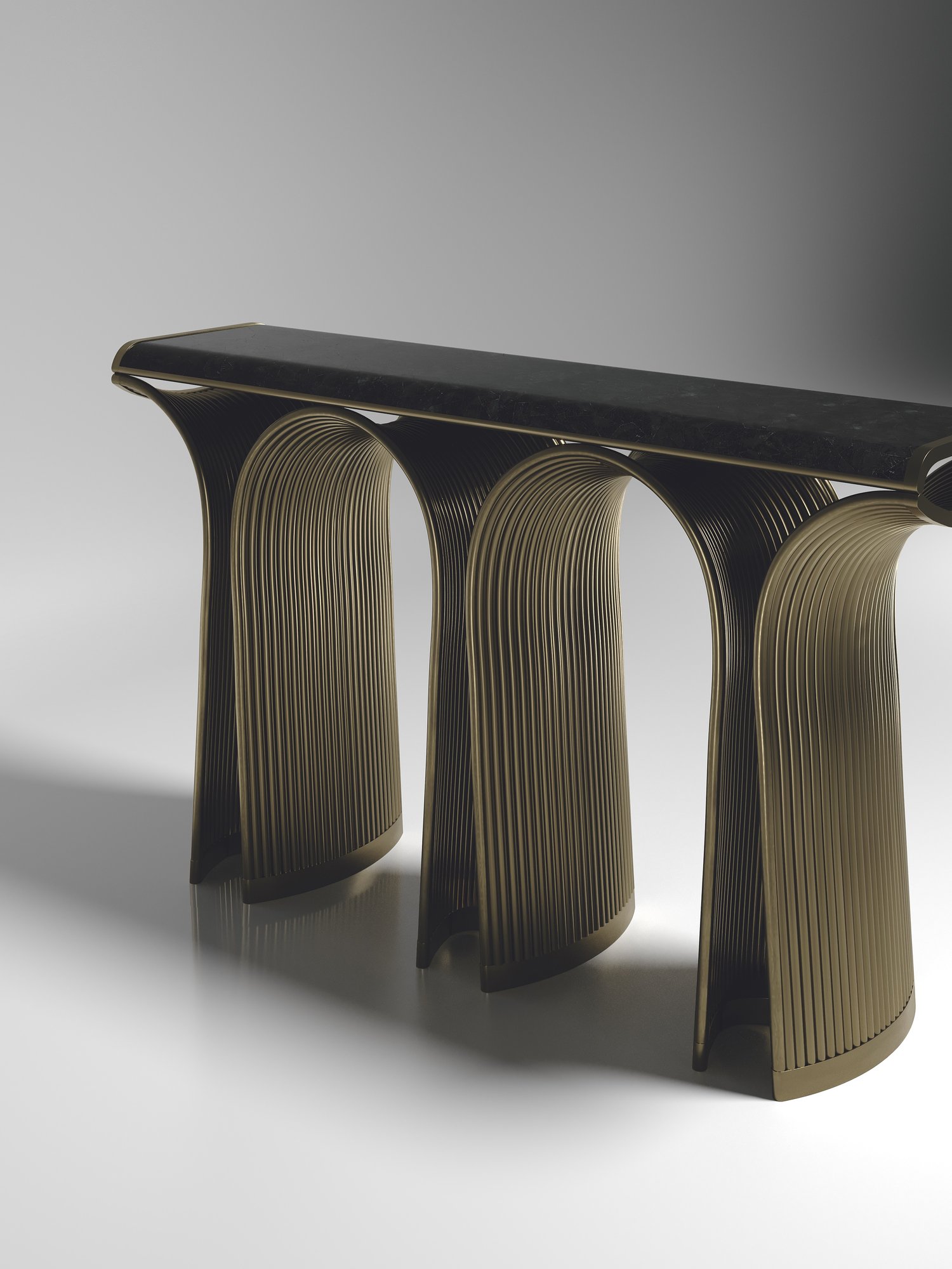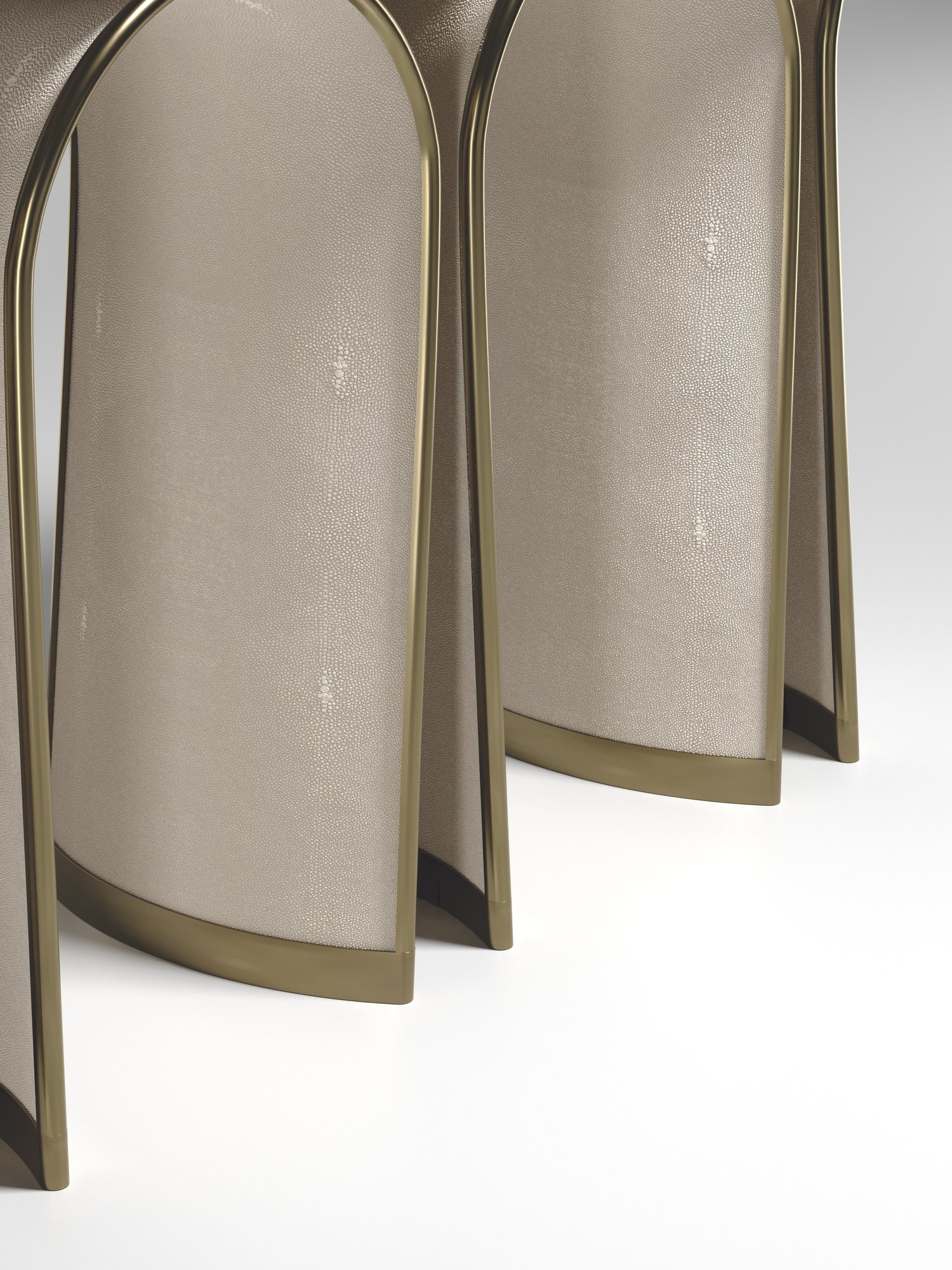 The Nymphea Console by R & Y Augousti explores the brand's iconic DNA of bringing old world artisanal craft into a contemporary and utterly luxury feel. This table is done in 3 variations: a rattan base with an inlaid top, a bronze-patina brass rod base with an inlaid top and all shagreen or shell. Custom sizing/finishing on request