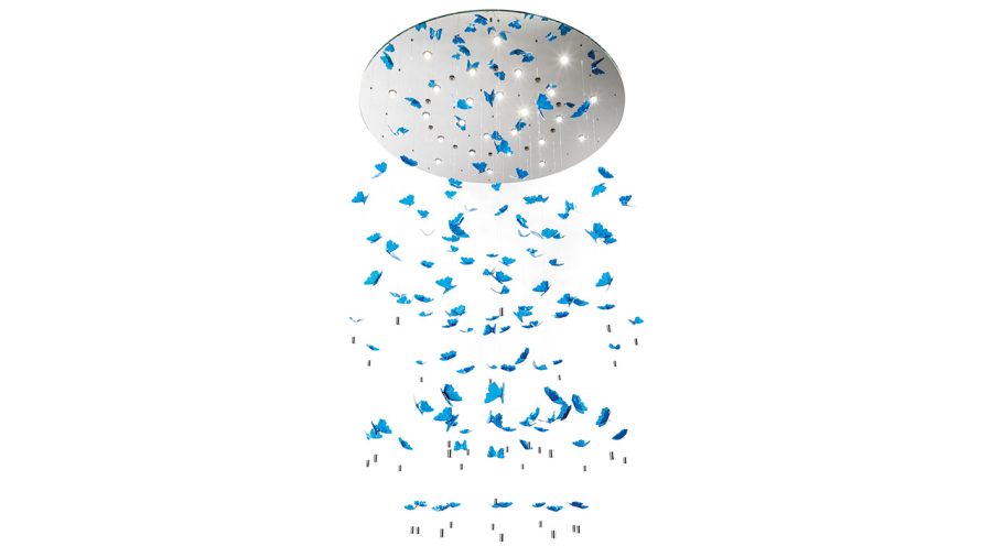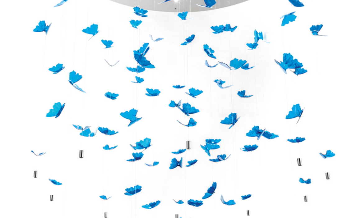 Lampada a sospensione con supporto in vetro a specchio con Led incassati e farfalle pendenti di differenti dimensioni in vetro dipinto a mano. Dettagli in acciaio lucido.