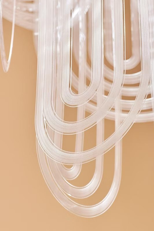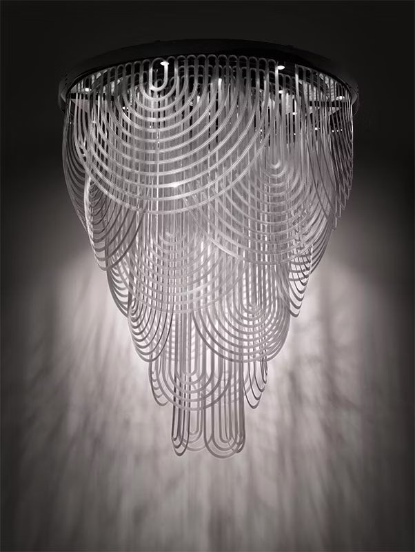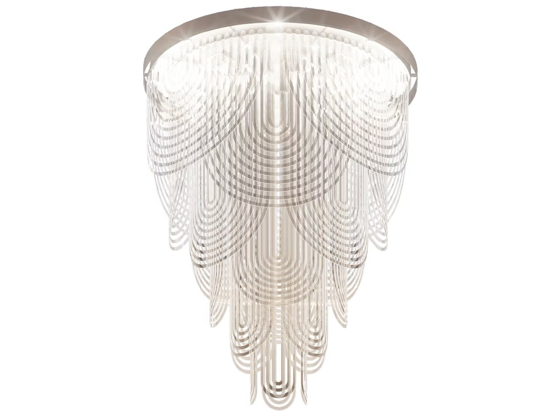 Le Grand Ceremony is a ball gown, a pearl necklace, and the draping of a neckline. Its imposing size contrasts with an intrinsic lightness that makes it easily installable in large-scale projects. 21 spotlights encircle a customizable iron ring (finishing to be determined per project), inserted in the lowered or false ceiling necessary to electrical connection. The light from the light sources spreads among the Cristalflex? 'necklaces,' creating broad and enveloping lighting effects.