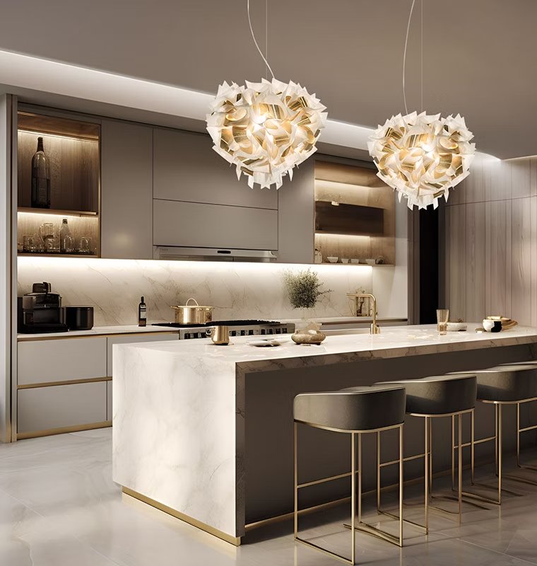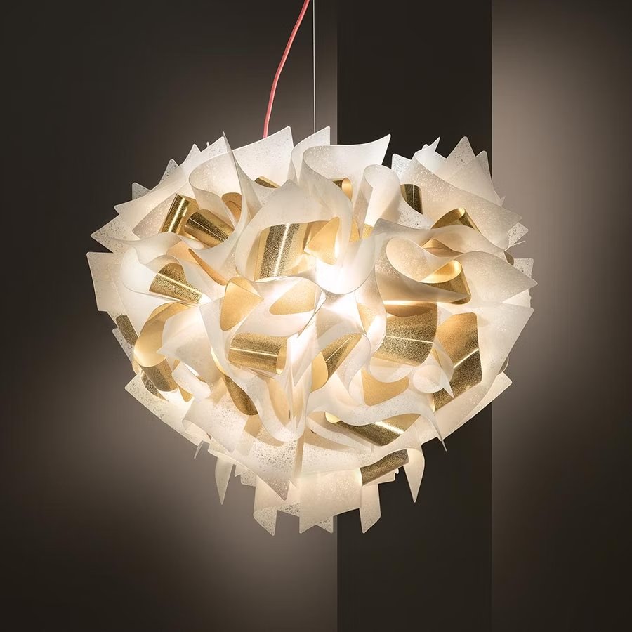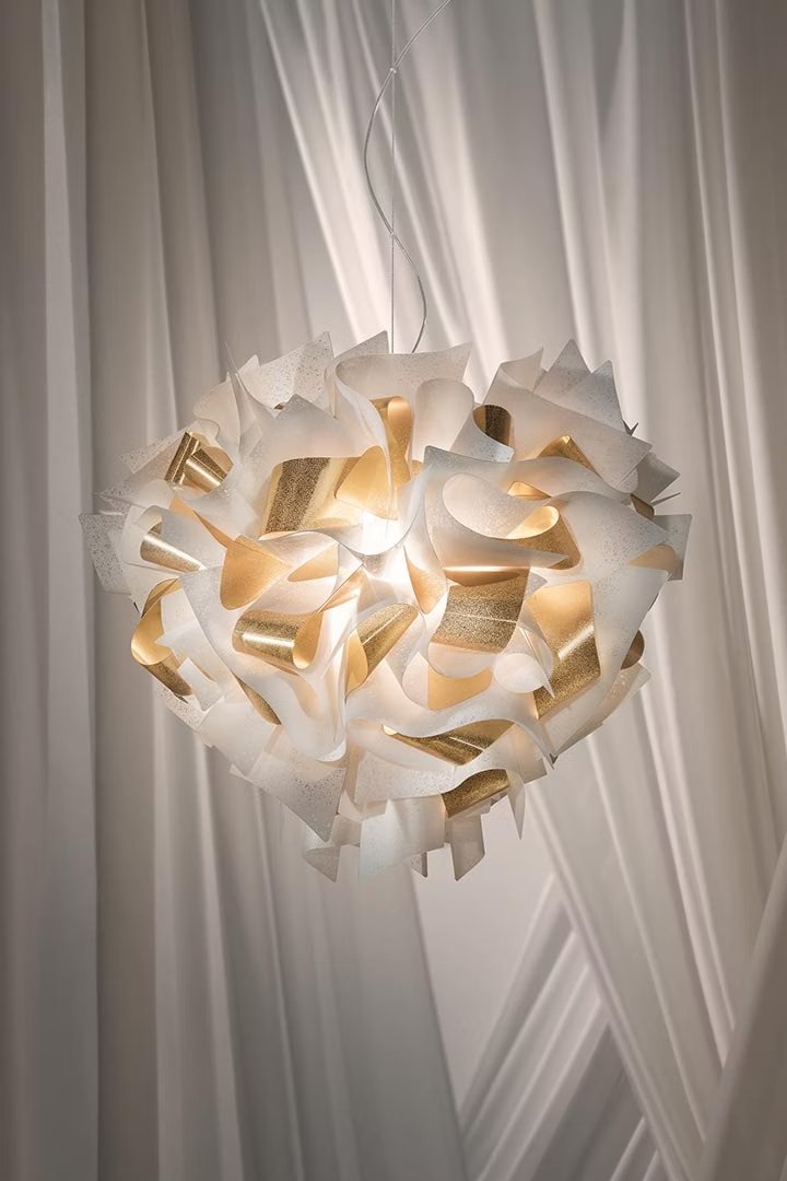 Introducing "Veli Aurea", a new finishing touch to an iconic collection of lamps crafted from avantgarde technopolymers, showcasing a white texture and golden lamina accents. Illuminate your space with the perfect blend of innovation and timeless design, and join the legacy of a modern and elegant masterpiece.