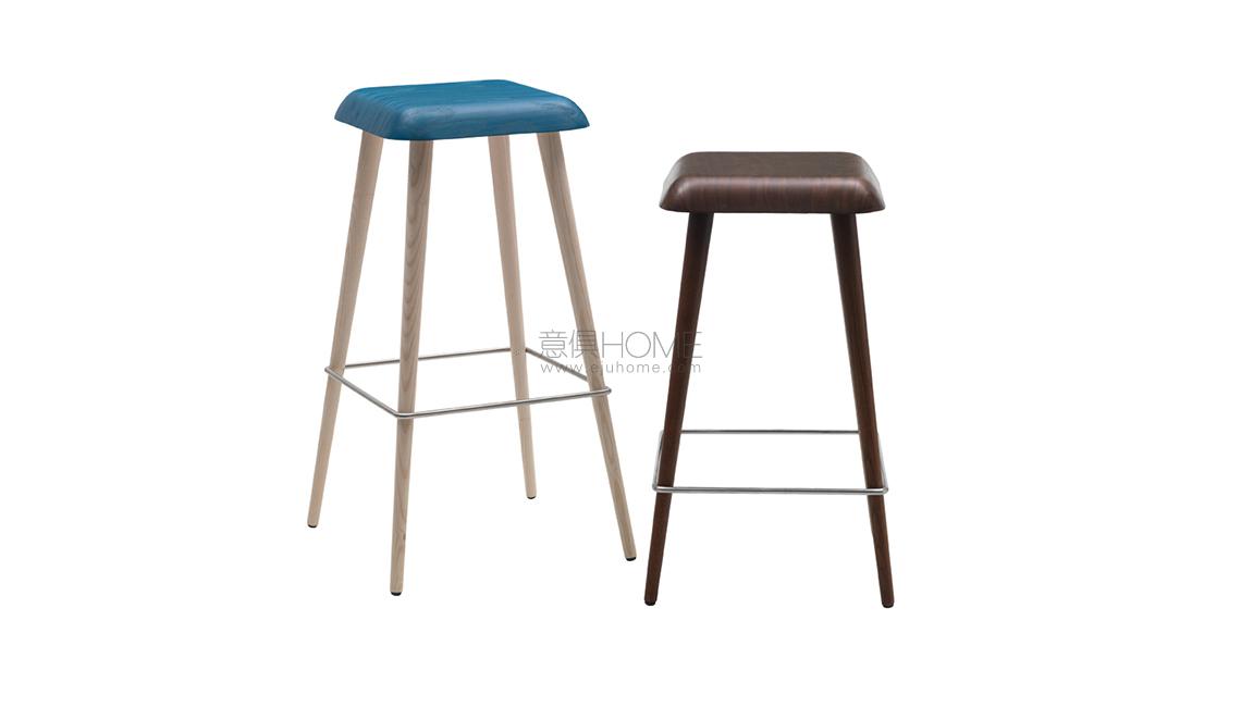 The base of the Daddy Longlegs stool is available in ash wood with a bleached, black-stained or wengé finish, or stained with Shanghai blue aniline.