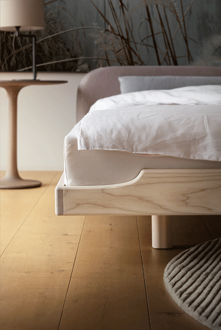 ECLAIR – the bed with soft contours. The ECLAIR bed is characterised by its concise outer contours. The minimalist frame construction encompasses the mattress on top. The foot section rises with a swing – a gesture like an embrace that offers security and support.