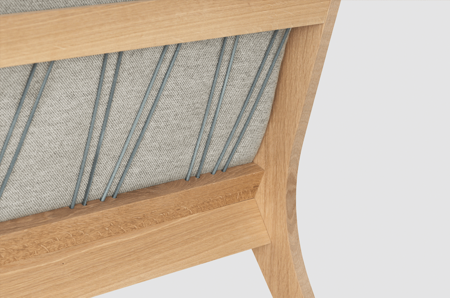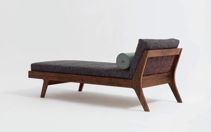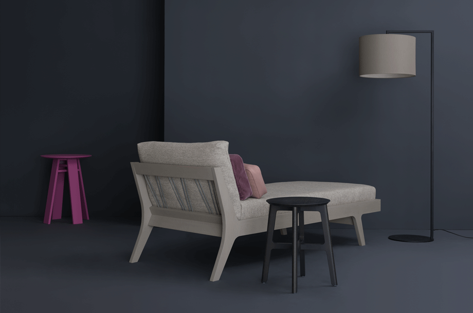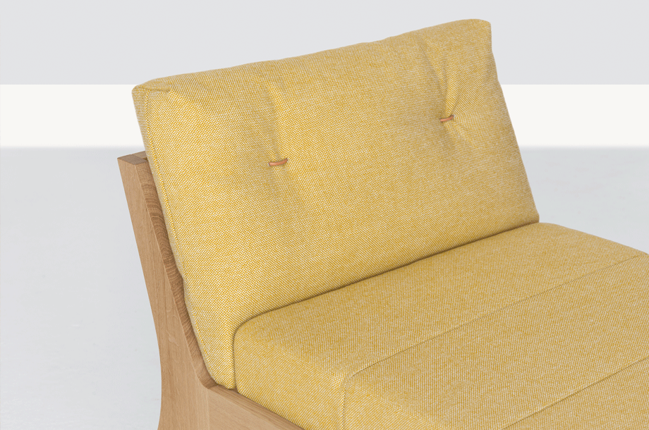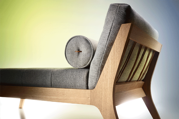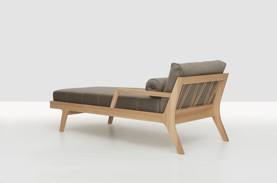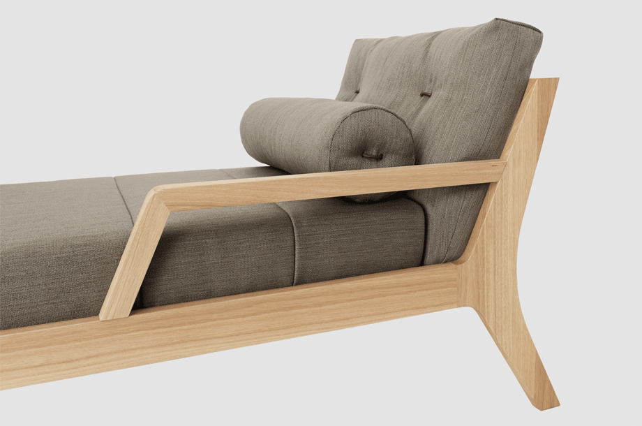 MELLOW DAYBED is a daybed and seating opportunity all at once and also doubles up as chaise longue that invites you to spend time. Its soft back pillow and upholstered roll offer comfort for sitting or reclining alike. Slim material profiles, fine lines, a delicate frame and soft upholstery materials as well as a nifty bend leather cording in the back part are the hallmarks of this daybed.