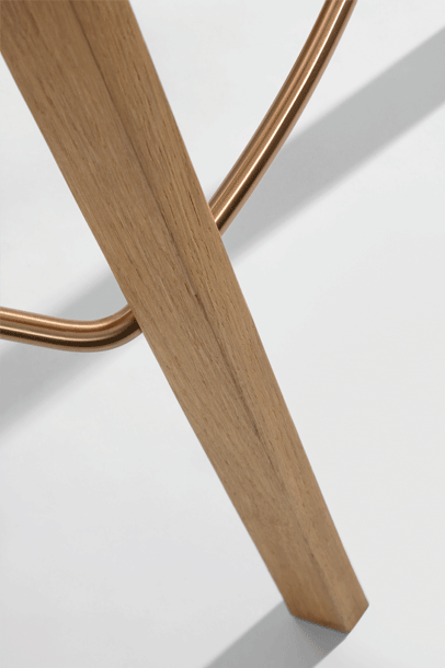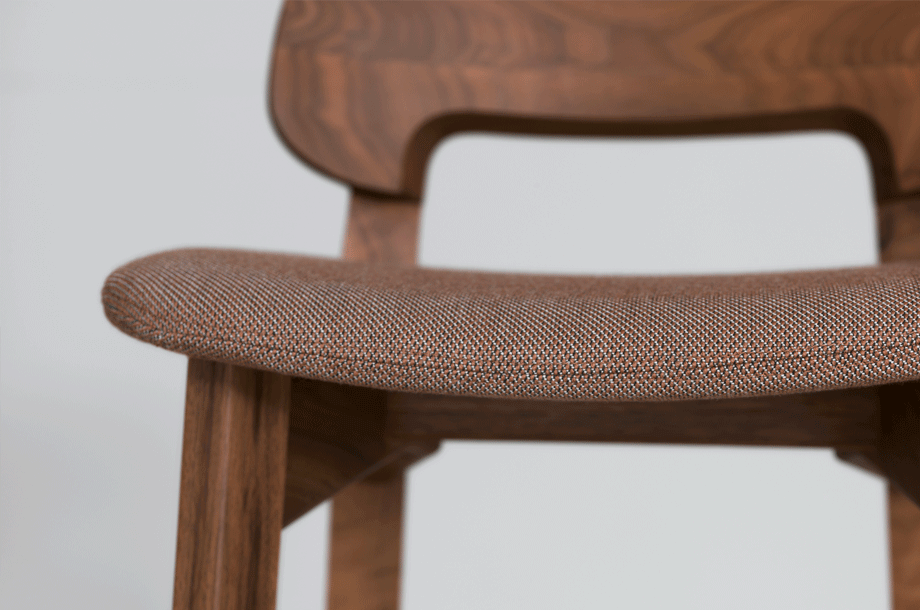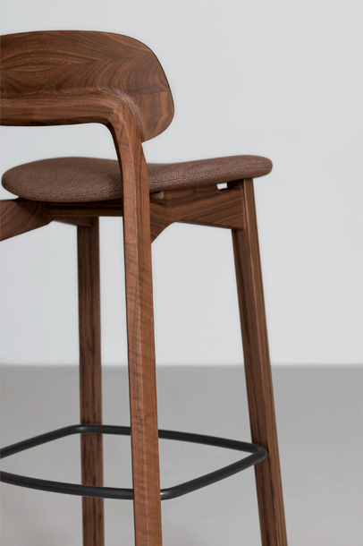 NONOTO BAR – the modulated bar chair. The NONOTO chair family is complemented with a new barstool: NONOTO BAR. The unique junction between frame and backrest lends the stool a sculptural character. A ring serves as footrest while also providing additional stability and adding another finish: both the walnut and the graphite black stain design come with a matt black powder coated footrest. Natural oak version and all other stains feature a rosegold coated footrest.