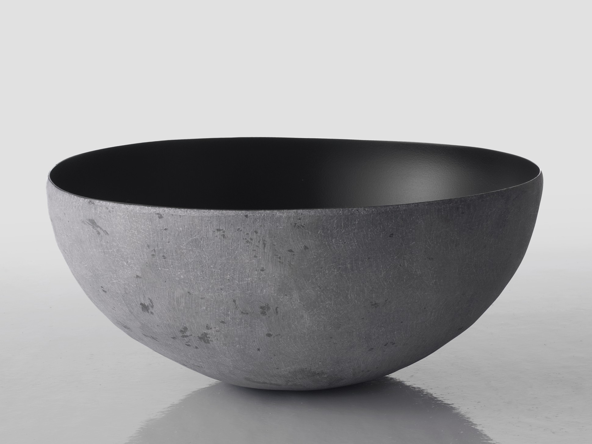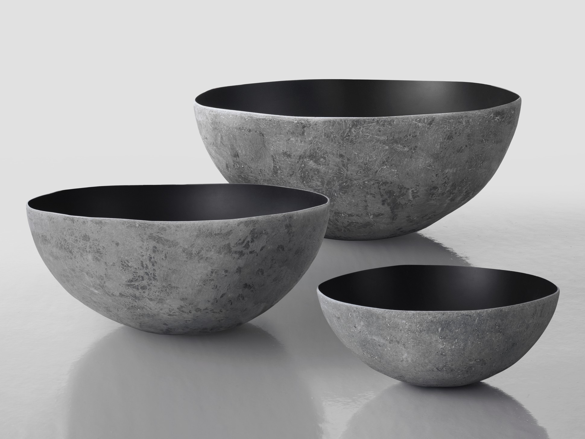 Ciotole in vetroresina in tre diverse dimensioni. La semplice forma, funzionale e versatile, si sposa con la materia e il suo cesello, che ricrea venature e ondulazioni, simili al tocco della natura.