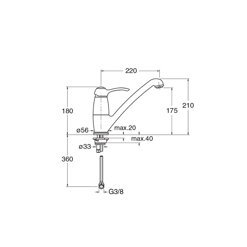 Miscelatore monocomando cucina, bocca orientabile, monoforo da piano, con miscelazione meccanica frontale, H. 180 mm