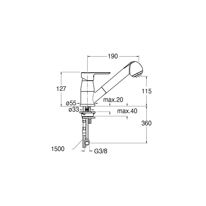 Miscelatore monocomando cucina, bocca orientabile, monoforo da piano, con miscelazione meccanica frontale e doccetta estraibile 2 getti, H. 127 mm