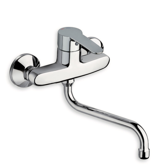 Miscelatore monocomando cucina, bocca curva orientabile, a parete, con miscelazione meccanica frontale. Punto di erogazione 220 mm