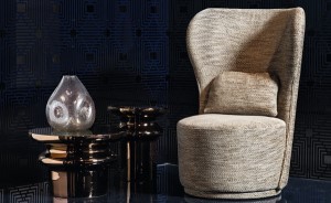 Poltrona girevole abbinata all’omonimo letto. Particolare disegno elicoidale ed avvolgente dello schienale. Prodotto e rivestito a mano da abili tappezzieri.