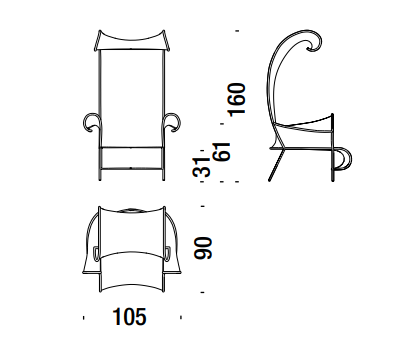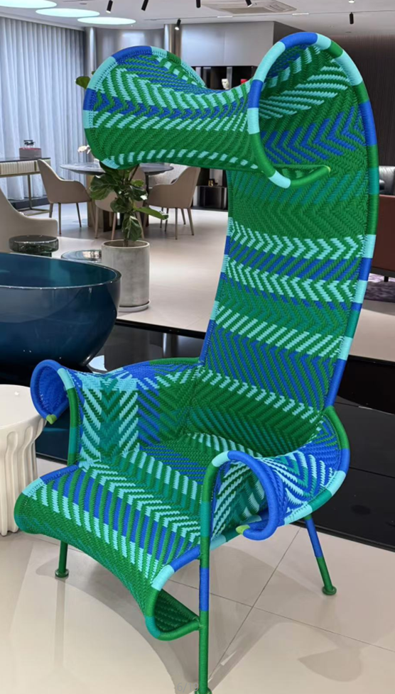 Struttura in acciaio verniciato e fili colorati in polietilene intrecciati a mano. Sottopiedi in PVC.