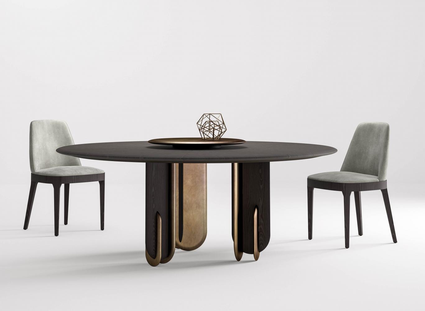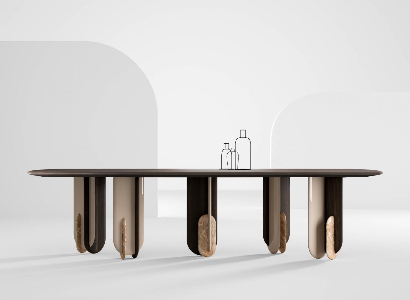 Table with rounded wooden top and modular legs with rounded section available in marble, natural, glossy lacquered and metallic lacquered wood. It is available in the round, rectangular or square version, and can be equipped with a Lazy Susan accessory.