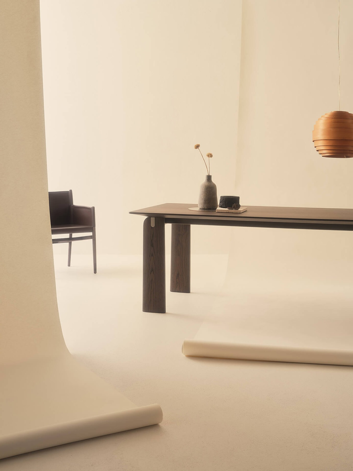 Jiku is a table designed by Federica Biasi, a modern proposal that brings together oriental inspirations and Nordic aesthetic rigor. Available in various sizes, with rectangular or oval tops, it can be placed in various spaces, thanks to the versatility and variety of finishes of the surface and material combinations. Its legs are in thermotreated oak, wide and slightly curved at the top, become a distinctive design element that gives the table a strong personality. A delicate metallic insert becomes a detail that aims to enrich the table's aesthetics: a modern element that creates an apparent visual contrast with the wood. Jiku represents a perfect combination of functionality and style, destined to become the focal point of a dining room or living space and the protagonist of conviviality.