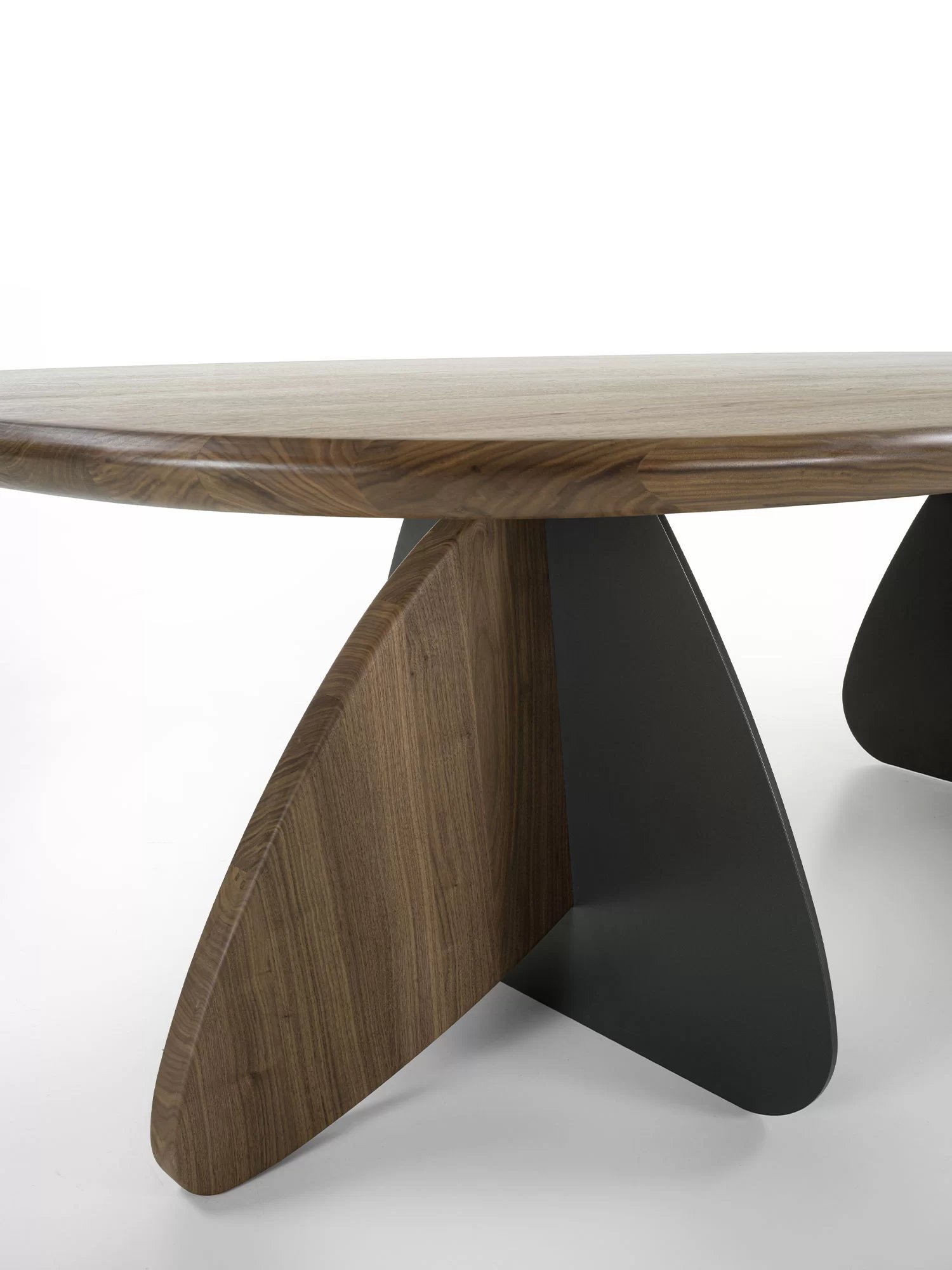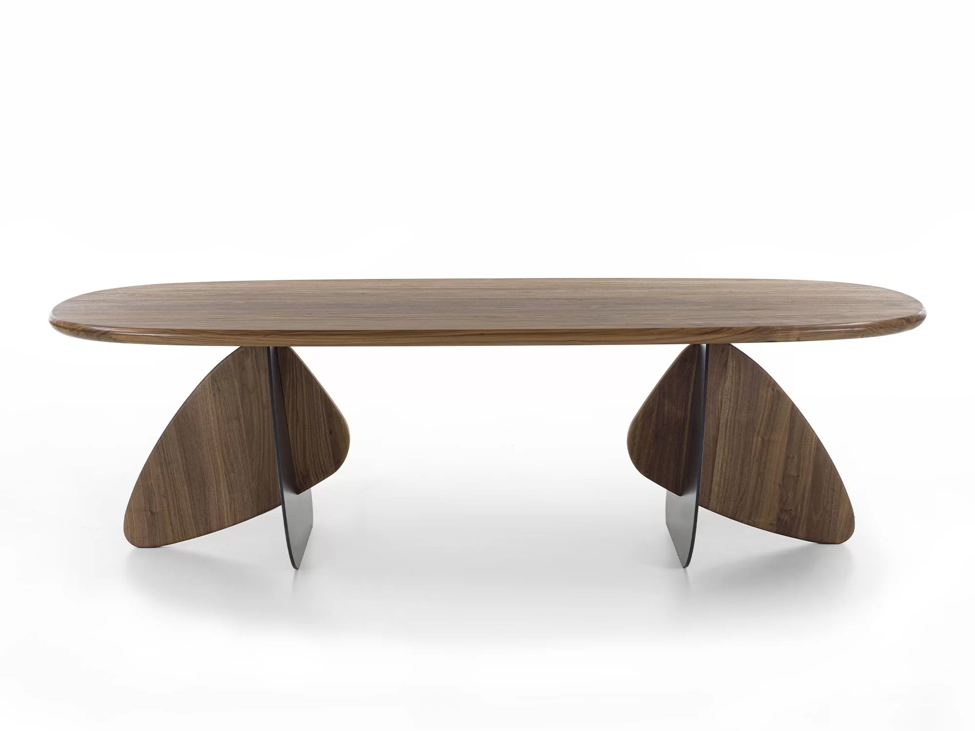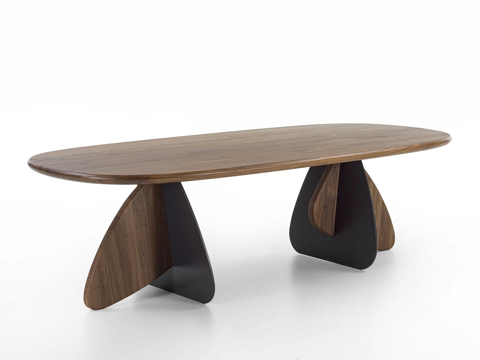 Tavolo con top in legno massello a liste incollate con bordi smussati, caratterizzato da due gambe composte ognuna da due volumi dalle forme morbide, una in ferro e l’altra in legno, che si incontrano a creare un gioco di incroci ispirato alle forme osservabili nella natura incontaminata.