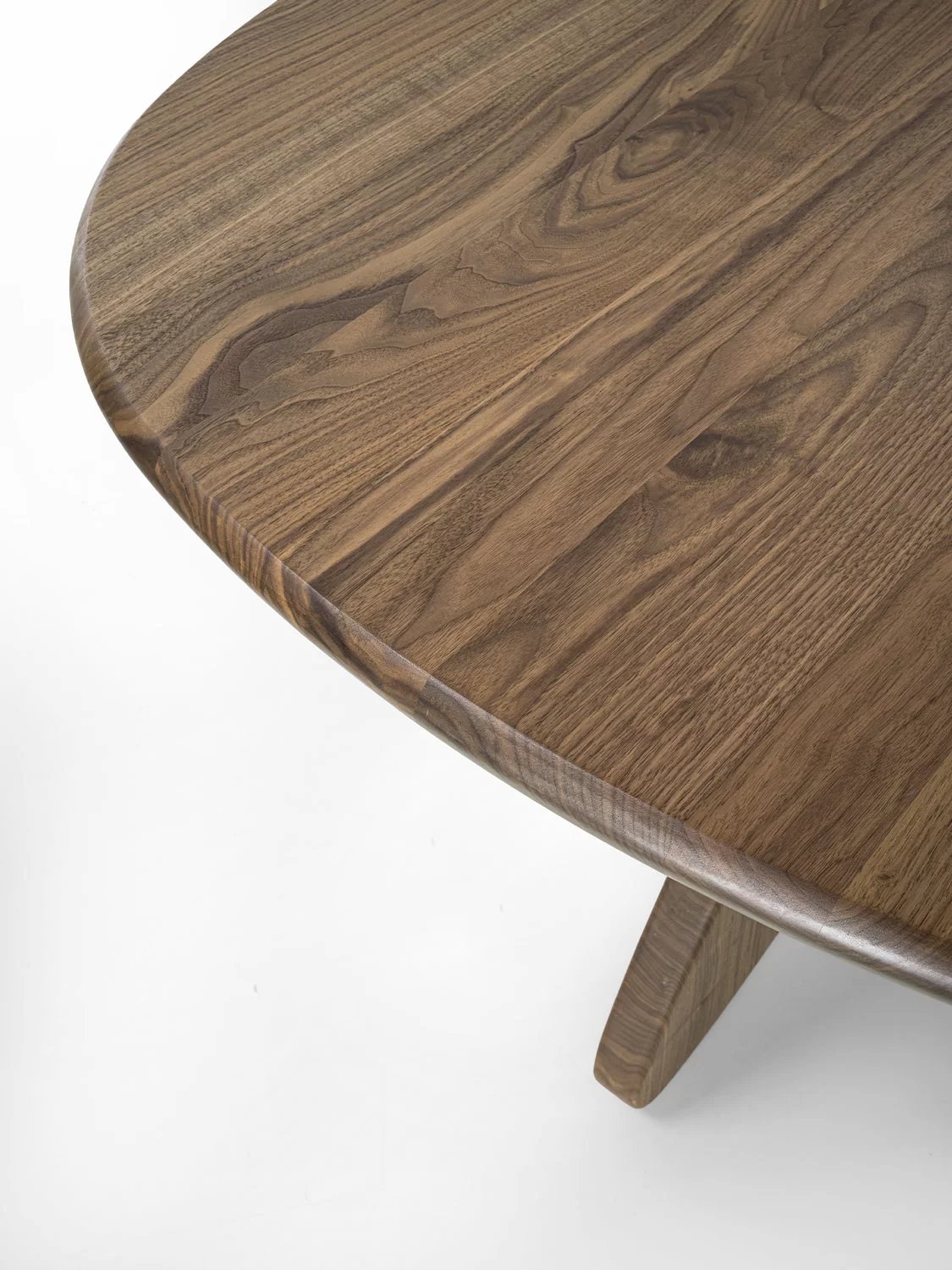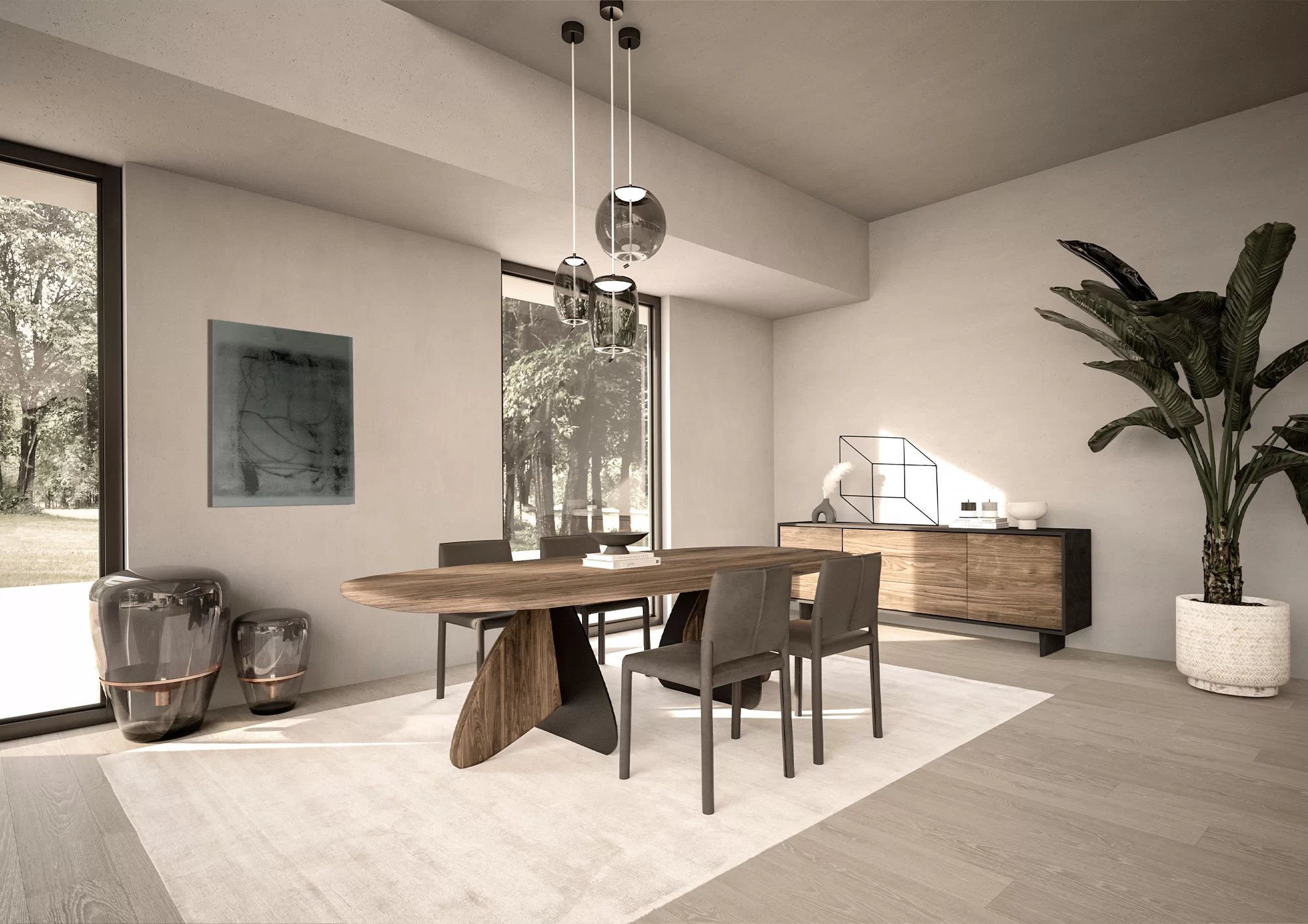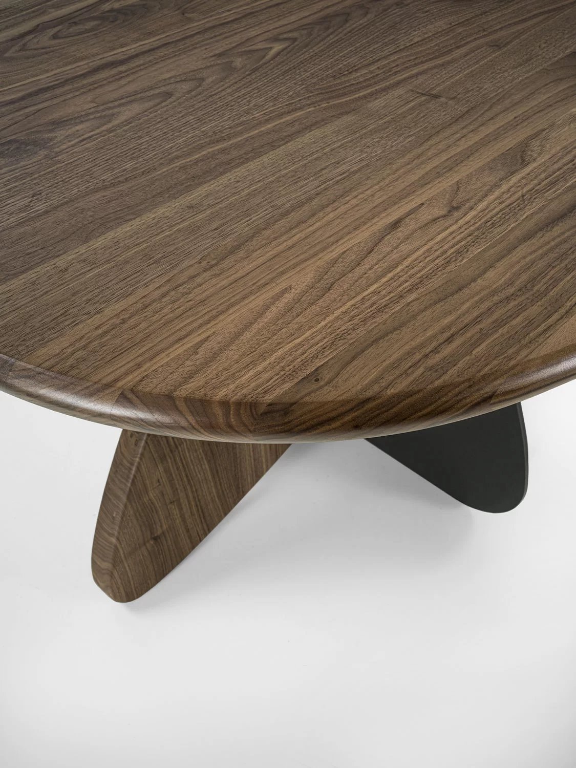 Tavolo con top in legno massello a liste incollate con bordi smussati, caratterizzato da due gambe composte ognuna da due volumi dalle forme morbide, una in ferro e l’altra in legno, che si incontrano a creare un gioco di incroci ispirato alle forme osservabili nella natura incontaminata.