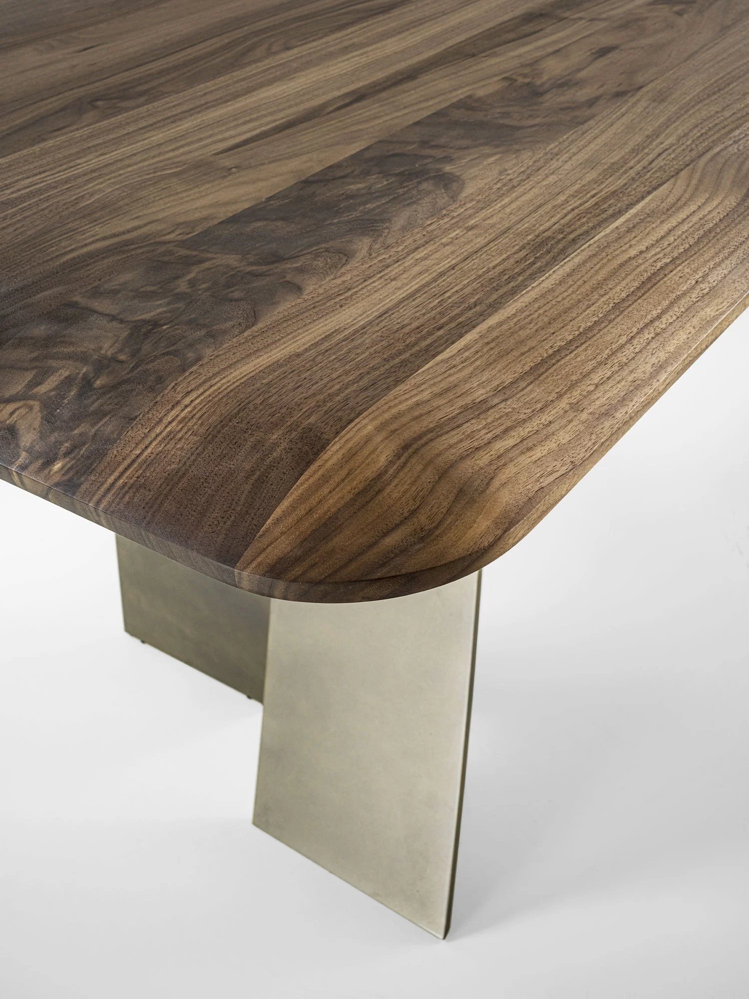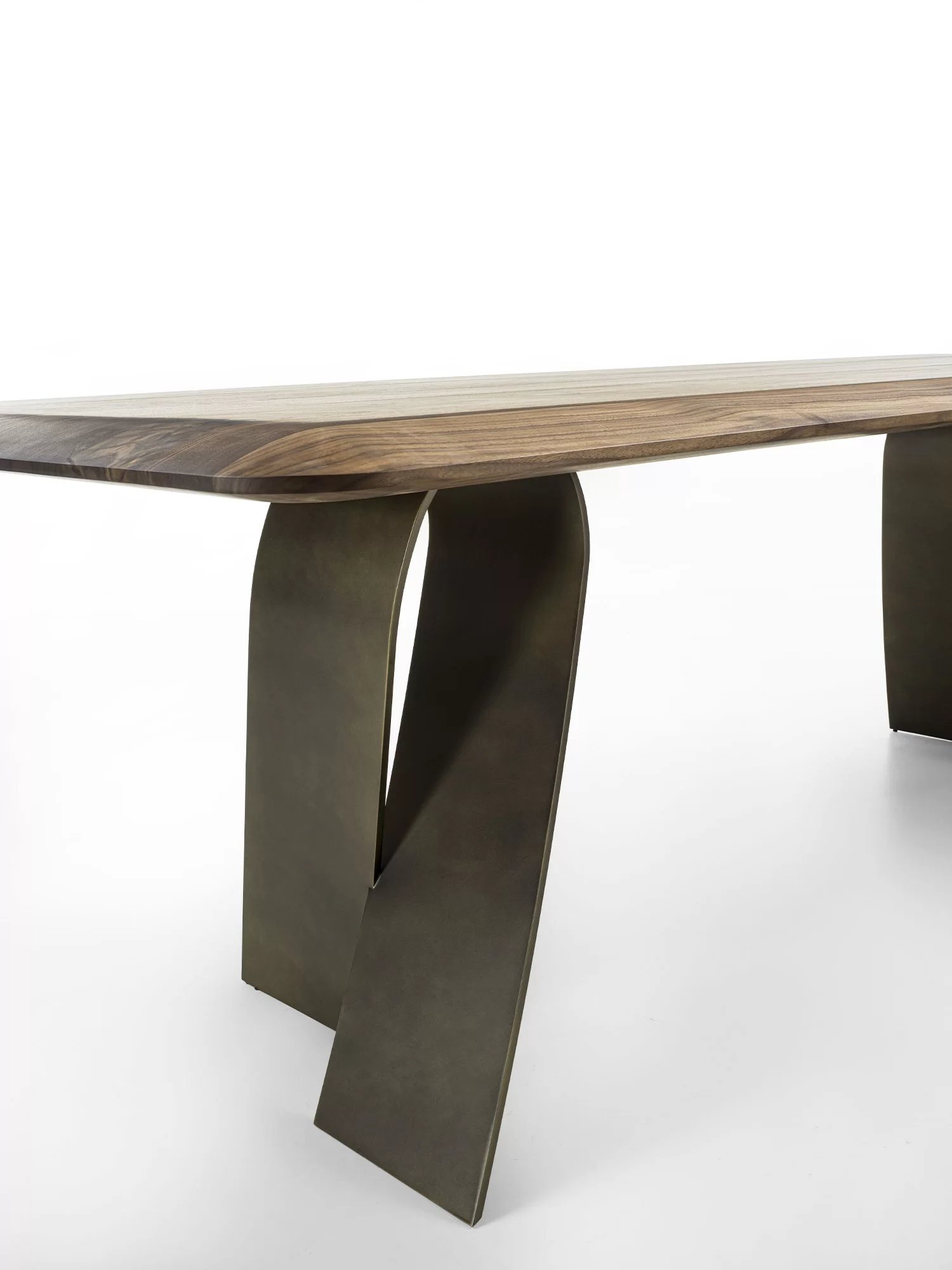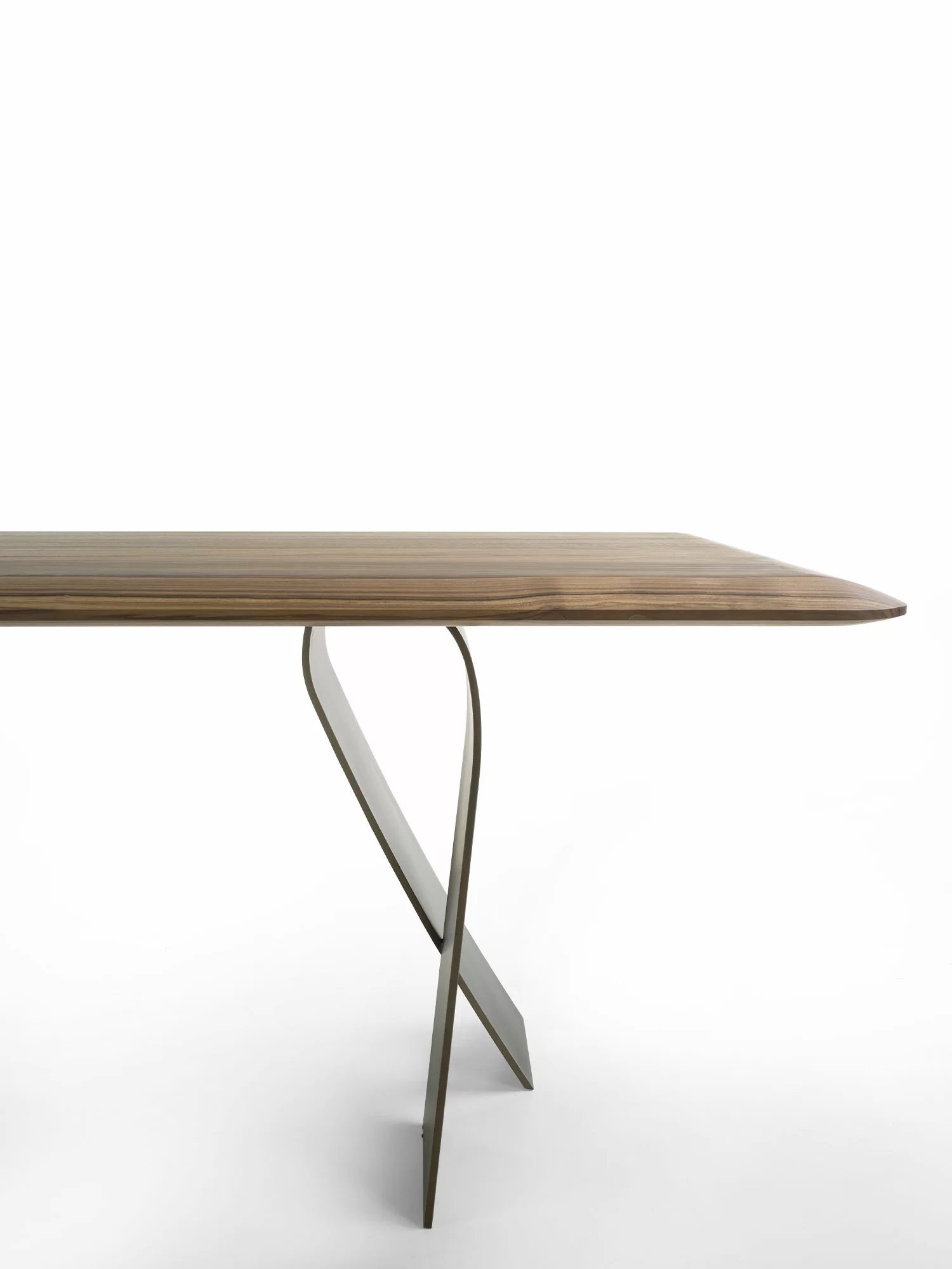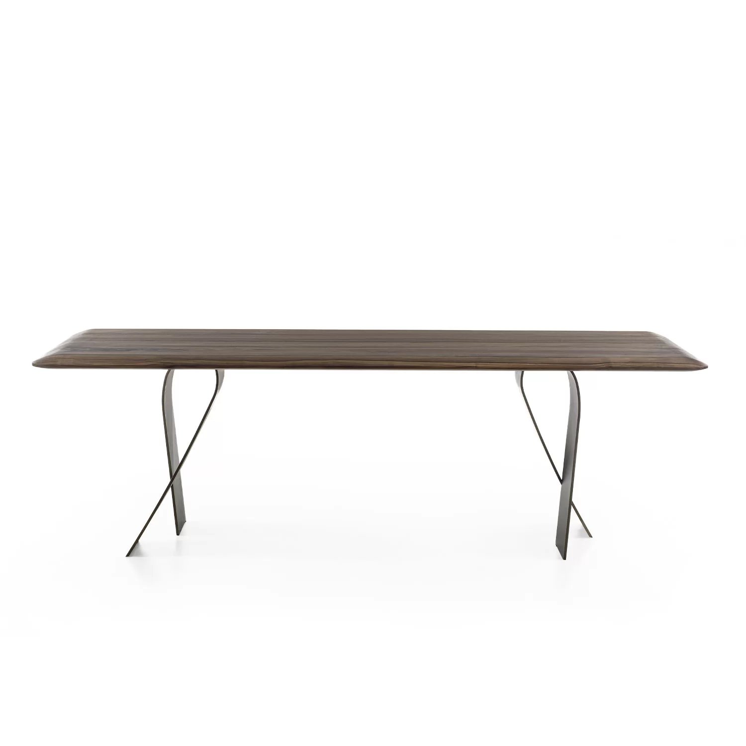 Tavolo con top in legno massello a liste incollate, caratterizzato da spessori assottigliati tramite lavorazione a saponetta per donare leggerezza e sinuosità, abbinato a gambe in ferro che si avvolgono su se stesse ad evocare la flessibilità di un nastro.