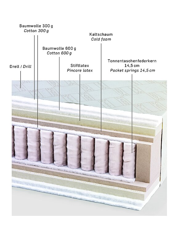 Pures Lebensgefühl. Die Sandmann Deluxe Pocket entspricht allen Anforderungen an idealen Schlaf. Der lange Federweg, der sich durch die luxuri?se H?he der Matratze ergibt, bringt einen spürbaren Komfortvorteil. Die Matratze tr?gt den K?rper verl?sslich auch durch unruhige N?chte. Tonnentaschenfedern garantieren die gewünschte Punktelastizit?t und die beidseitig des Federkerns eingesetzten hochwertigen Materialien sorgen für Stabilit?t und Langlebigkeit. Stiftlatex, zwei gro?zügige Schichten Baumwolle sowie eine Lage hochwertiger Kaltschaum sorgen für Geschmeidigkeit und optimale Durchlüftung.