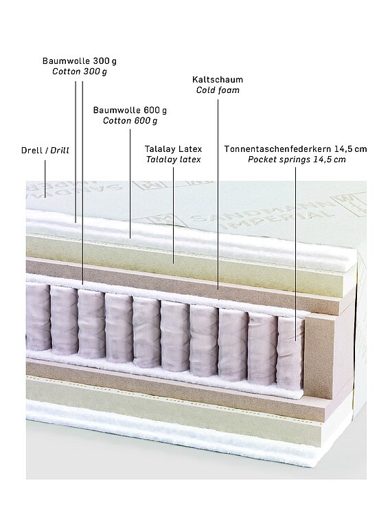 Den Kern der 35 cm hohen Matratze bilden in Baumwolls?ckchen eingen?hte Tonnentaschenfedern. Eingepackt ist dieser Kern in eine gro?zügige Schicht bauschige biologische Baumwolle. Eine hohe, beidseitige Lage Talalay Latex bringt Punktelastizit?t und h?chste Atmungsaktivit?t. Die einzigartige offene und runde Zellstruktur von Talalay Latex sorgt für Federkraft an den richtigen Stellen. Dadurch entsteht eine optimale Unterstützung, die die Druckpunkte des K?rpers entlastet. Besonders dicht gewebter Drell umschlie?t diese Matratze der Extraklasse als edle Hülle.