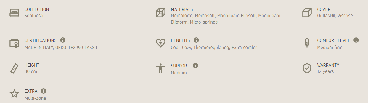 Sontuoso Primo 12 embodies all the wealth of a handcrafted tradition and combines it with the high quality of the materials and the use of the most advanced manufacturing technologies. The art of knowing how to help people sleep in style is authenticated by the elegant signature design and provides a soft support in 30 cm of height.
