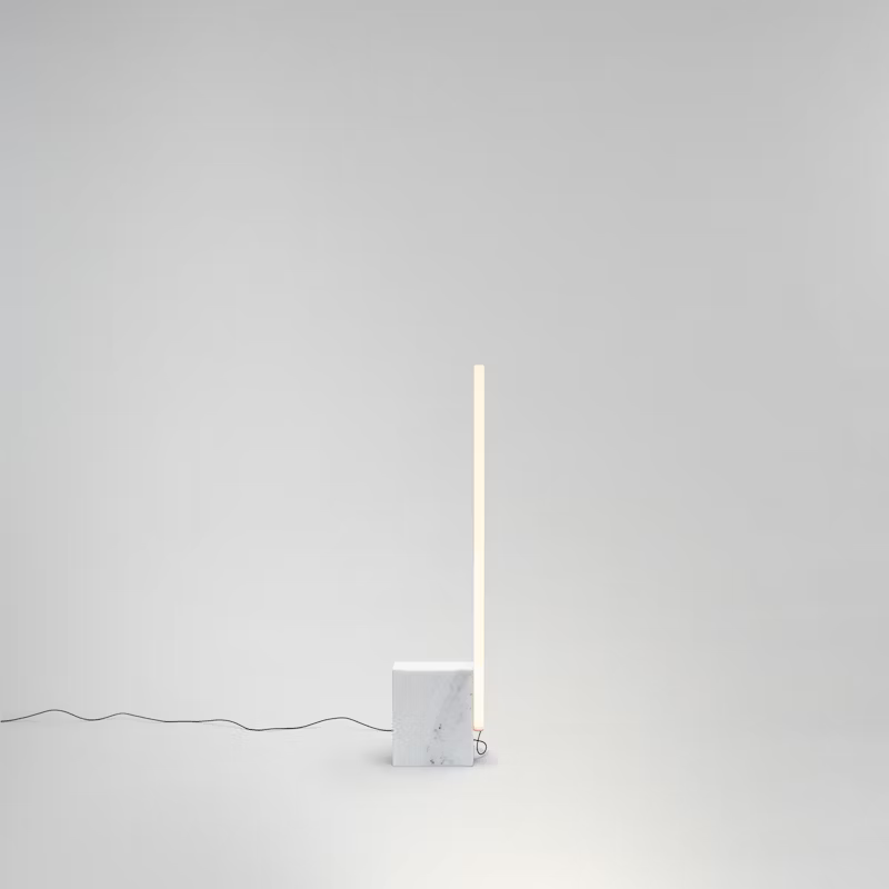 This family of floor lamps proposes an interchangeable lighting solution attached to a marble block. The exercise is an attempt to provide minimal support for the linear lighting elements through the simple gesture of touching the marble base with an invisible magnetic connection. The result is a distilled composition of basic elements.