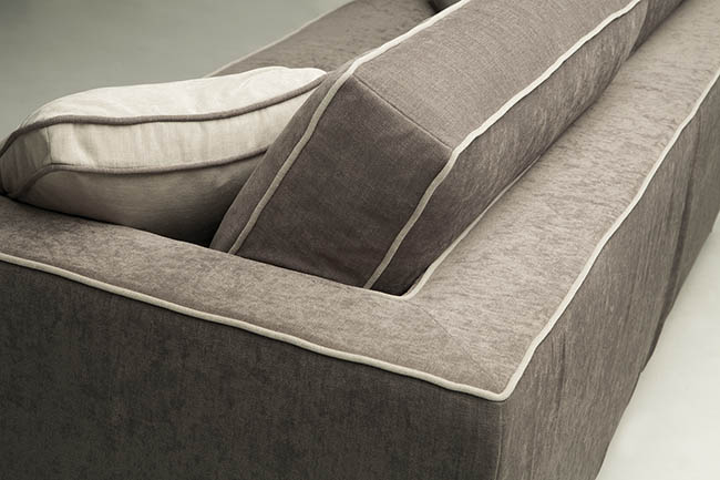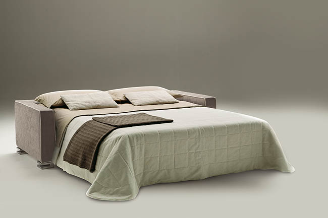 Garrison-2 has a particular removable cover and features feather seat and back cushions with polyurethane inserts and feet in black chrome finish upon request. Garrison-2 turns into bed with a 195 cm. long mattress and is also available in all sizes in fixed version.