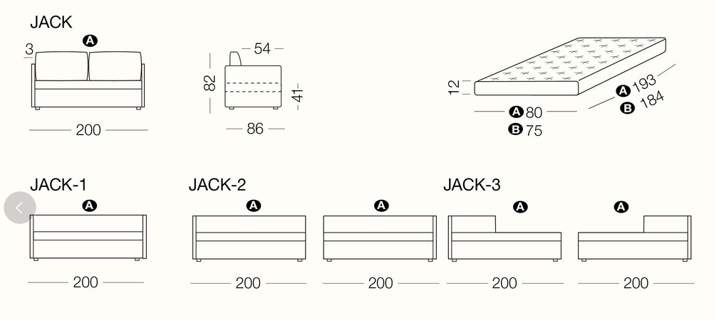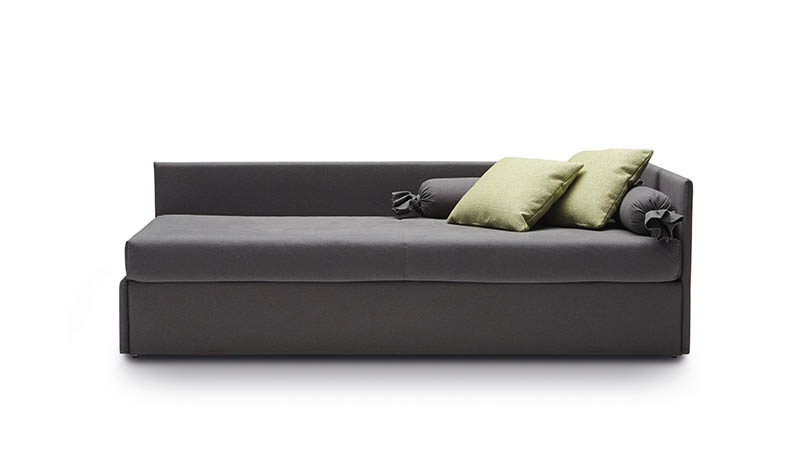Jack is a practical and versatile sofabeds program, including models with calm or romantic designs adapting to any furnishing need. Jack is offered in multiple versions: sofa, chaise, bed with slatted base, with headboard, with footboard, full, double or with drawers and can therefore suit many environments such as a colorful child’s bed, a comfortable den or simply to be used as a family room that offers a comfortable guest bed when needed. Jack may be adorned with a large variety of cushions types according to your own taste and with a second bedspread for the pullout bed.