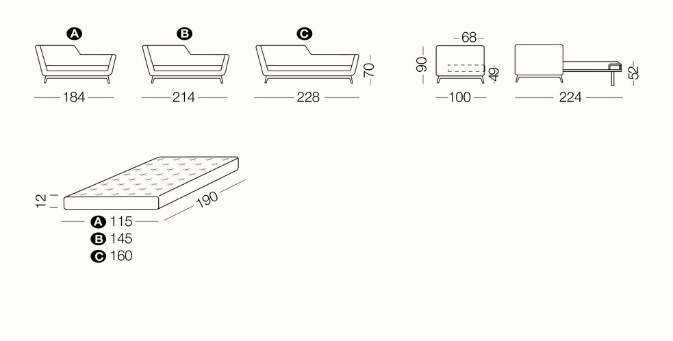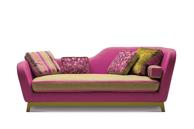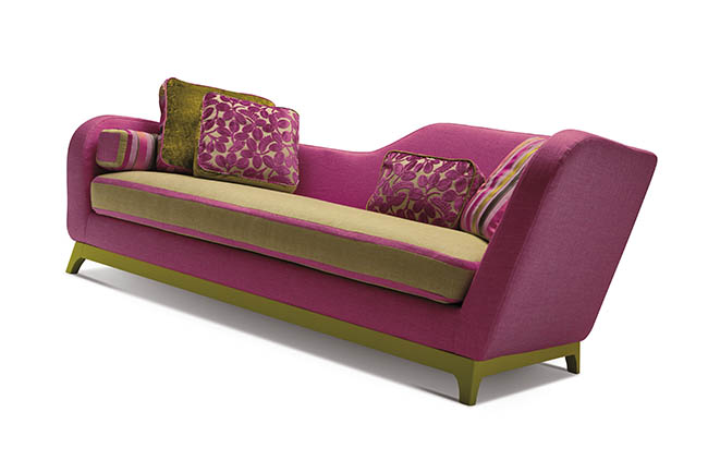 With its unique daybed shape, Jeremie recalls the Art Deco style, emphasized by its three variants: “Trendy”, turquoise fabric with special white details and orange base, “Fashion”, in shades of deep pink with floral patterns, striped details and green base, “Glamour”, in elegant taupe and brown colours. Featuring a seat in feather and high resilient polyurethane foam, feather backrest pillows and solid beech wood base in standard wenge finish or RAL color on demand, Jeremie is available in two widths, 214 cm and 228 cm and in several contemporary or classic fabrics. Jeremie is also available in bed version with a 190 cm long mattress.