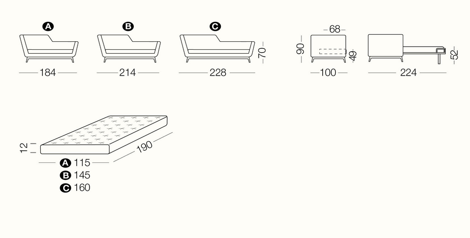 With its unique daybed shape, Jeremie recalls the Art Deco style, emphasized by its three variants: “Trendy”, turquoise fabric with special white details and orange base, “Fashion”, in shades of deep pink with floral patterns, striped details and green base, “Glamour”, in elegant taupe and brown colours. Featuring a seat in feather and high resilient polyurethane foam, feather backrest pillows and solid beech wood base in standard wenge finish or RAL color on demand, Jeremie is available in two widths, 214 cm and 228 cm and in several contemporary or classic fabrics. Jeremie is also available in bed version with a 190 cm long mattress.