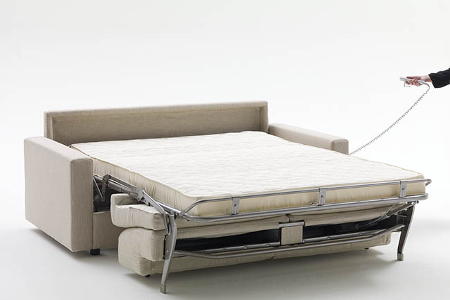 Lampo Motion is a sofa that brings style and sophistication to a modern setting. Operating the electric motor with its remote control, without removing any of the cushions, Lampo Motion turns effortlessly into a conventional bed with a 200 cm. length mattress. The cover is completely removable and washable according to the desired fabric.