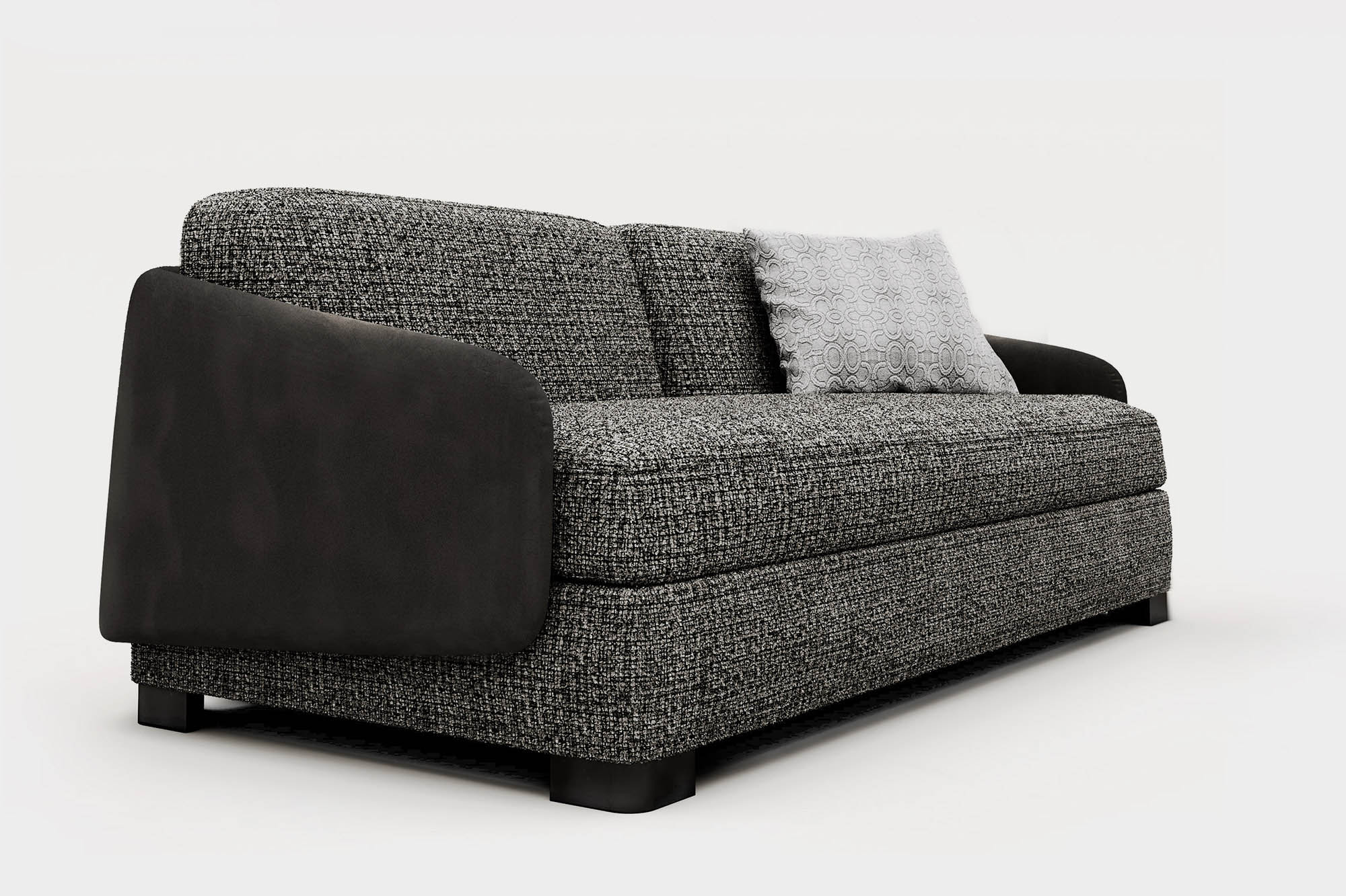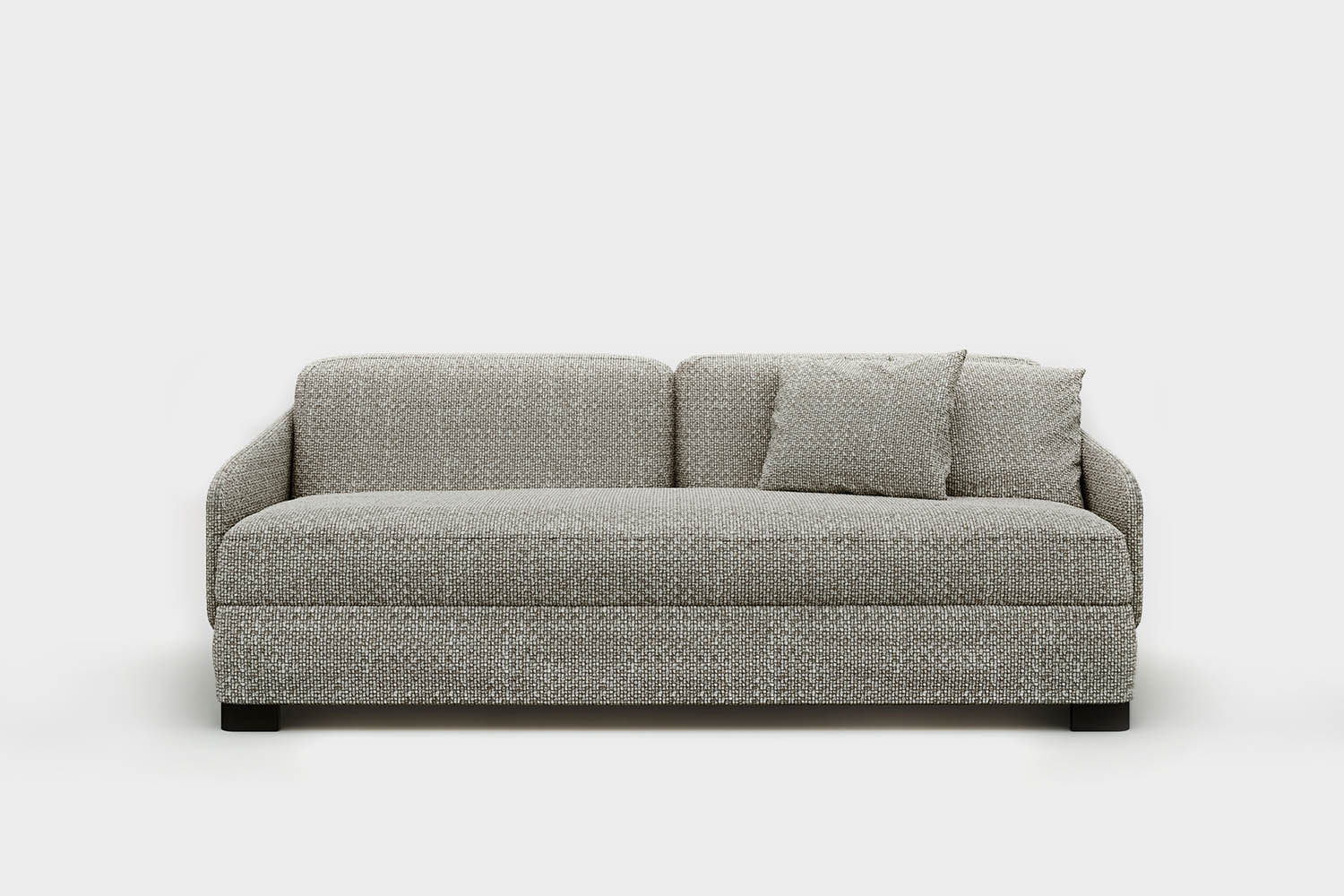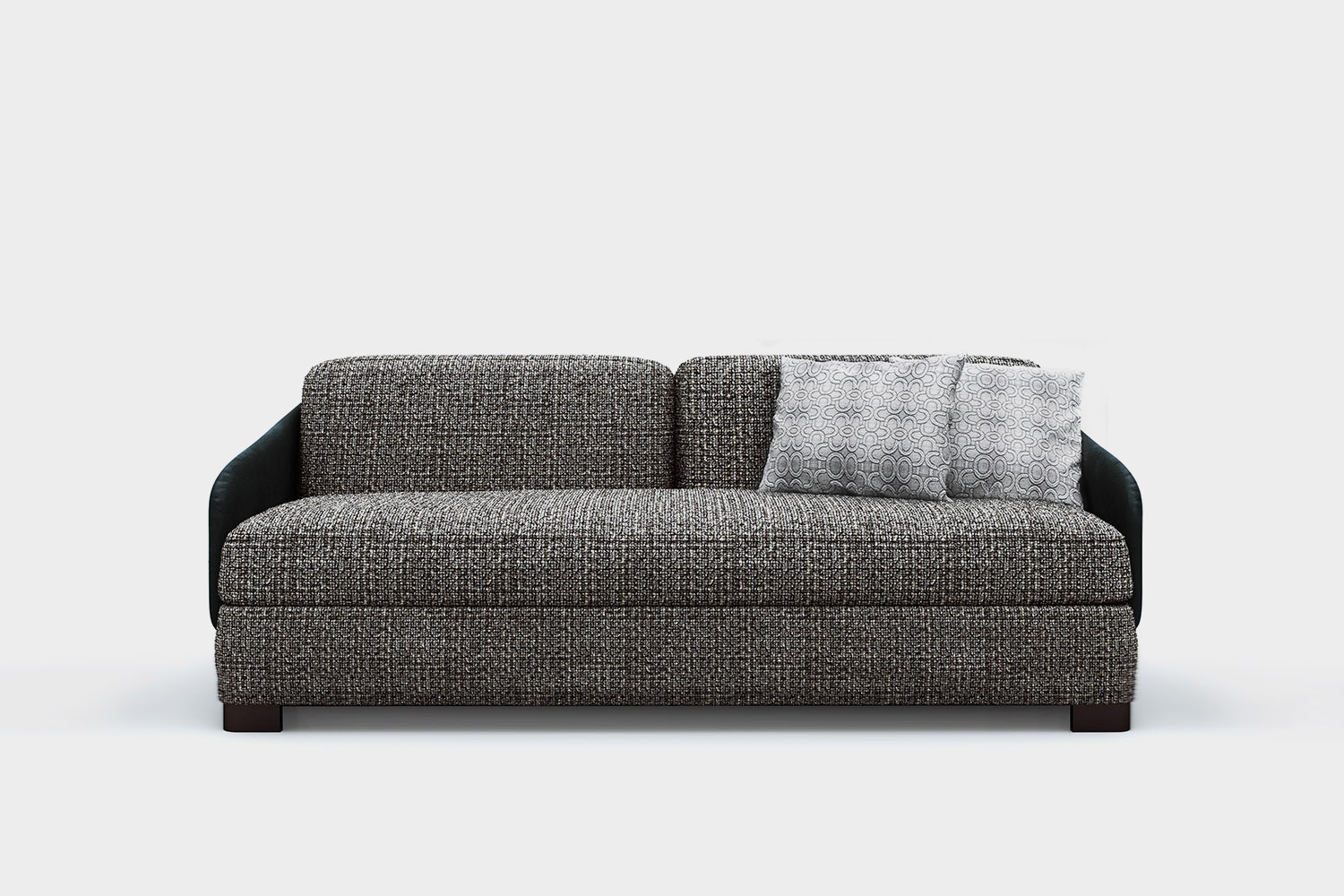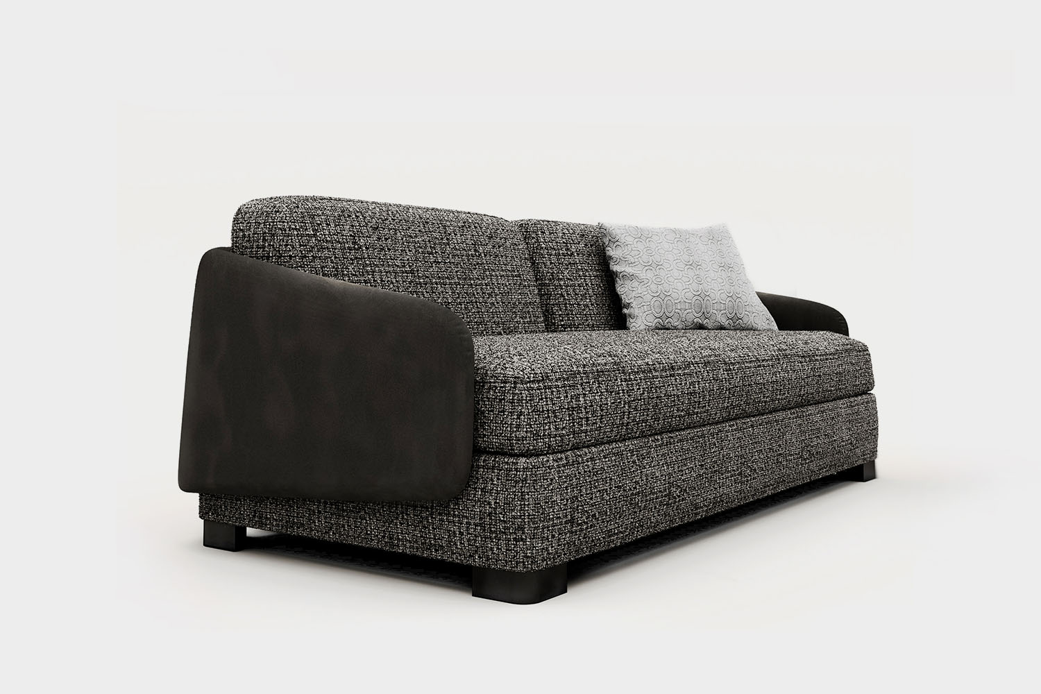 Vivien is a sofa bed with Lampolet mechanism, featuring a rounded backrest which continues into the armrest; the sofa can be produced by combining different materials such as fabric, leather and microfibre. The feet are made of metal with black nickel finish. By simply rotating the back, without removing any of the cushions, Vivien converts into a conventional bed with a 200 cm long mattress. The removable cover is washable according to the fabric selected. Vivien is a sofa bed that can be dismantled for easy delivery and is also available as a sofa.