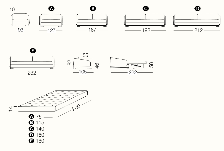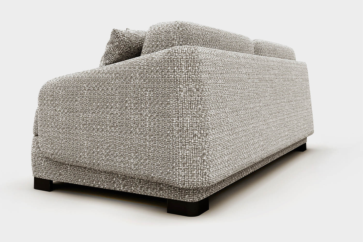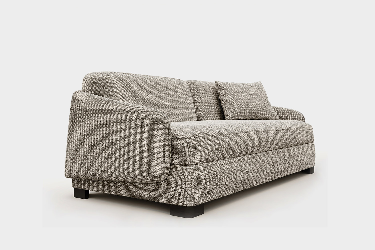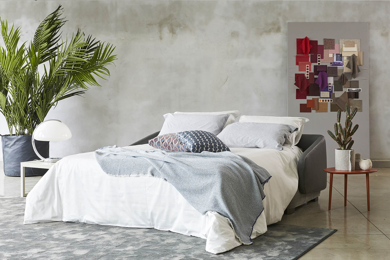 Vivien is a sofa bed with Lampolet mechanism, featuring a rounded backrest which continues into the armrest; the sofa can be produced by combining different materials such as fabric, leather and microfibre. The feet are made of metal with black nickel finish. By simply rotating the back, without removing any of the cushions, Vivien converts into a conventional bed with a 200 cm long mattress. The removable cover is washable according to the fabric selected. Vivien is a sofa bed that can be dismantled for easy delivery and is also available as a sofa.