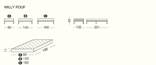 Willy Pouffe has an easy-to use front-opening mechanism, while the convenient fold away mattress avoids sitting on the bedding. The 11 cm. high foam mattress has a removable lining and is covered in a fabric of customer’s choice, while the bed base has a 100% cotton ecru quilt cover.