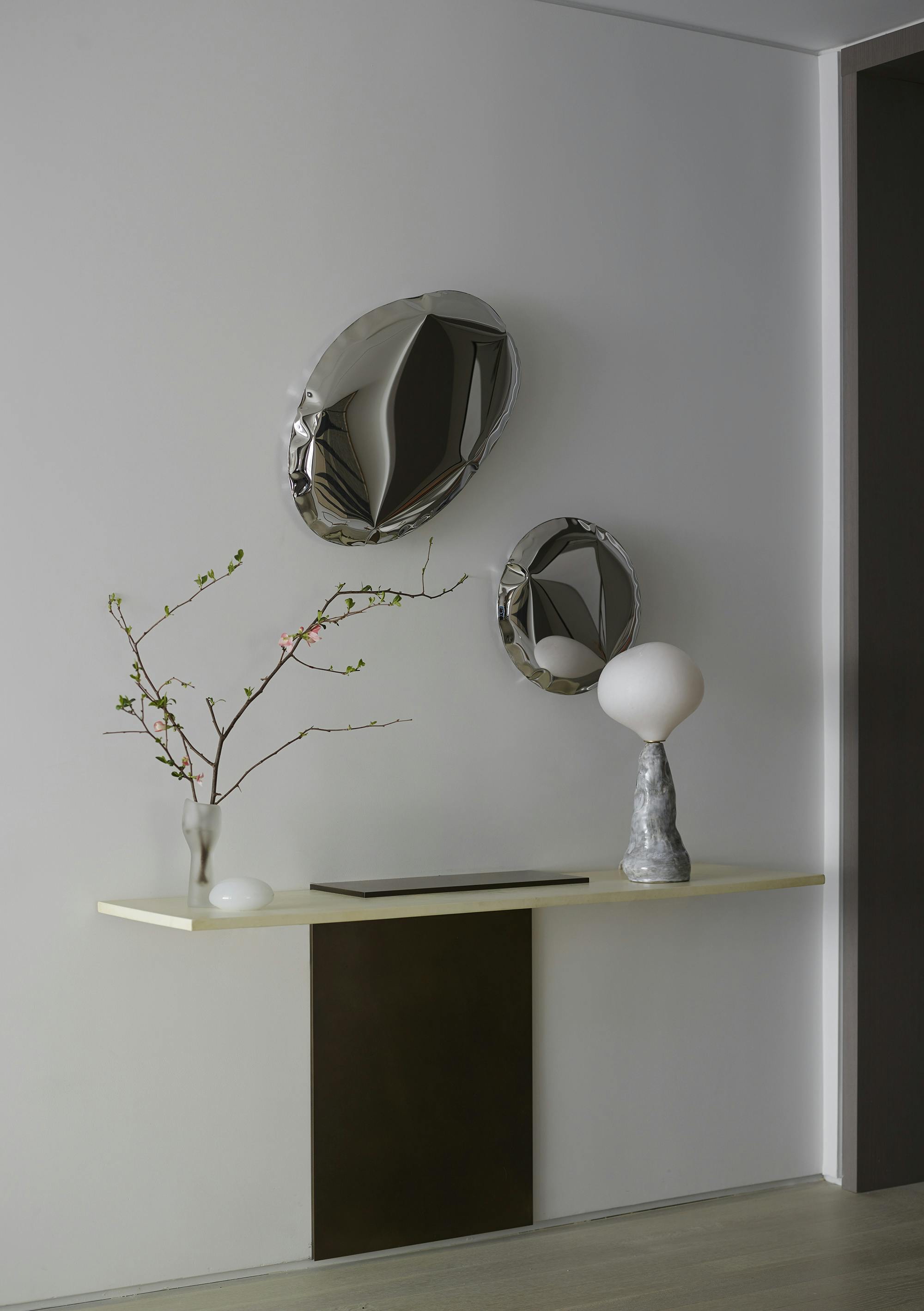 TAFLA O is a series of bionic mirrors of organic shapes inspired by natural shapes of liquid drops. Mirrors from the TAFLA collection are made of stainless steel polished to a high gloss and come in seven different sizes. They can be arranged in an artistic personalized composition or exposed on a wall as a single sculpture-like mirror. They will fit contemporary private spaces, as well as restaurants, bars and hotel rooms. You can enjoy the charm of the classic Inox finish or a colour selected from the available palette. The TAFLA O mirror looks mesmerizing as a single object, but also in layouts that make up constellations of them.