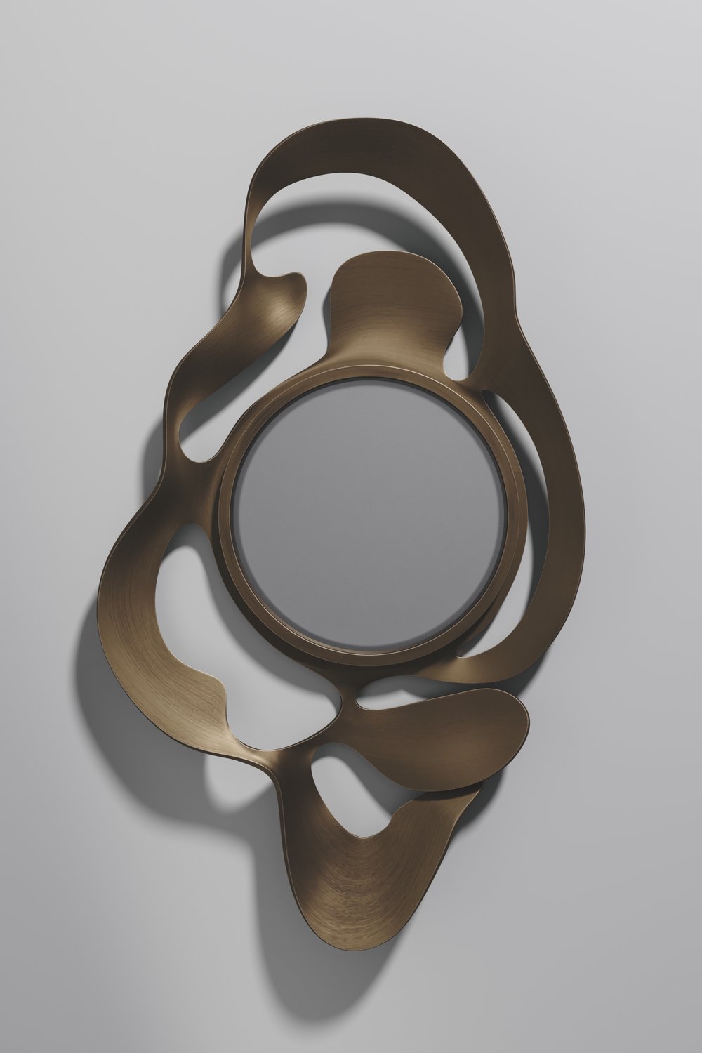 The Leaf Mirror by Kifu Paris is a dramatic and organic piece. The shagreen or shell with bronze-patina bass inlay mixture creates a striking appearance as it emulates a whimsical interpretation of intertwining branches. This piece is designed by Kifu Augousti the daughter of Ria and Yiouri Augousti.
