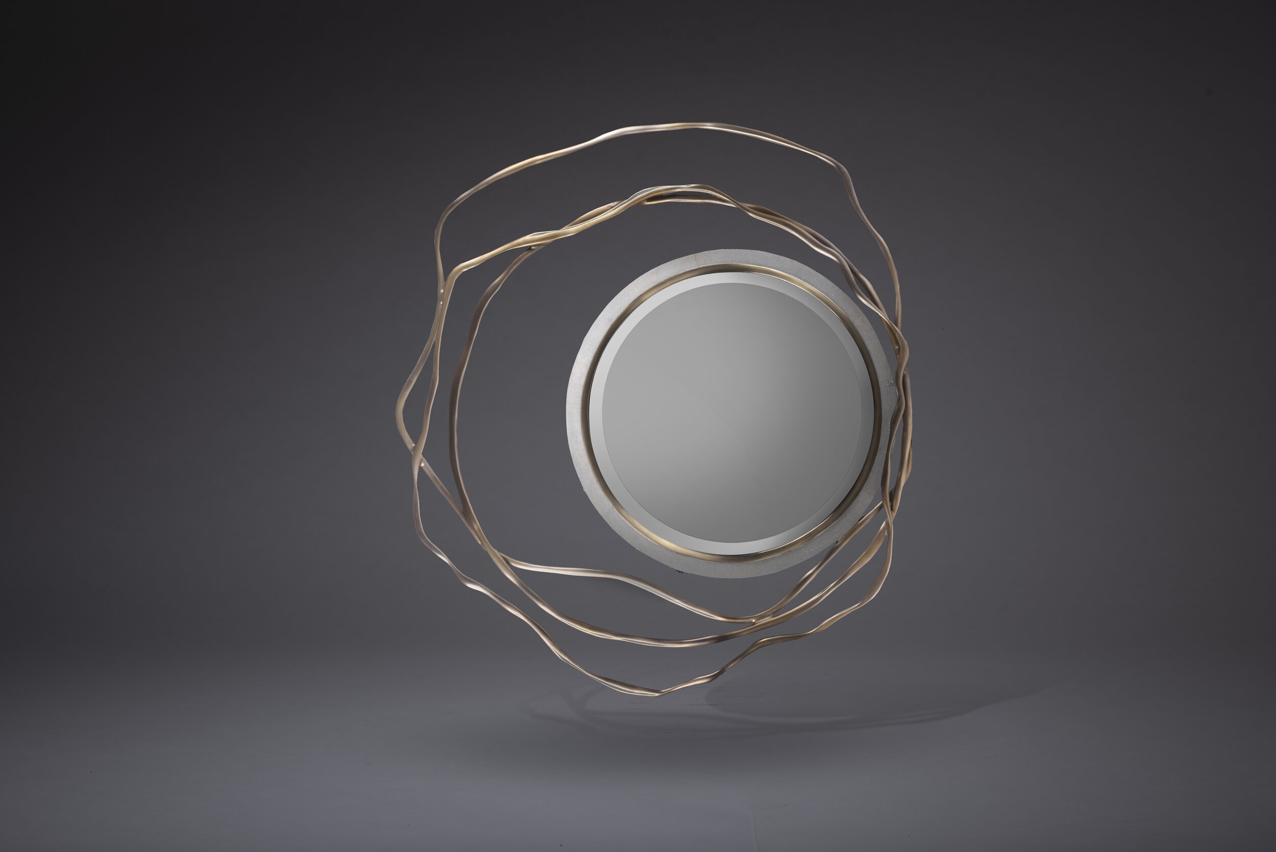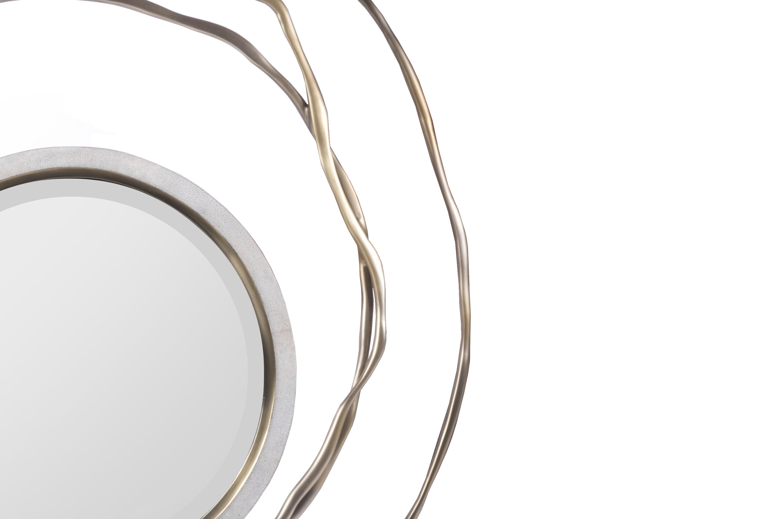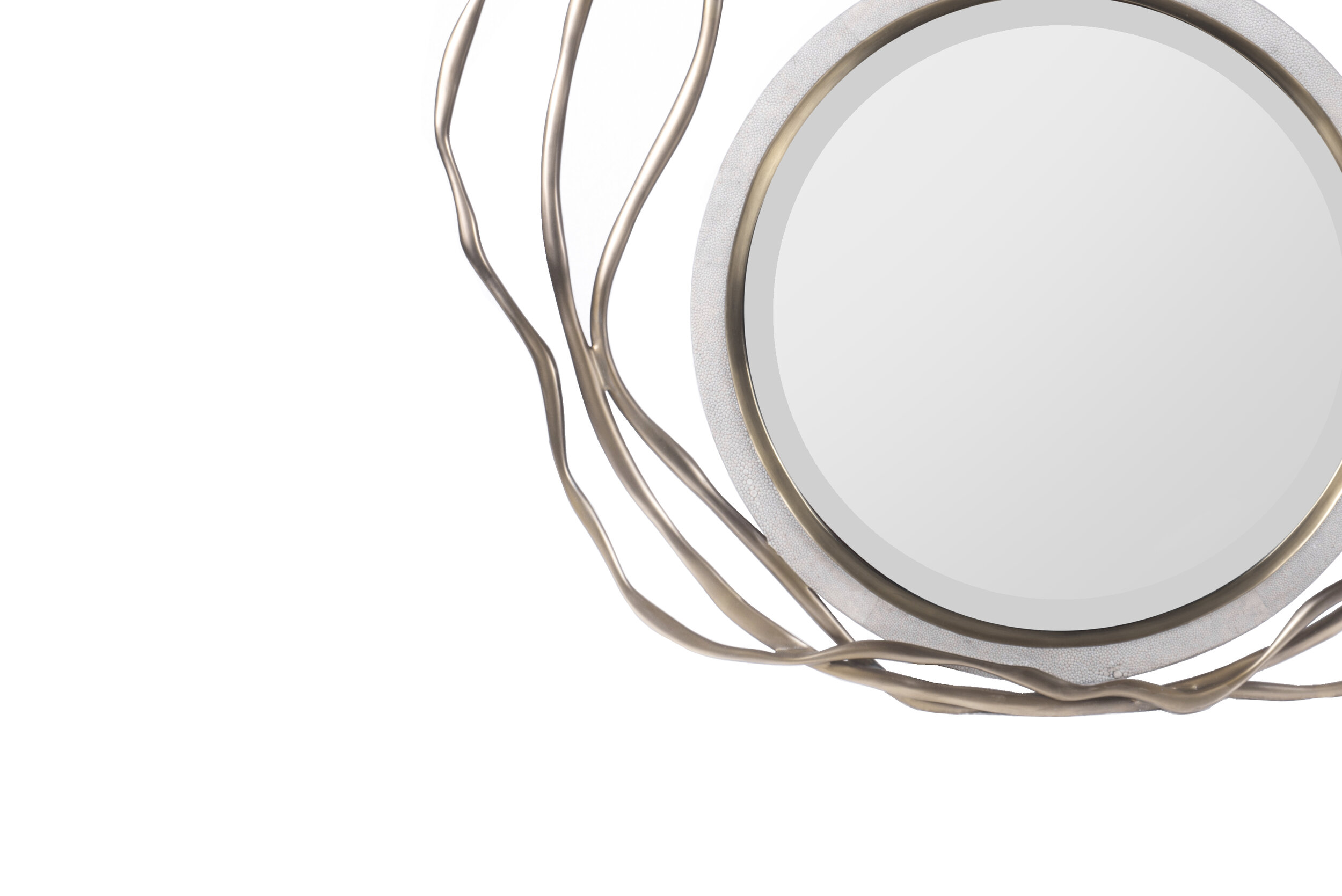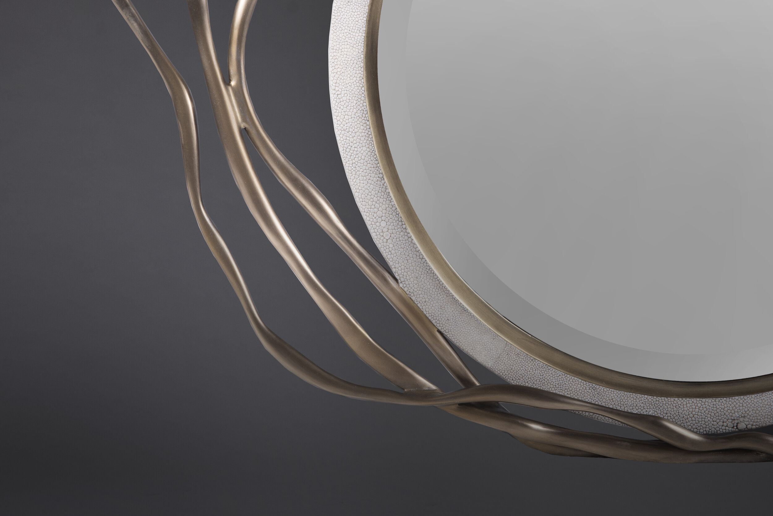 The Dargelos Mirror is a statement piece with its ethereal inspired roots. The intertwinement of the twisted bronze-patina brass wires, against the circular cream shagreen frame of the mirror creates a truly whimsical feel, white retaining its elegance. The shagreen is hand-dyed by artisans creating a one of a kind piece each time.
