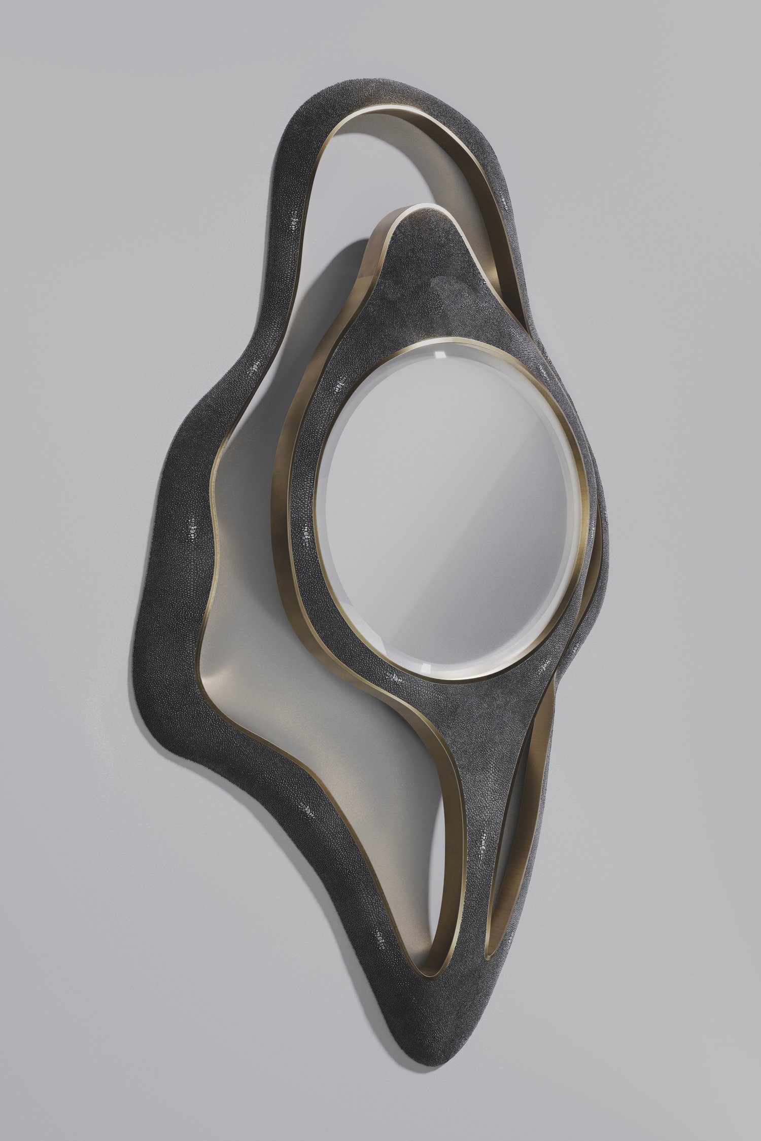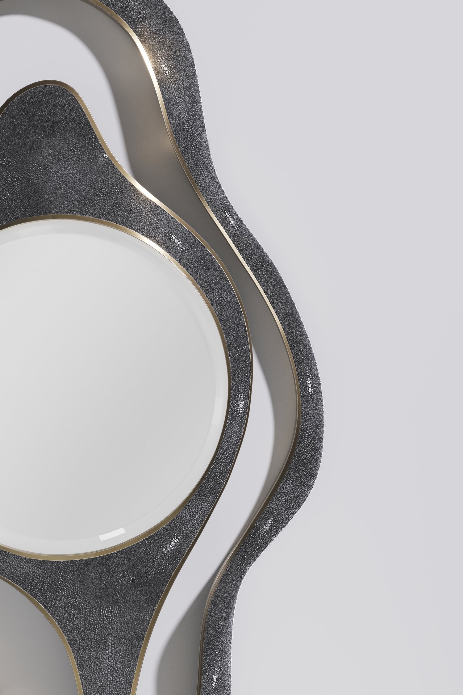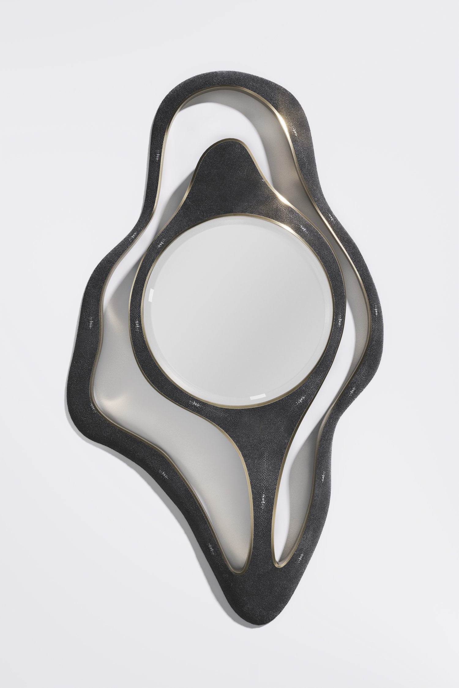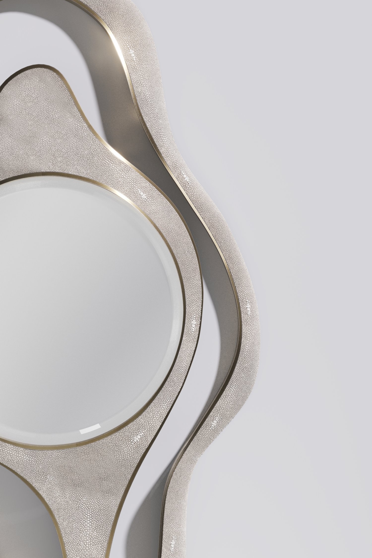 The Suspended mirror by R&Y Augousti is a dramatic and sculptural piece. The piece can be hung on the vertical or horizontal, and its ornate details cast subtle shadows on the wall. This piece is inlaid in a mixture of cream shagreen and bronze-patina brass. Custom color and sizing available on request.