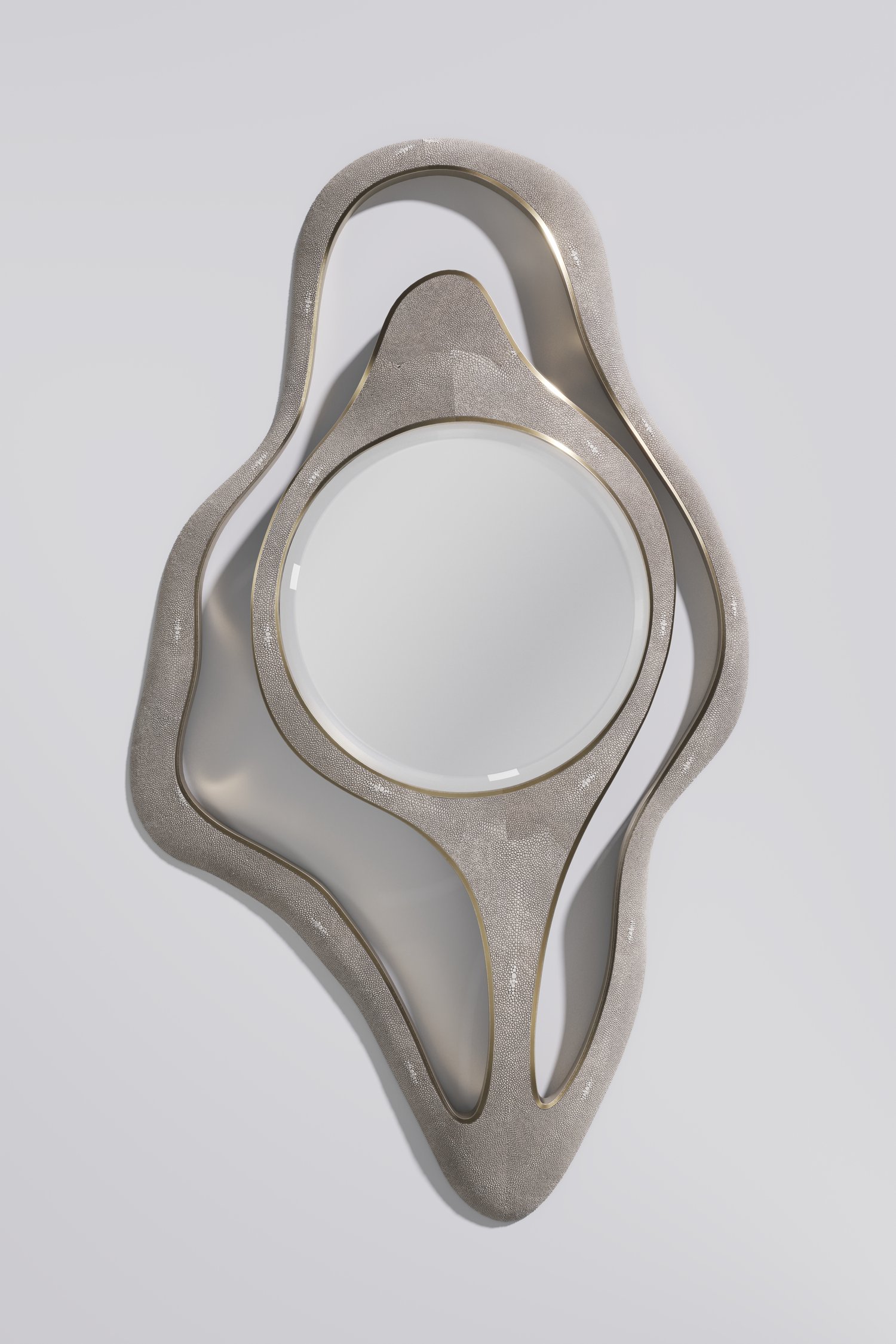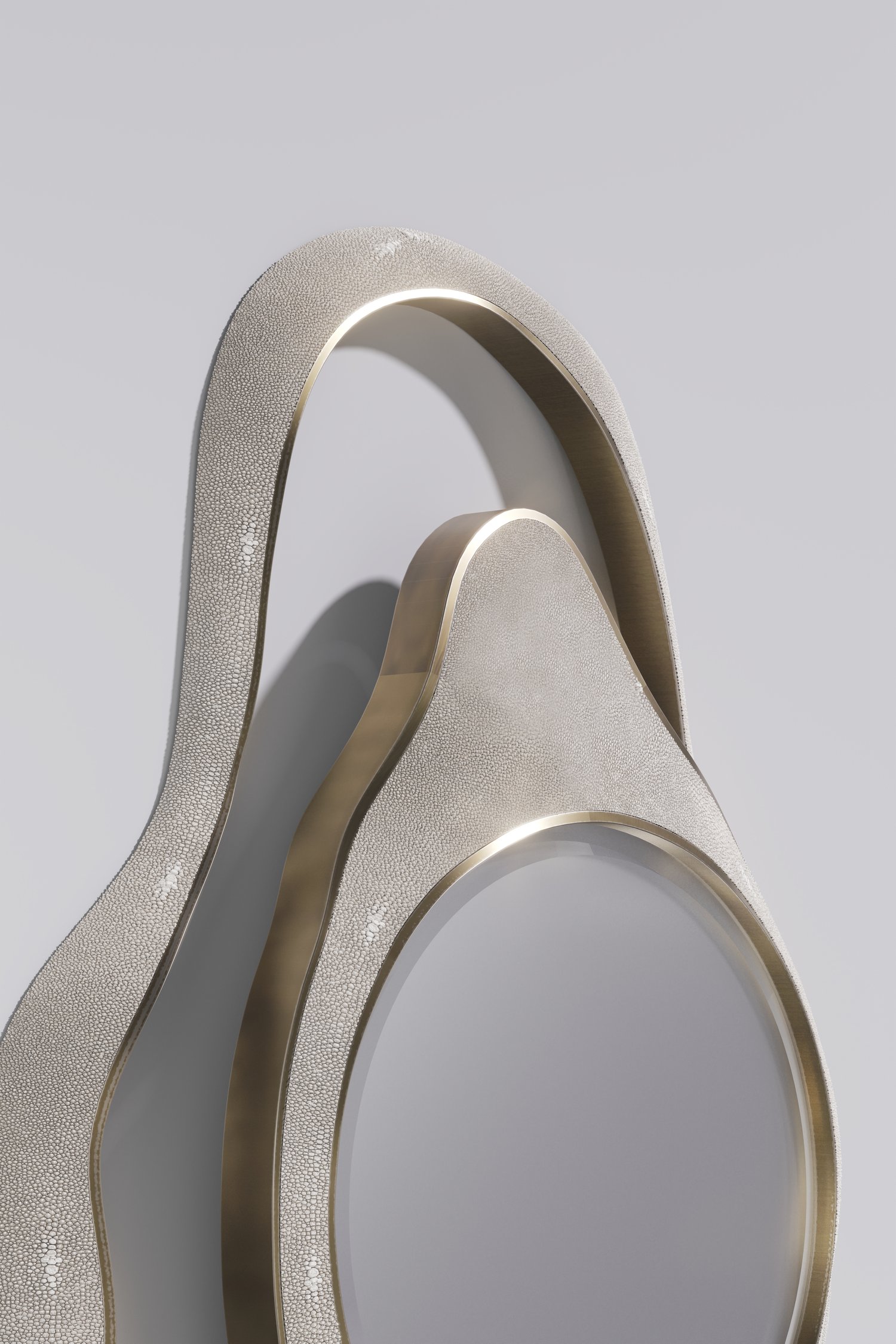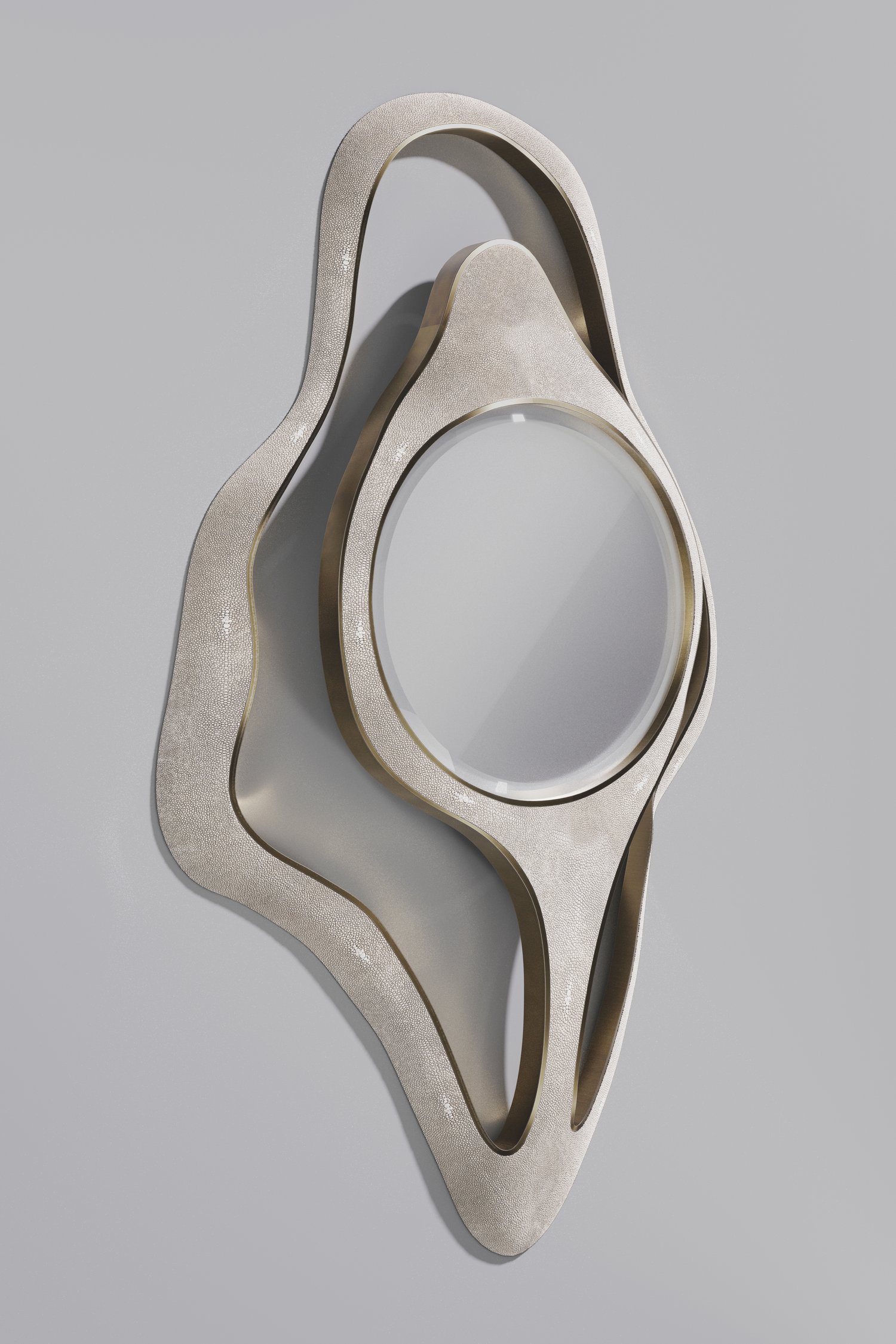 The Suspended mirror by R&Y Augousti is a dramatic and sculptural piece. The piece can be hung on the vertical or horizontal, and its ornate details cast subtle shadows on the wall. This piece is inlaid in a mixture of cream shagreen and bronze-patina brass. Custom color and sizing available on request.