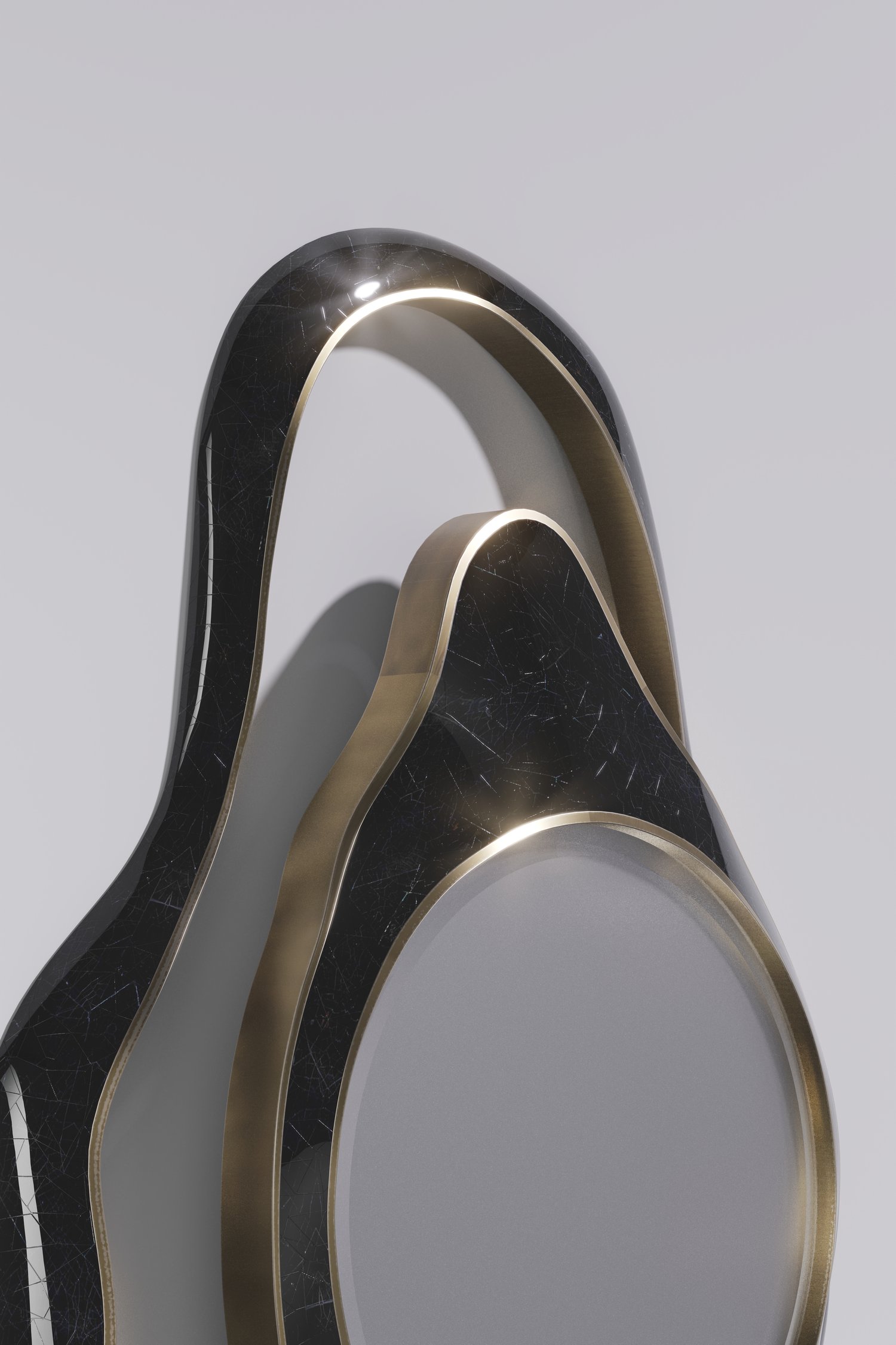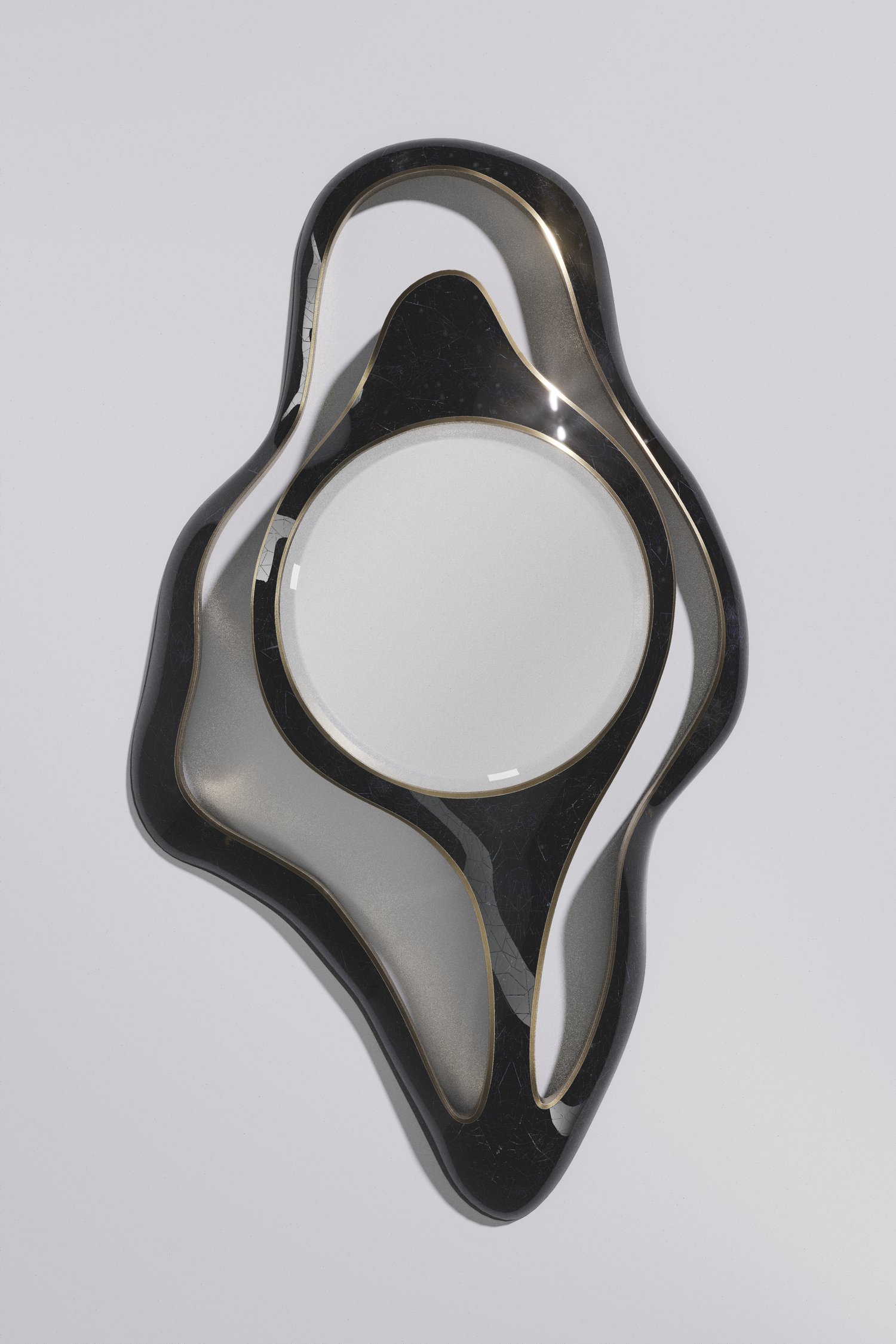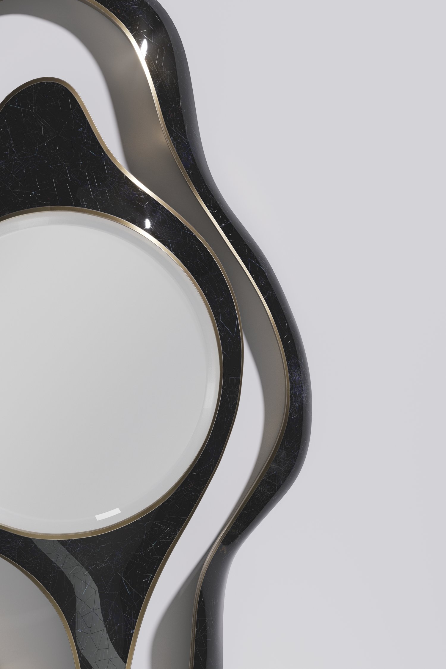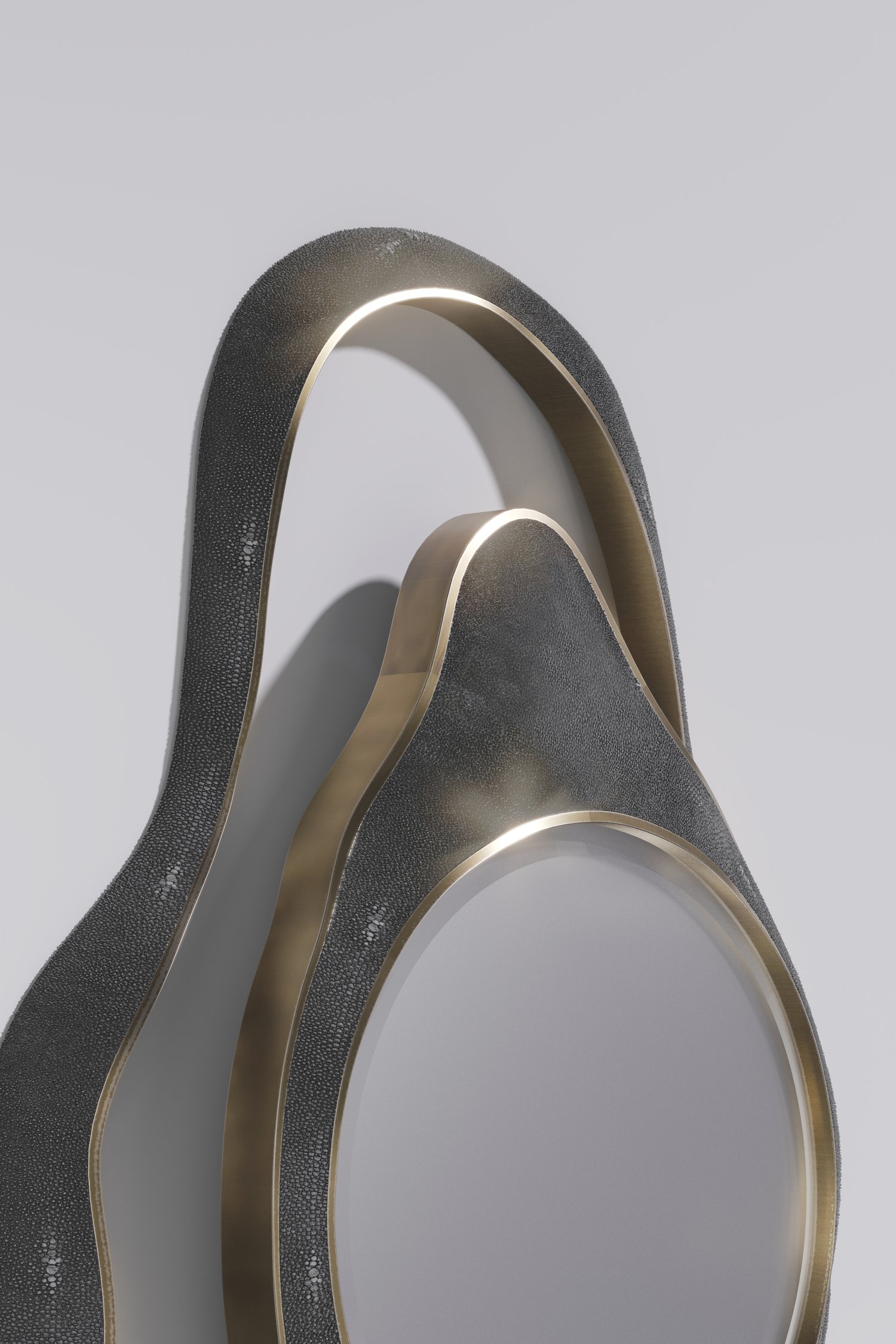 The Suspended mirror by R&Y Augousti is a dramatic and sculptural piece. The piece can be hung on the vertical or horizontal, and its ornate details cast subtle shadows on the wall. This piece is inlaid in a mixture of cream shagreen and bronze-patina brass. Custom color and sizing available on request.