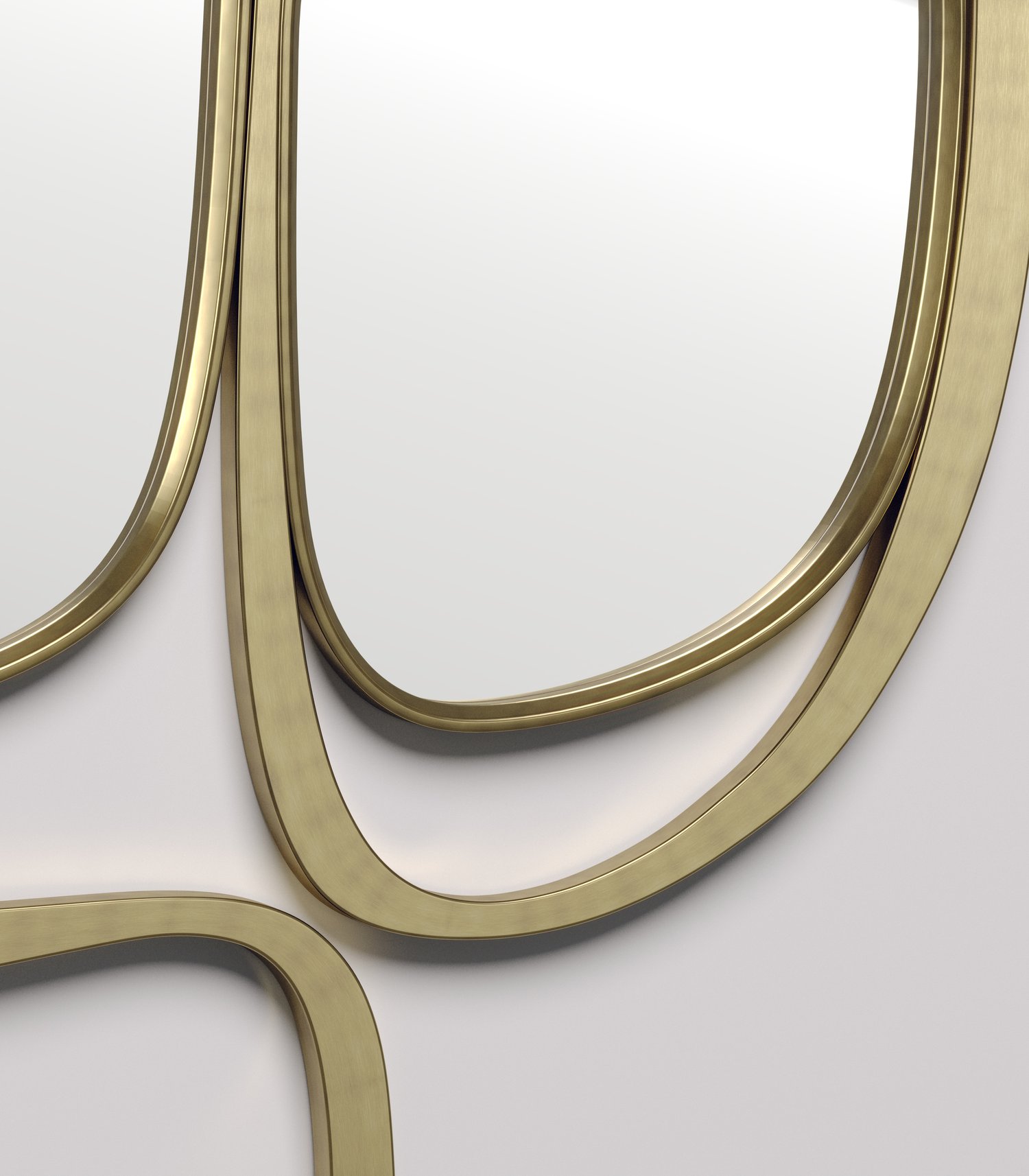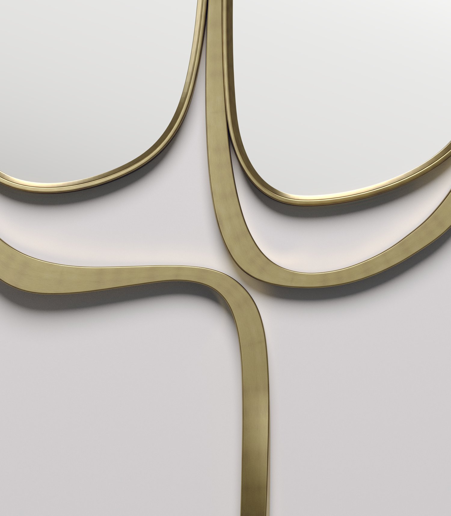 The Ginko mirror by R & Y Augousti is an elegant and versatile piece. The piece is both sculptural and graphic with its organic shape and floating cut out mirror detail. The piece is inlaid completely in bronze patina brass. Part of the Ginko capsule.