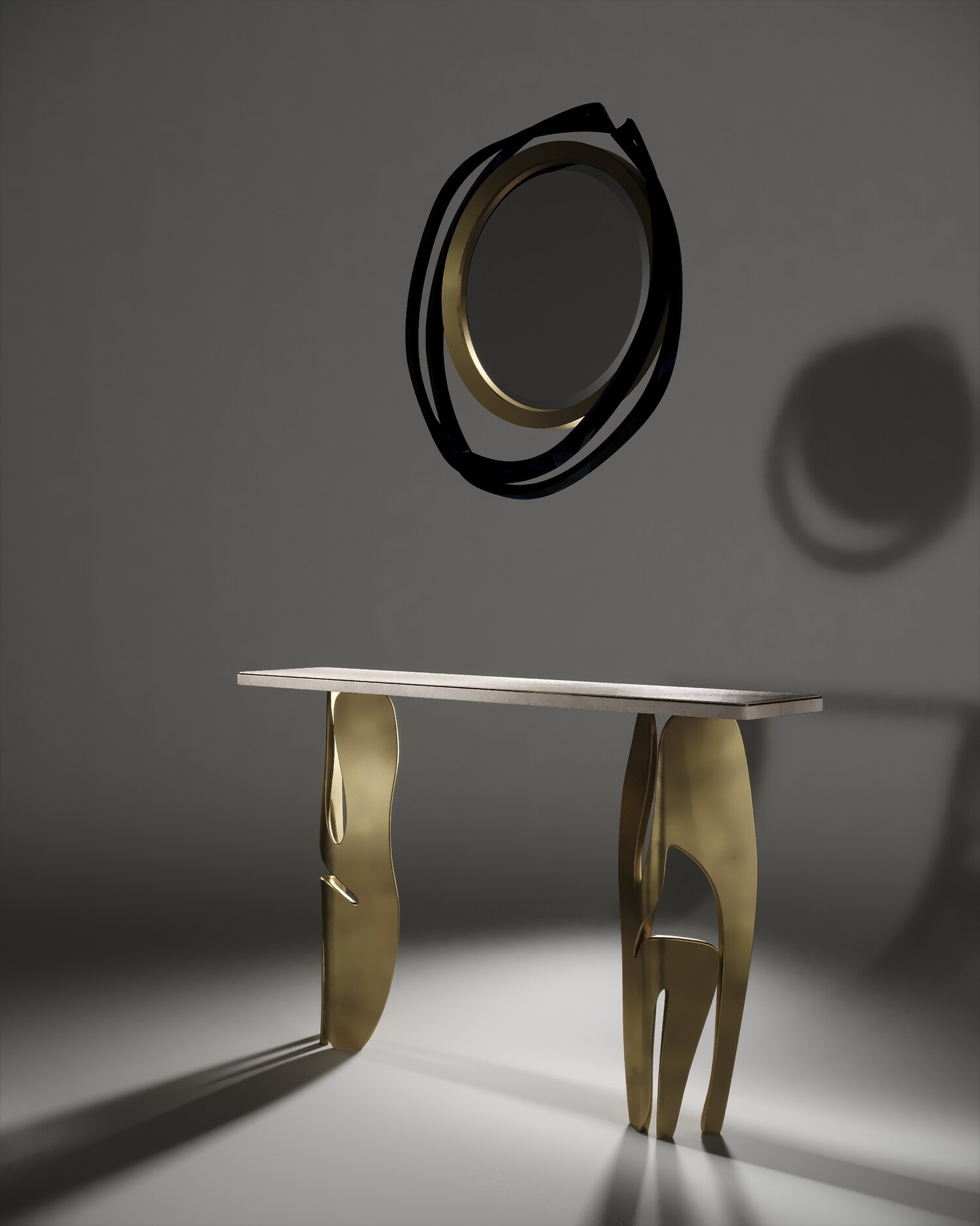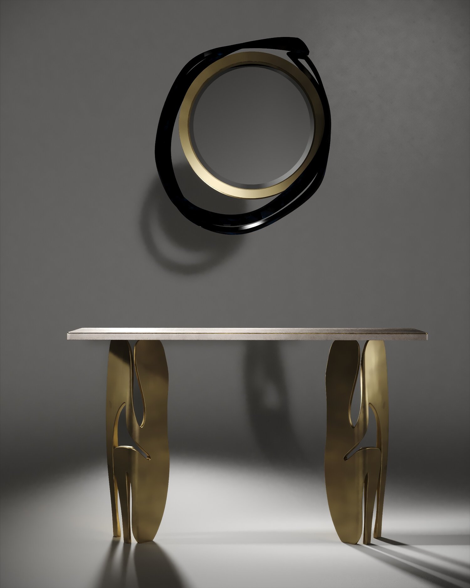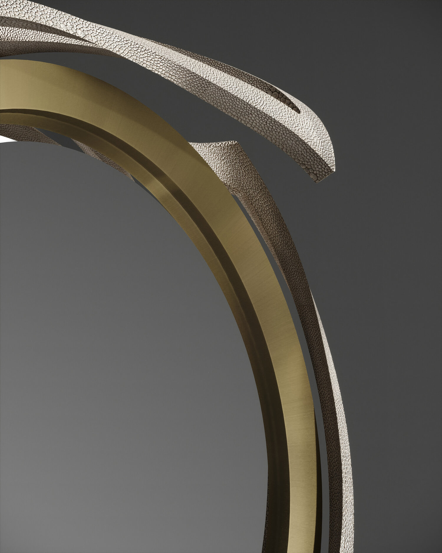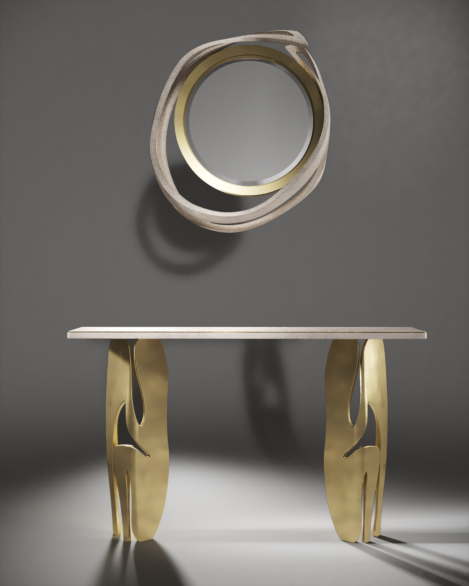 The Metropolis II mirror by R&Y Augousti in cream Shagreen and bronze-patina brass, is a sculptural piece of theirs and is an extremely versatile mirror. Due to the fixtures at the back this piece can be hung in three different ways creating a different expression each time with its amorphous and poetic shape. Available other finishes and a medium size.