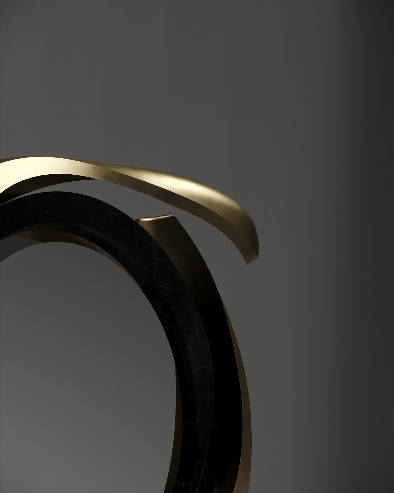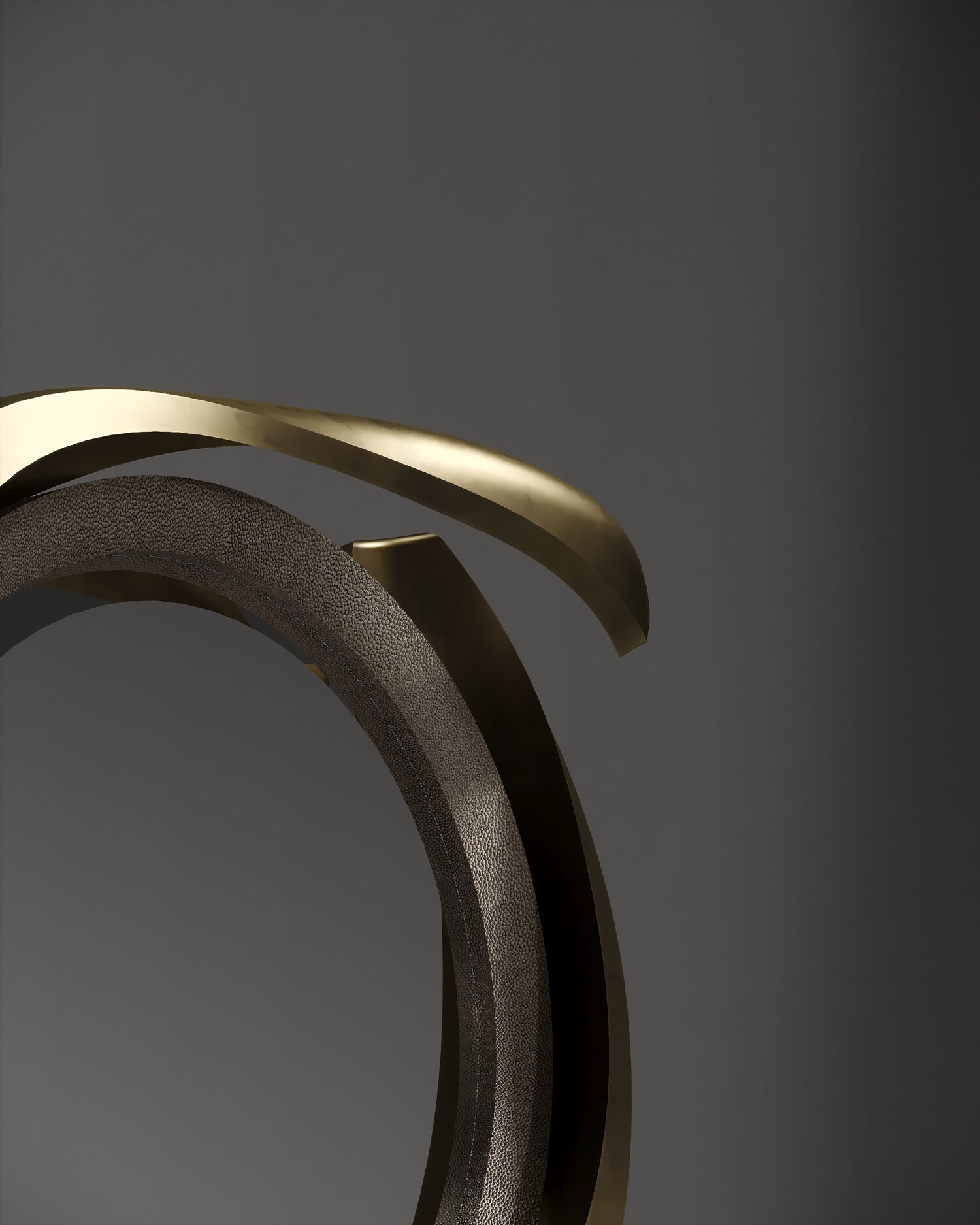 The Metropolis II mirror by R&Y Augousti in cream Shagreen and bronze-patina brass, is a sculptural piece of theirs and is an extremely versatile mirror. Due to the fixtures at the back this piece can be hung in three different ways creating a different expression each time with its amorphous and poetic shape. Available other finishes and a large size.